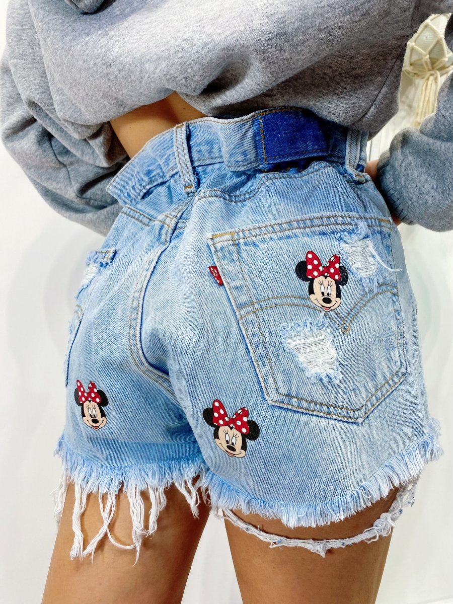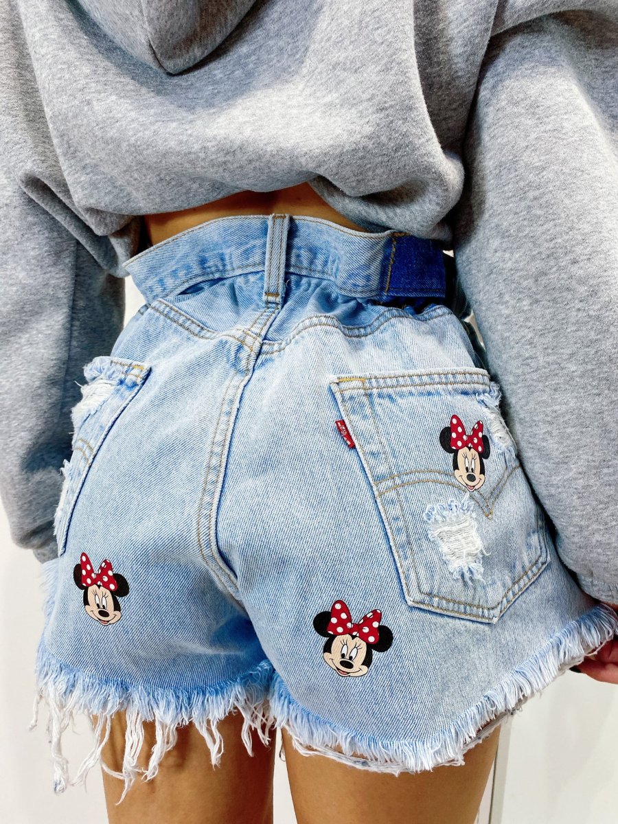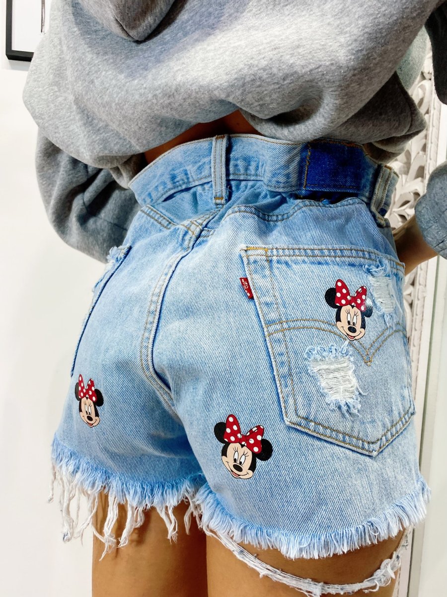 Short Vintage Levi’s alta qualità con strappi e stampa topolina.