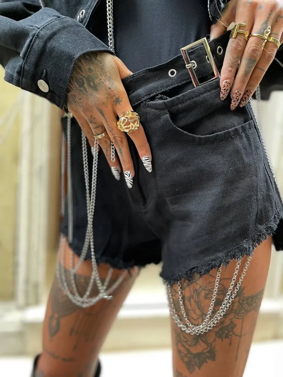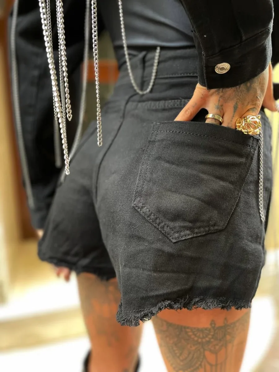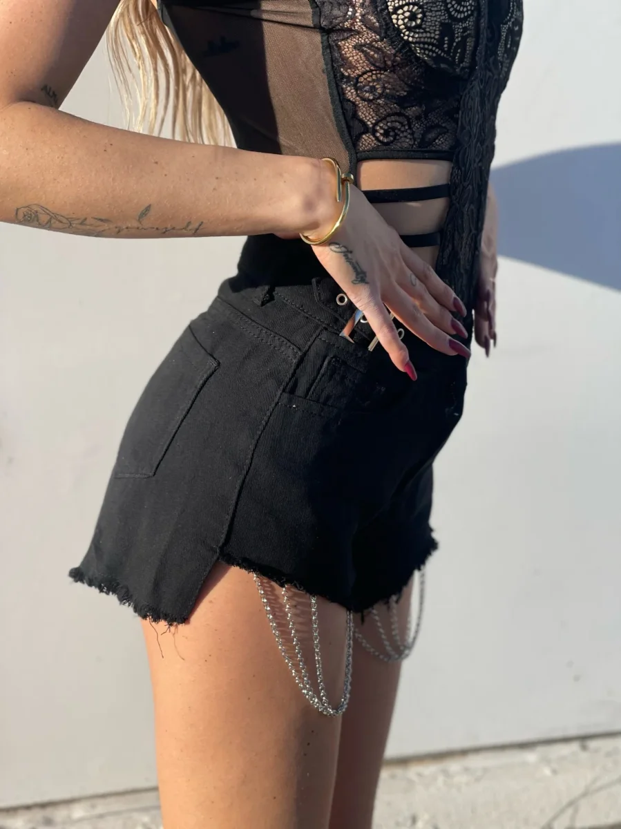 Particolarissimo Short in jeans nero con catenine argento e vita completamente regolabile con 4 diverse larghezze