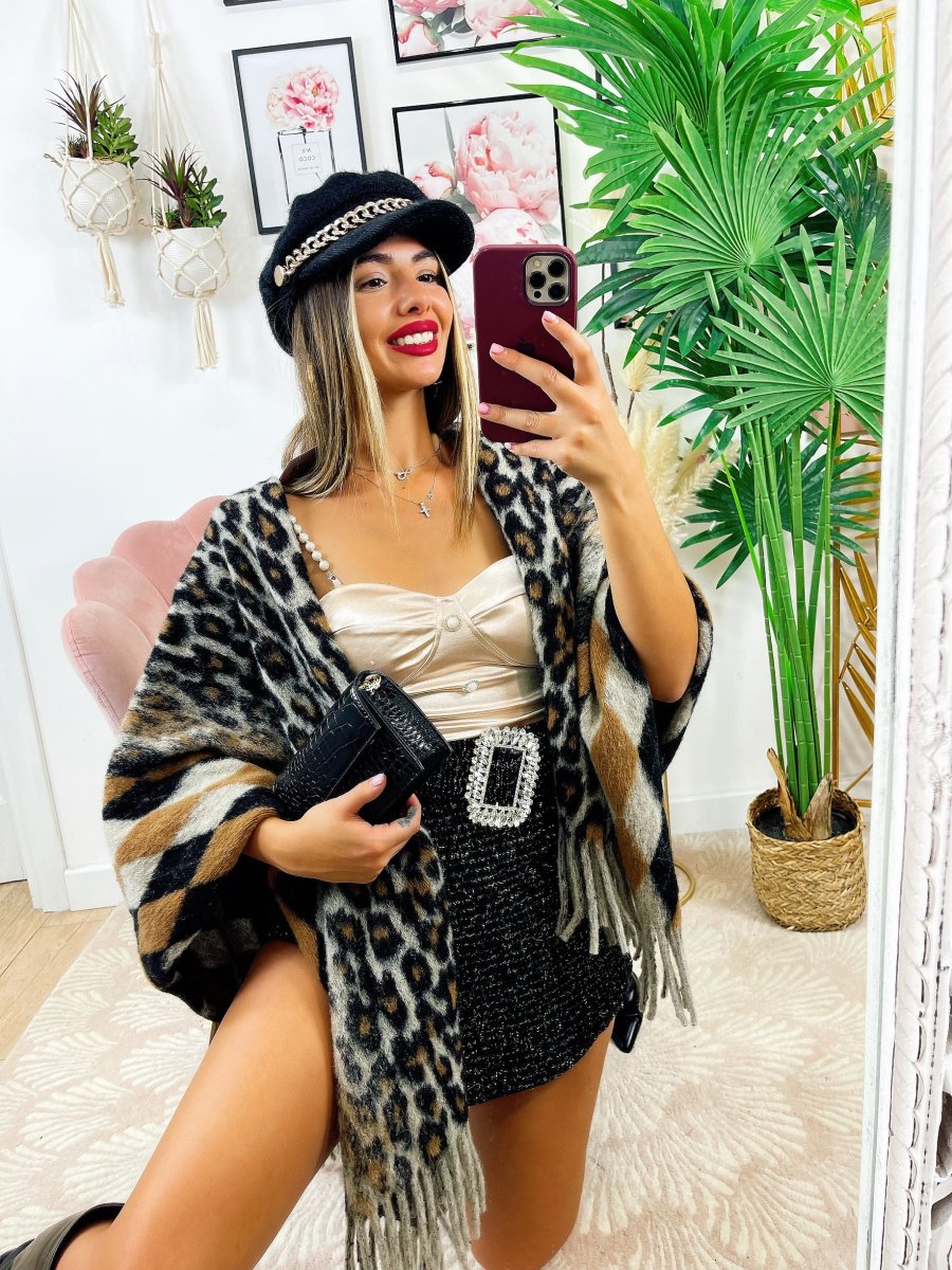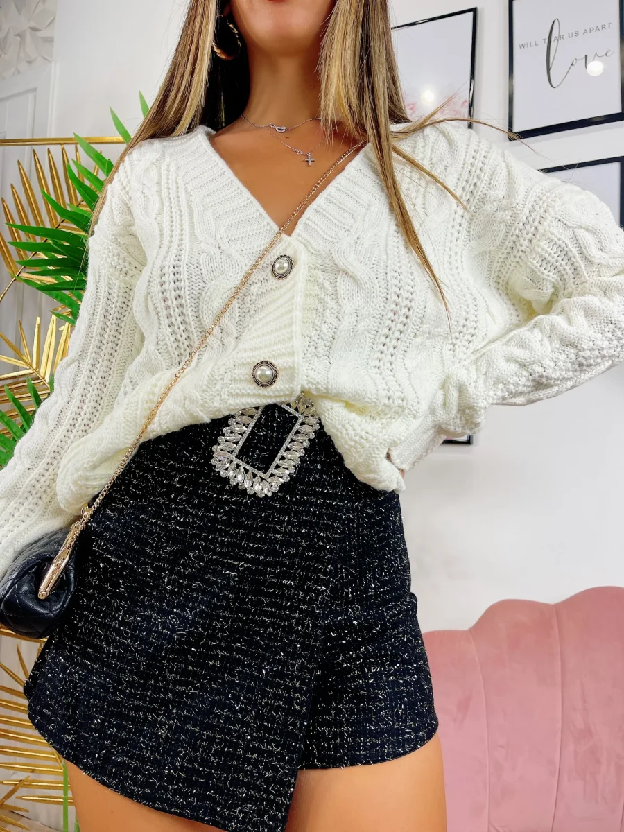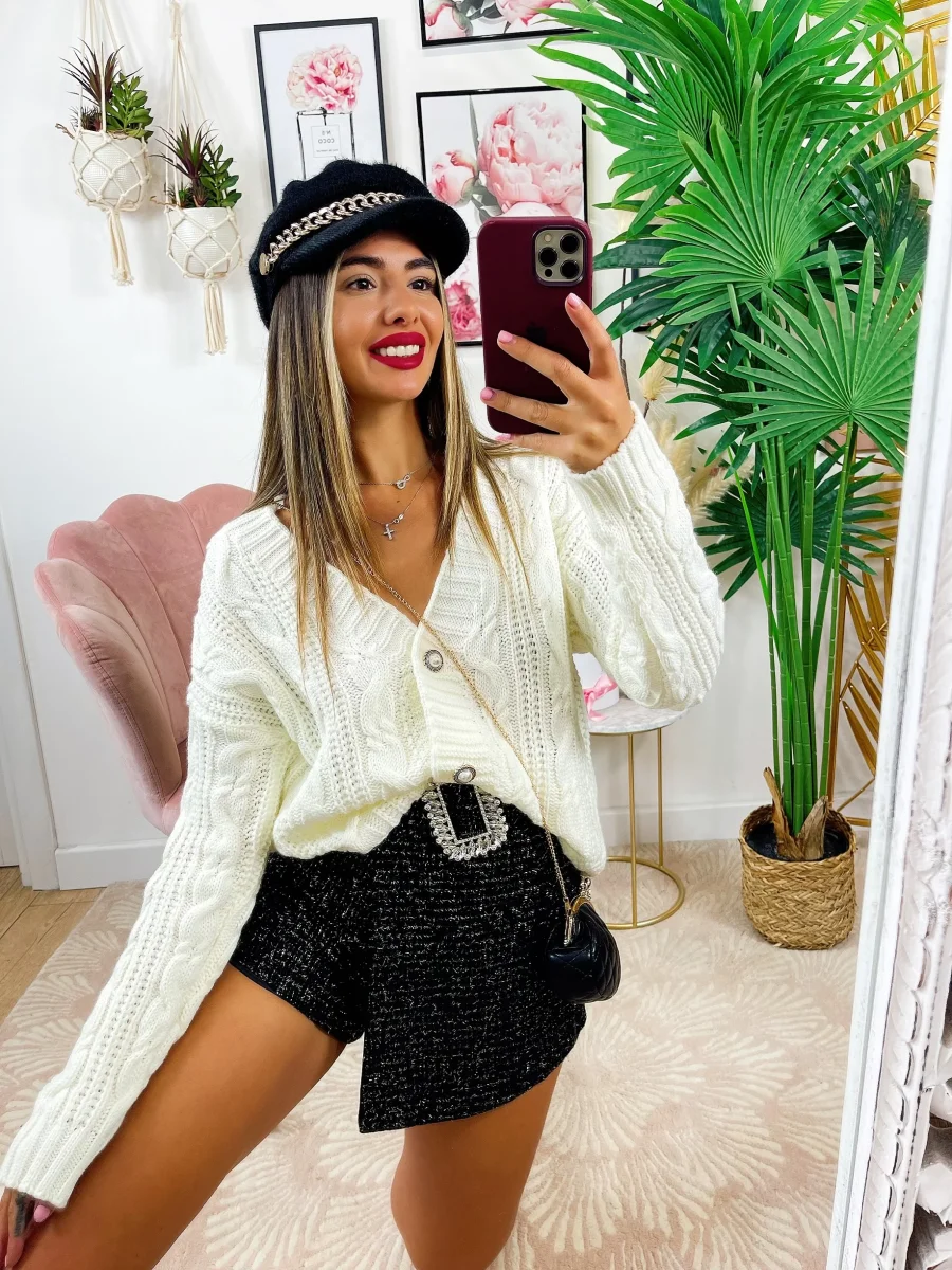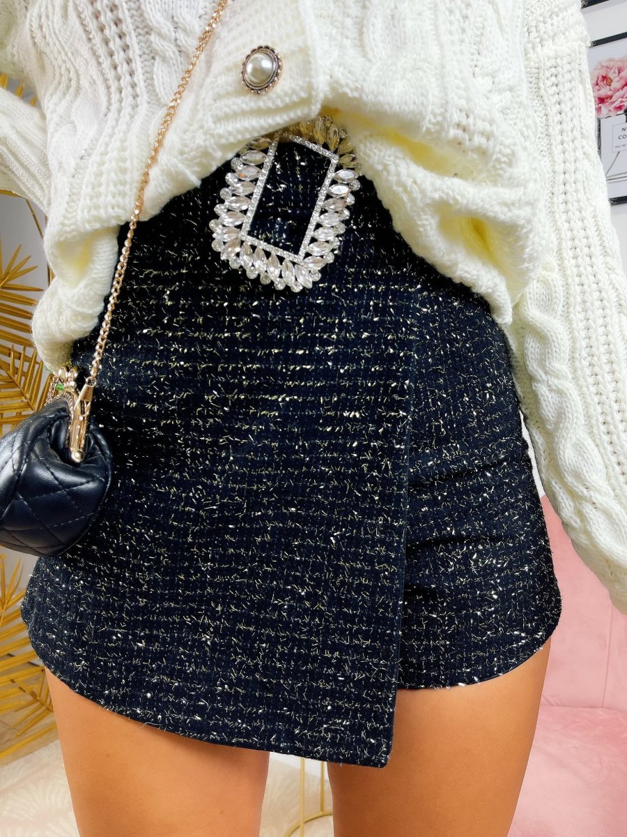 Short glitterato con cintura gioiello, leggermente elasticizzato, vestibilità piccola.