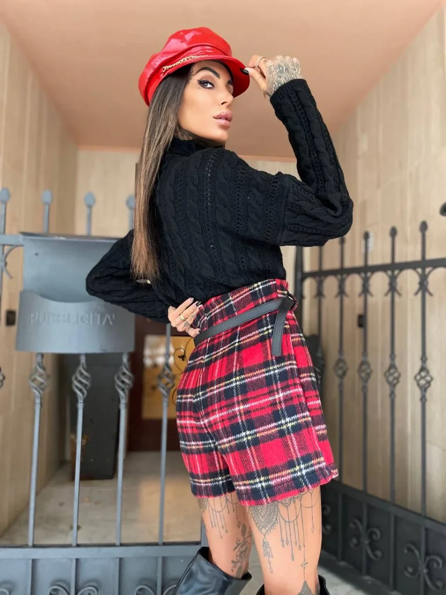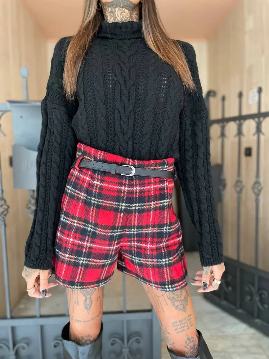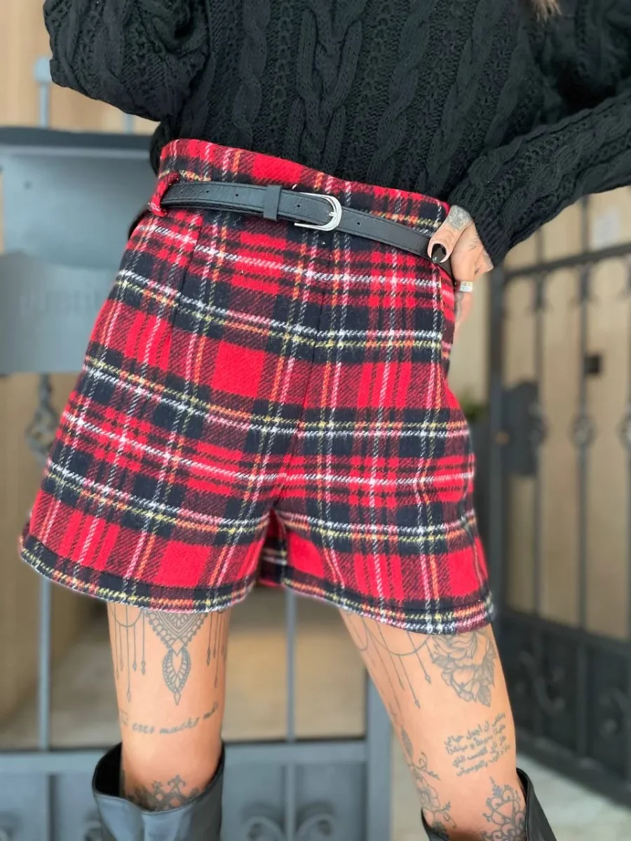 Short in tweed scozzese foderato con cinturino nero incluso