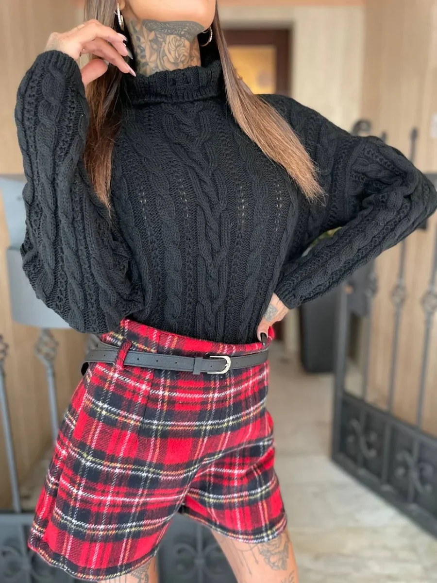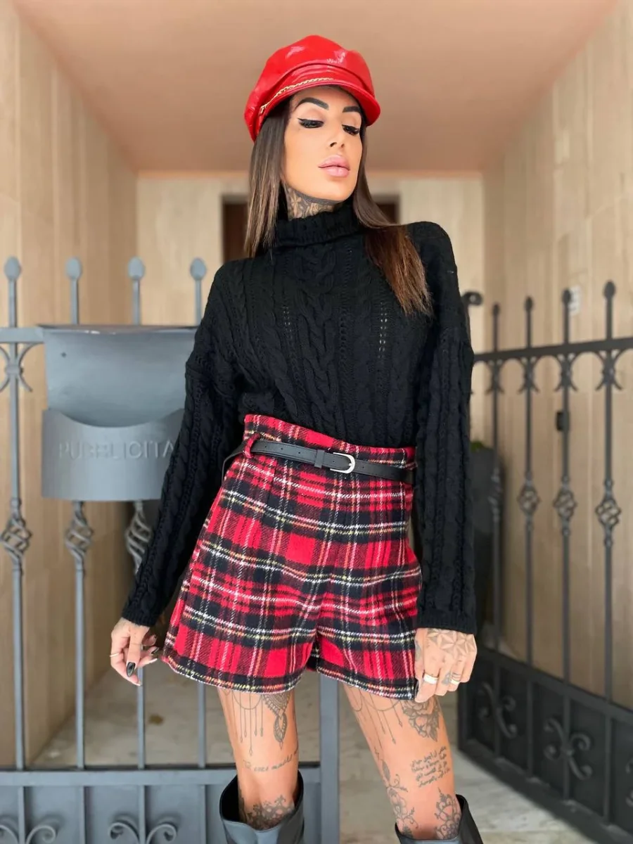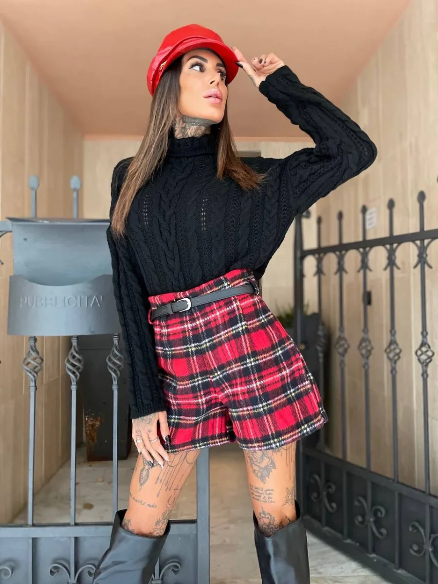 Short in tweed scozzese foderato con cinturino nero incluso