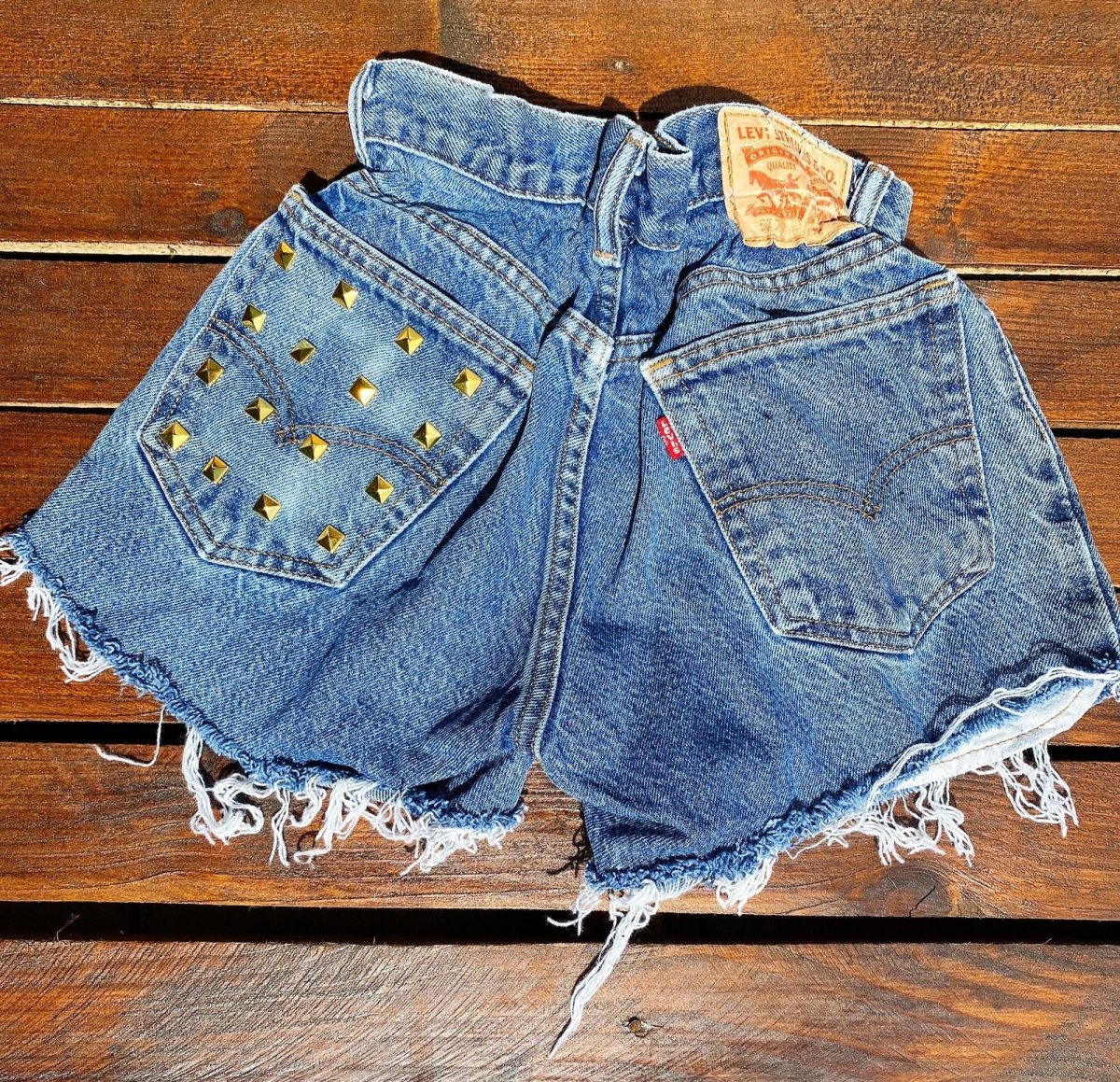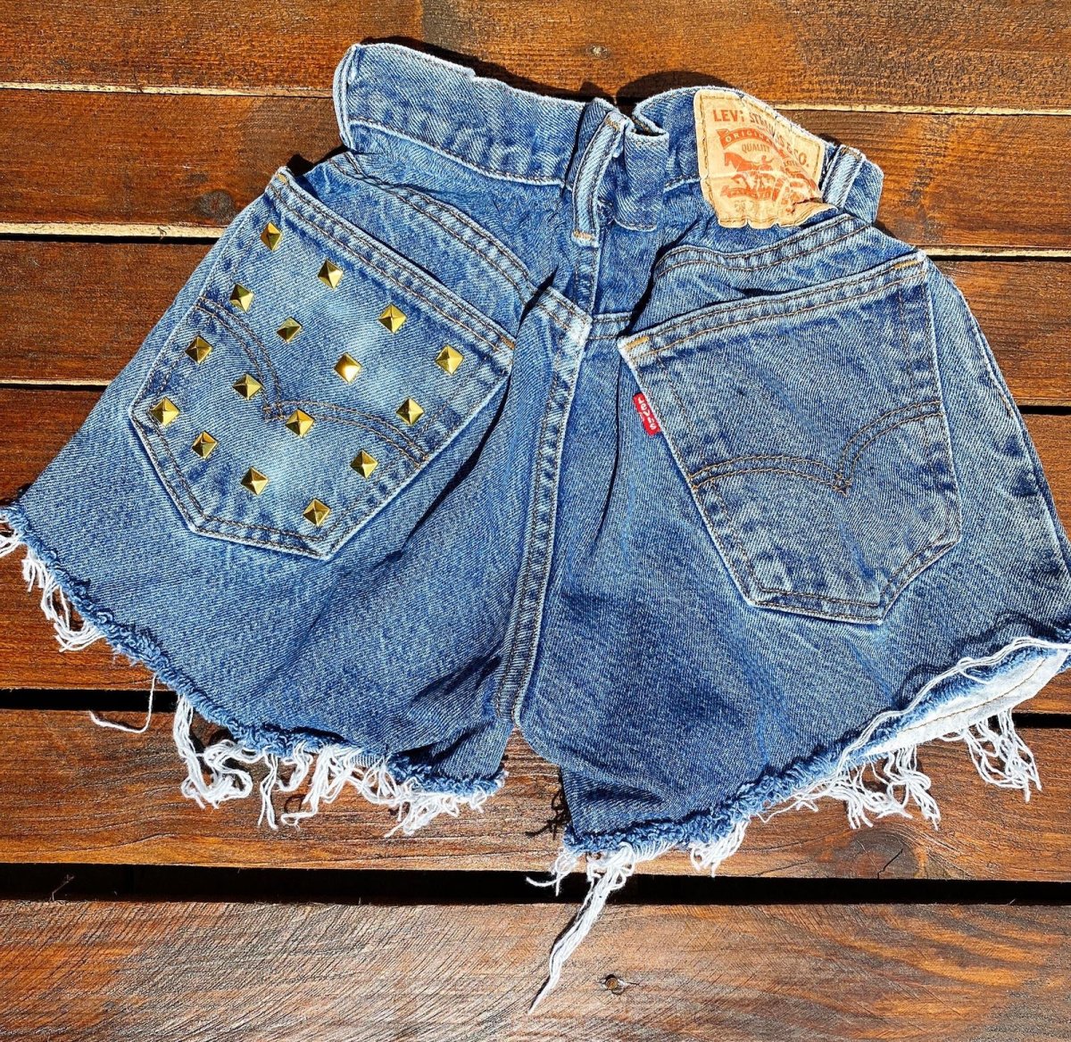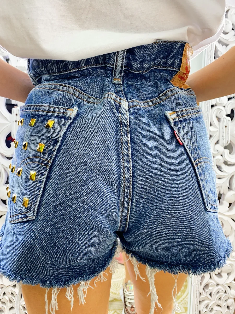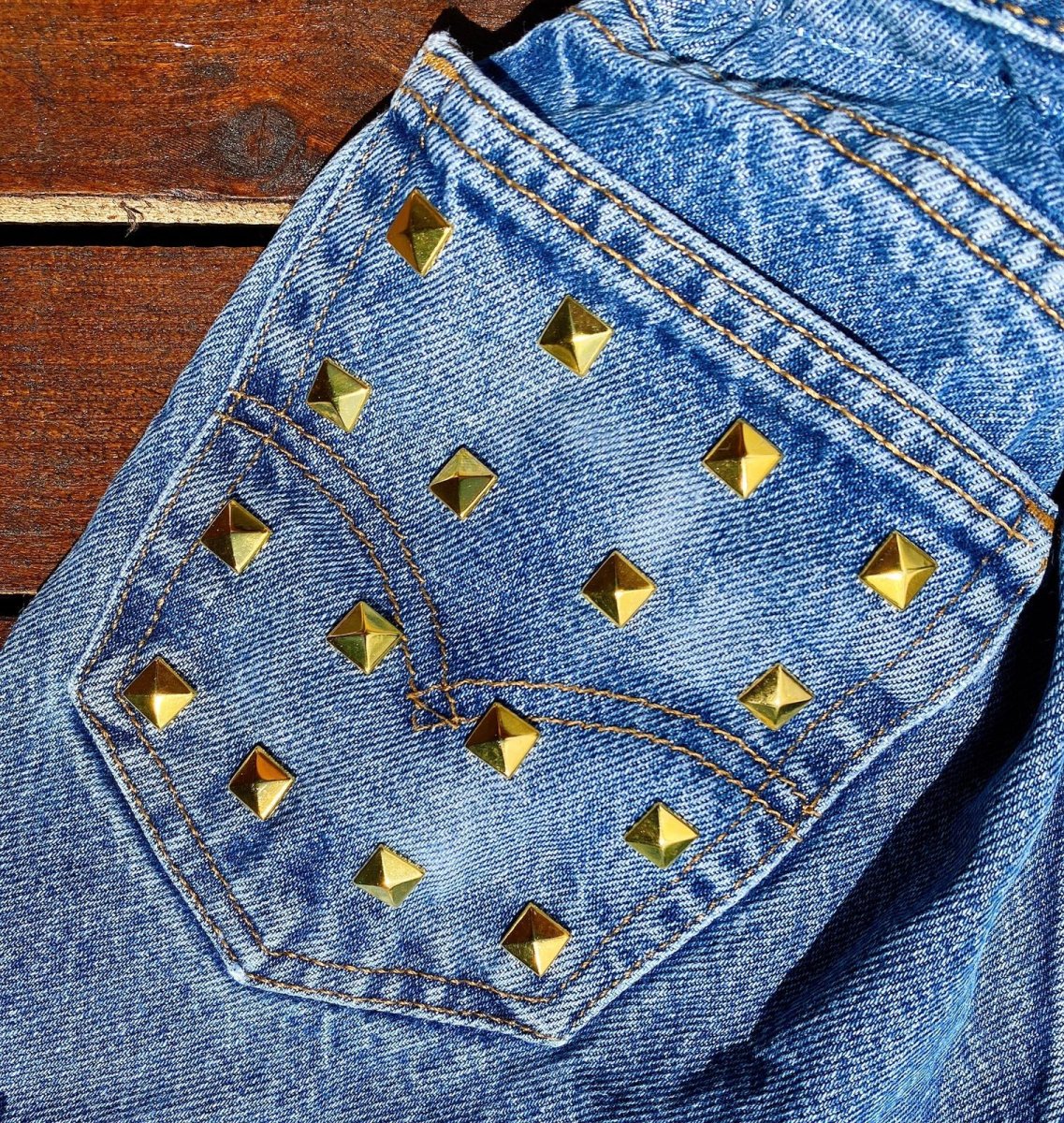 Jeans vintage con borchie sulla tasca lavorati a mano. Considerarsi pezzi unici poichè interamente Personalizzati. Lievi differenze rispetto alla foto ne denotano l’unicità e la sua completa lavorazione handmade!