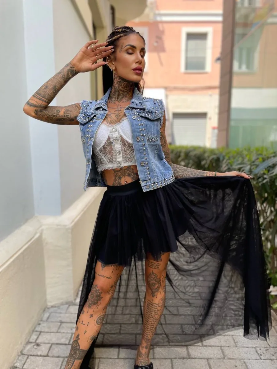 Smanicato in jeans con borchie argento e nero.