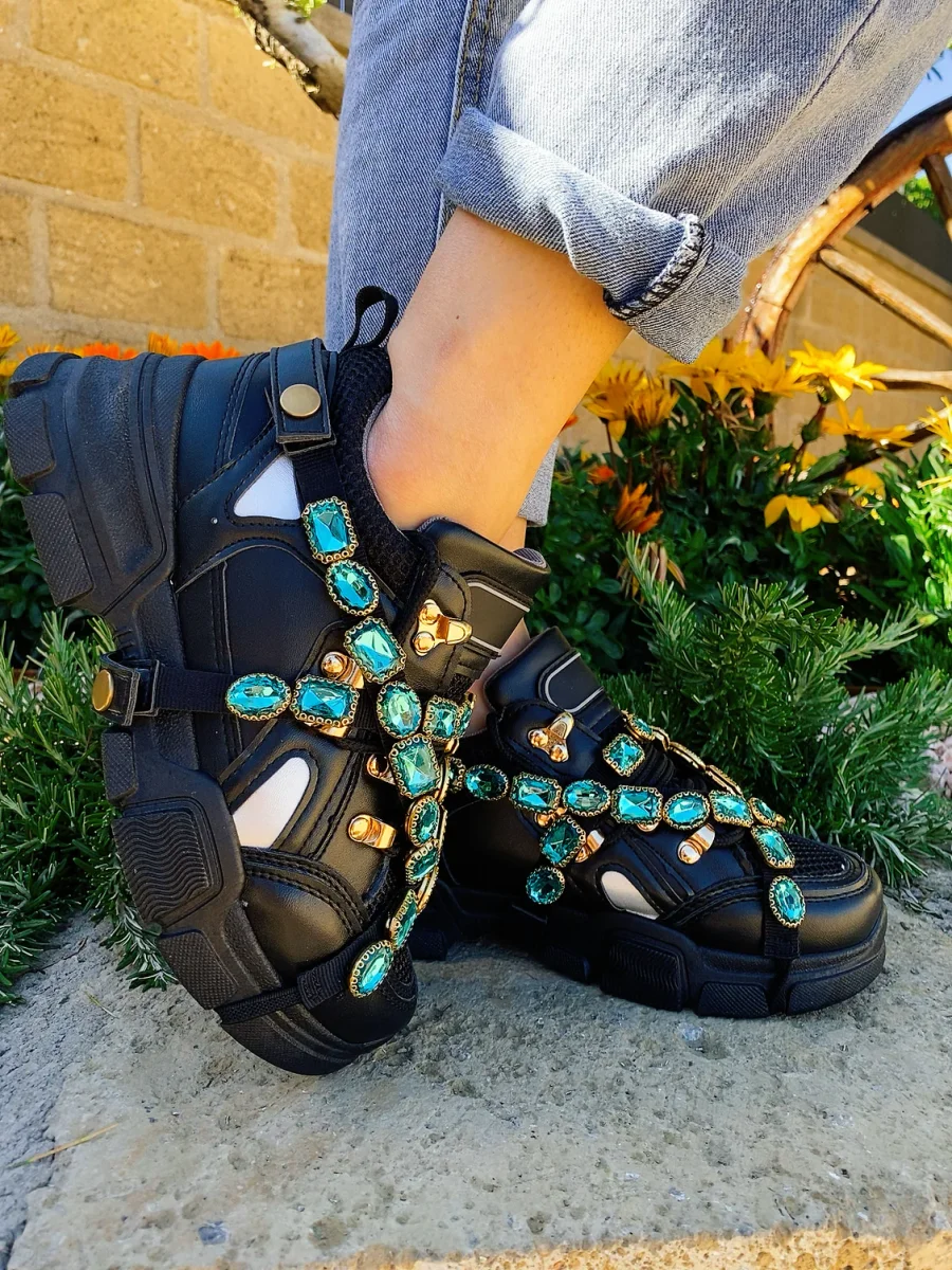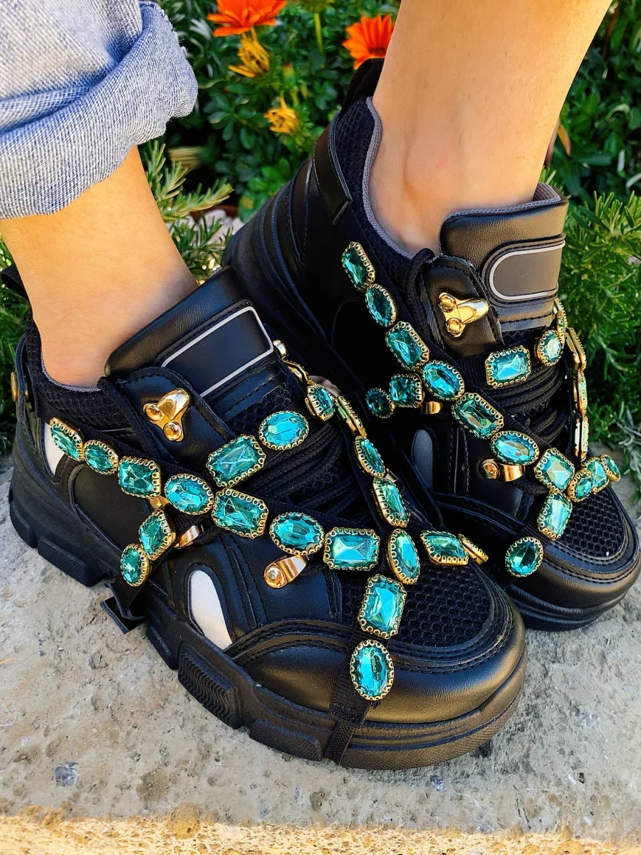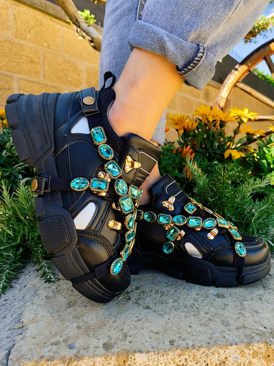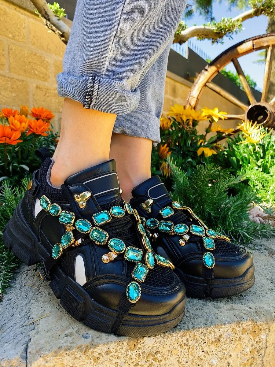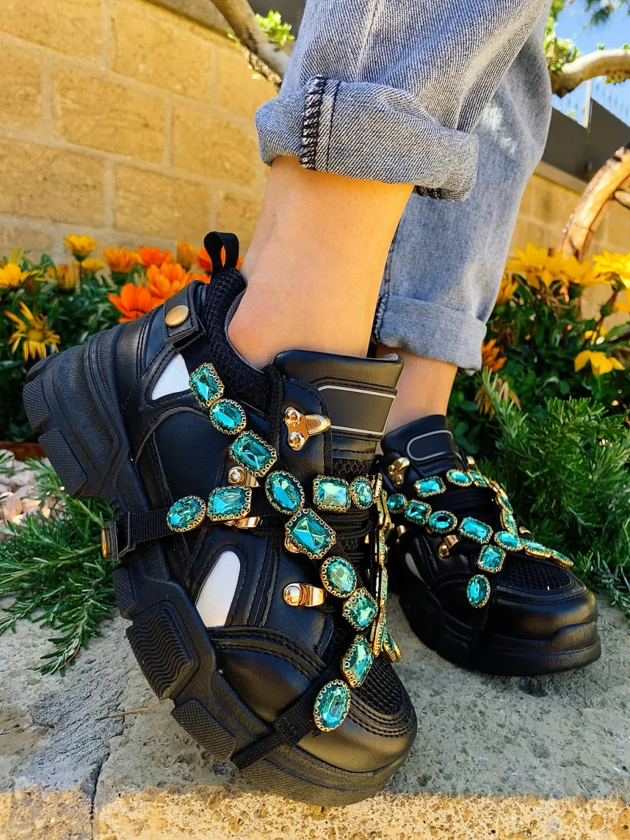 Le sneakers più trendy del momento. Bianche con dettagli in rilievo di strass. Perfette per gli outfit da giorno