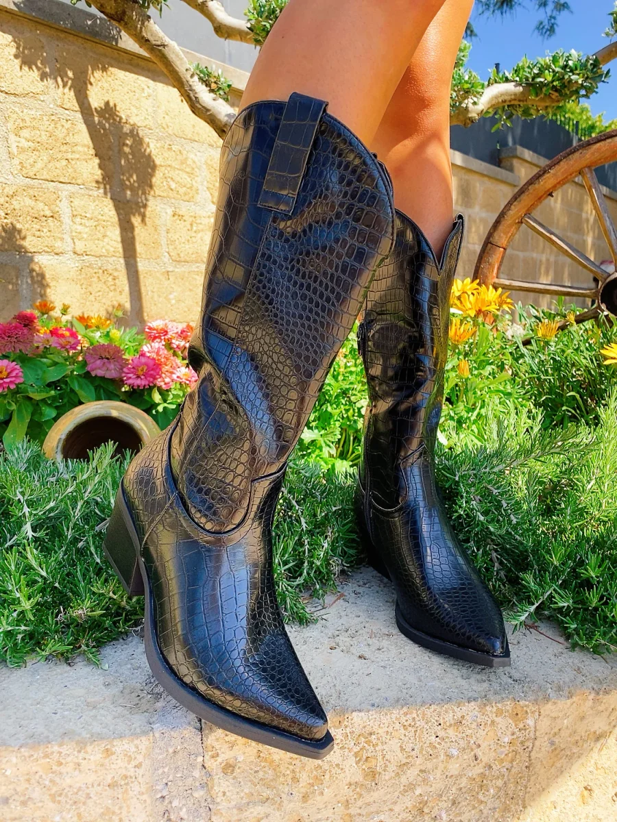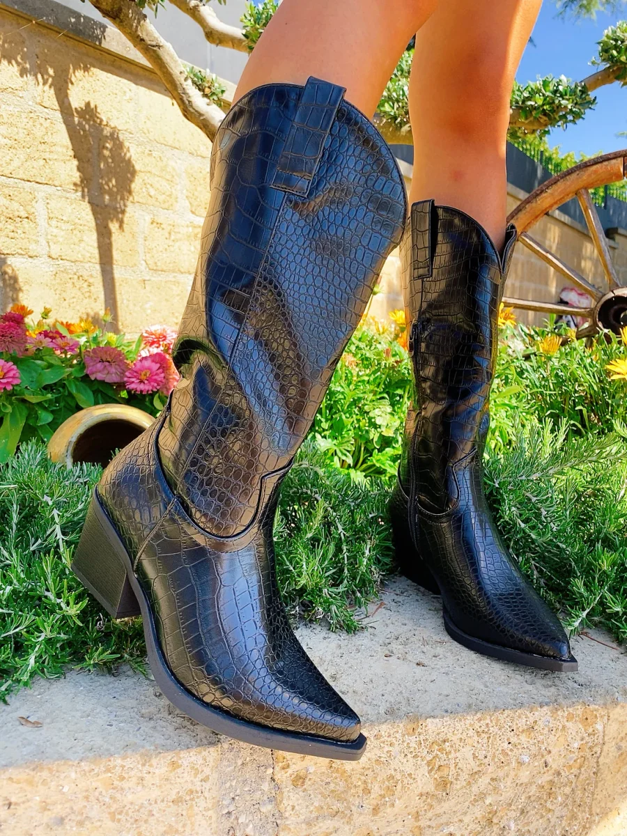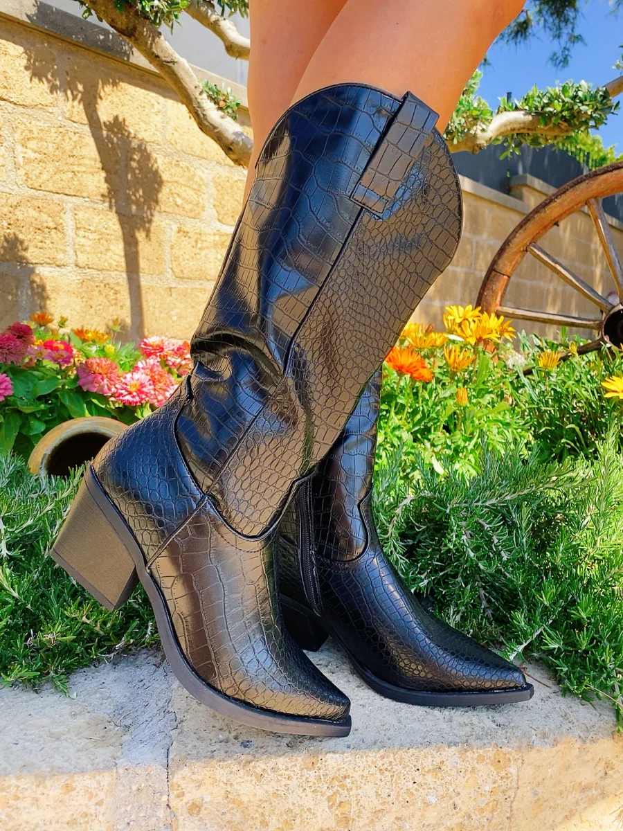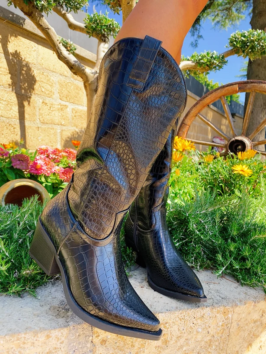 Stivale medio alto effetto croco rigido ma molto comodo. Calzata regolare