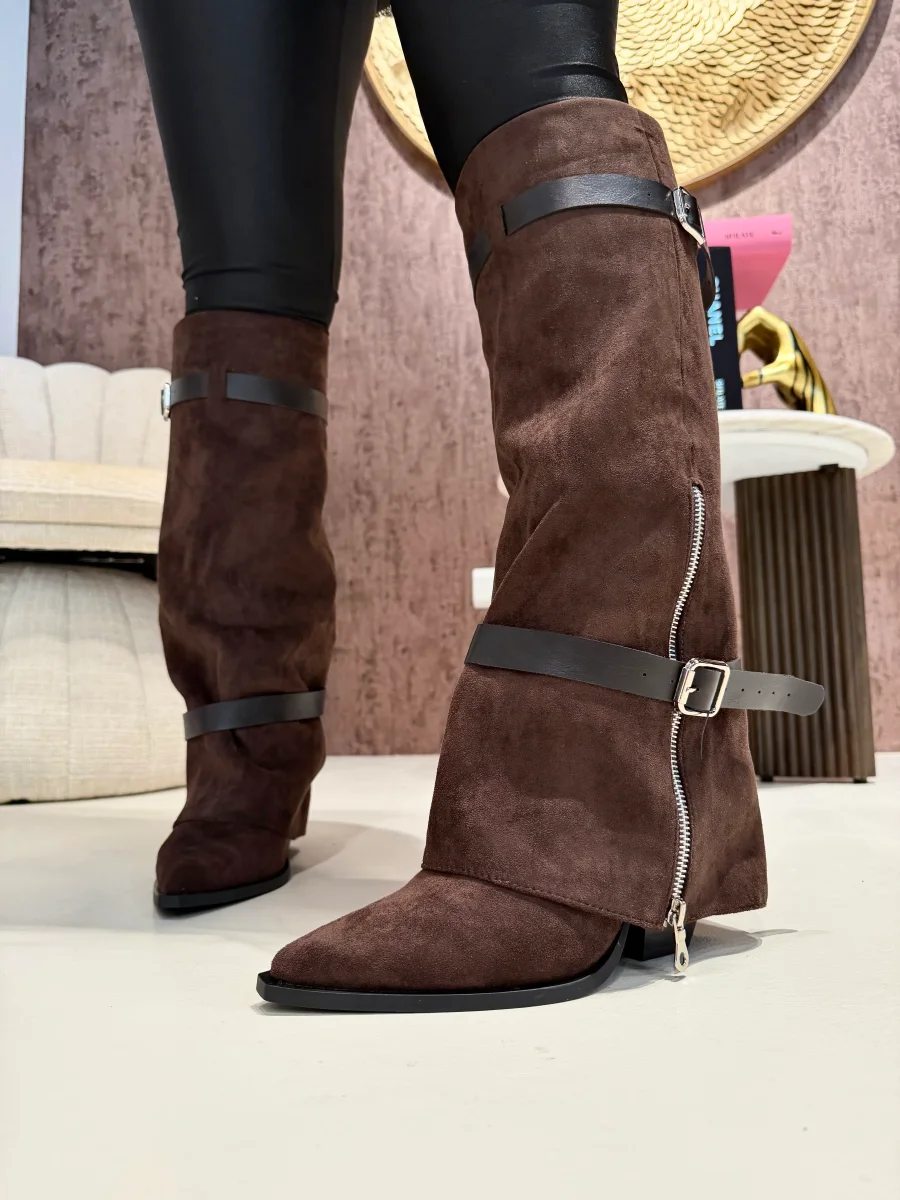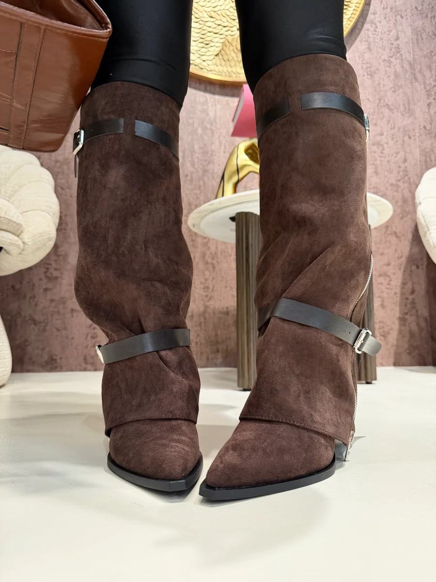 Lasciati conquistare dal fascino western del nostro Stivale Texas Choco. Realizzato in morbido ecopelle scamosciata color cioccolato, presenta una silhouette affusolata con punta slanciata e tacco geometrico che dona carattere e femminilità. Le doppie cinture con fibbie metalliche e la zip laterale a vista aggiungono un tocco grintoso e contemporaneo, perfetto per completare ogni look autunnale.