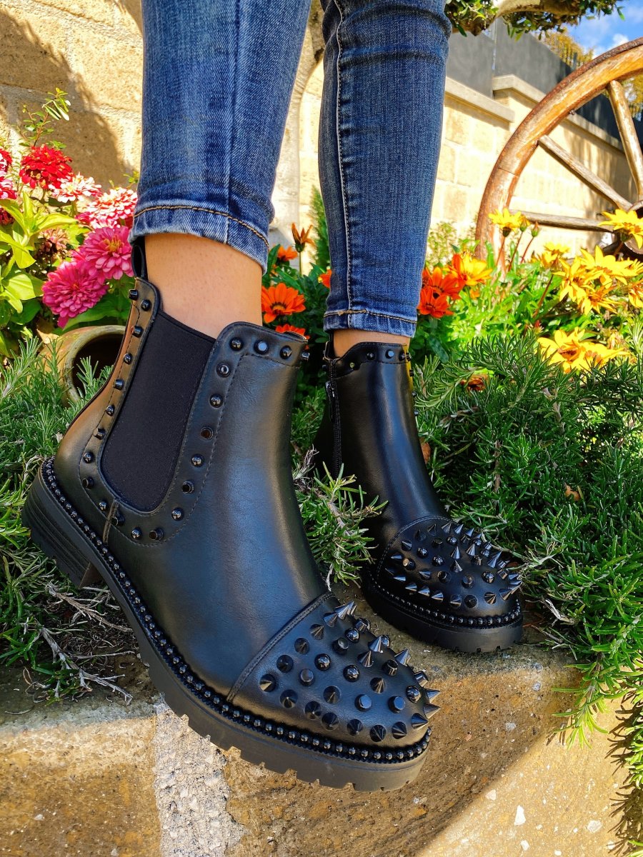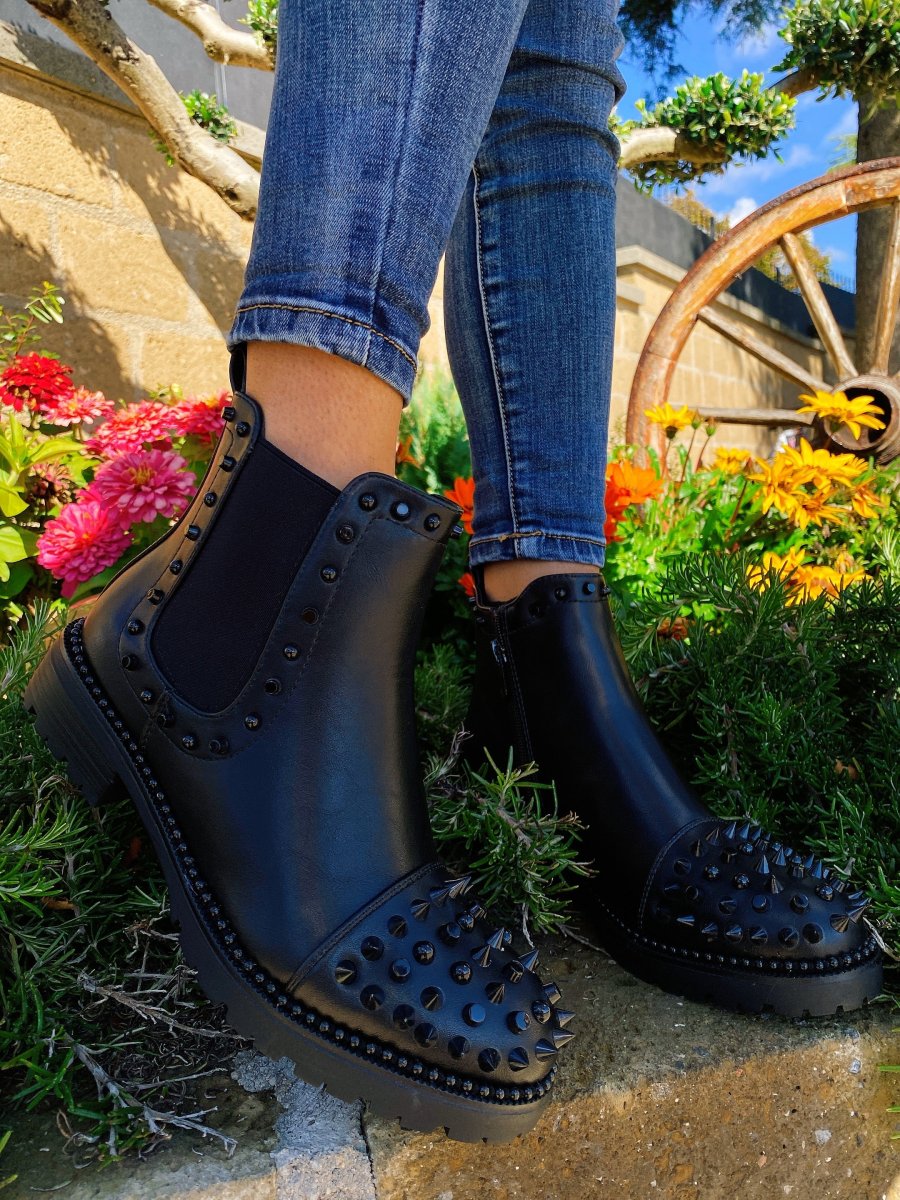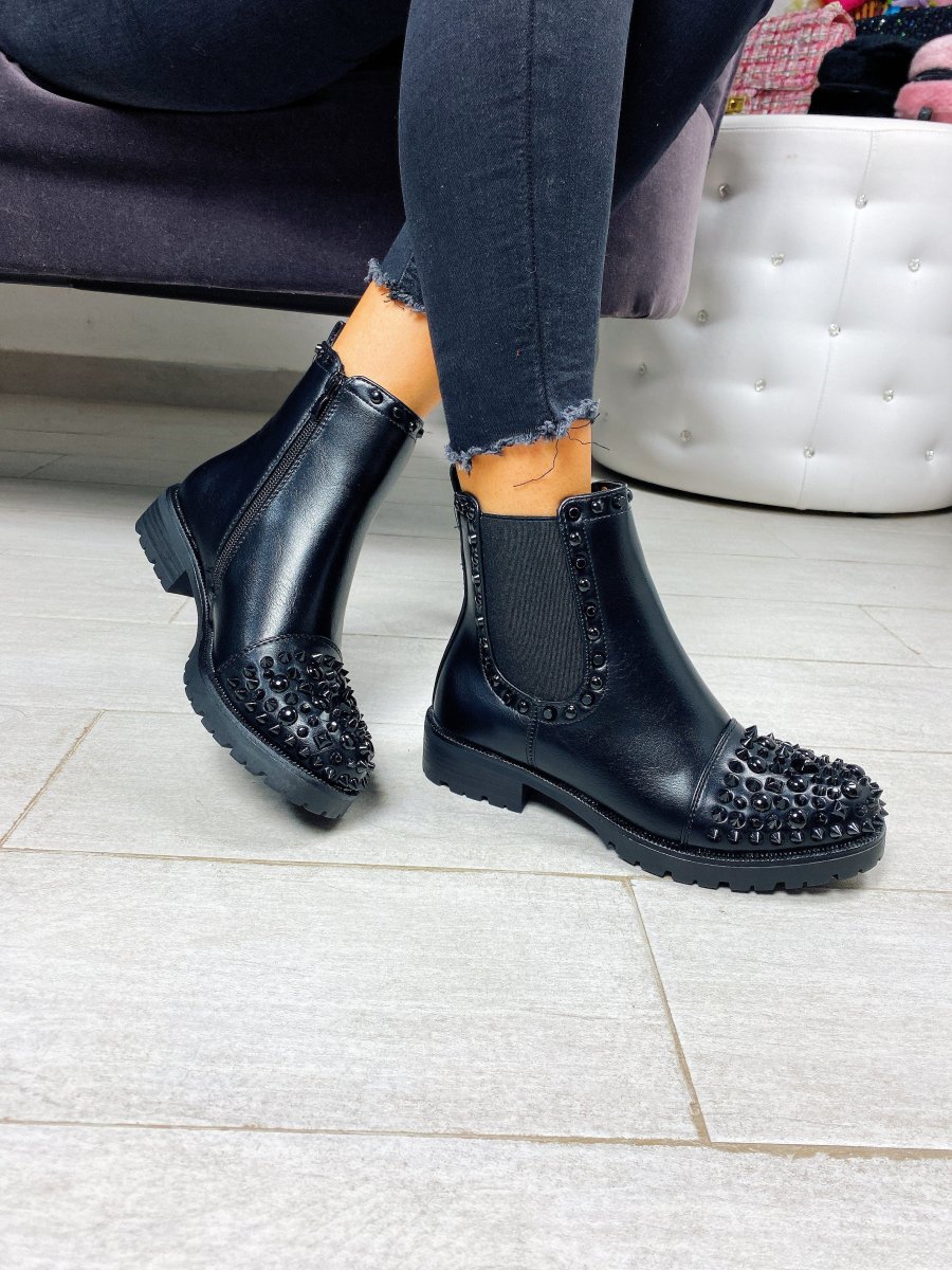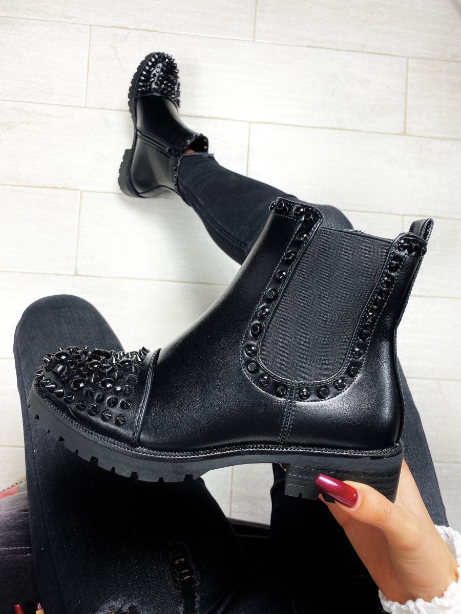 Stivaletto liscio dal tacco basso. Impreziosito da borchie nere tono su tono. Calzato regolare