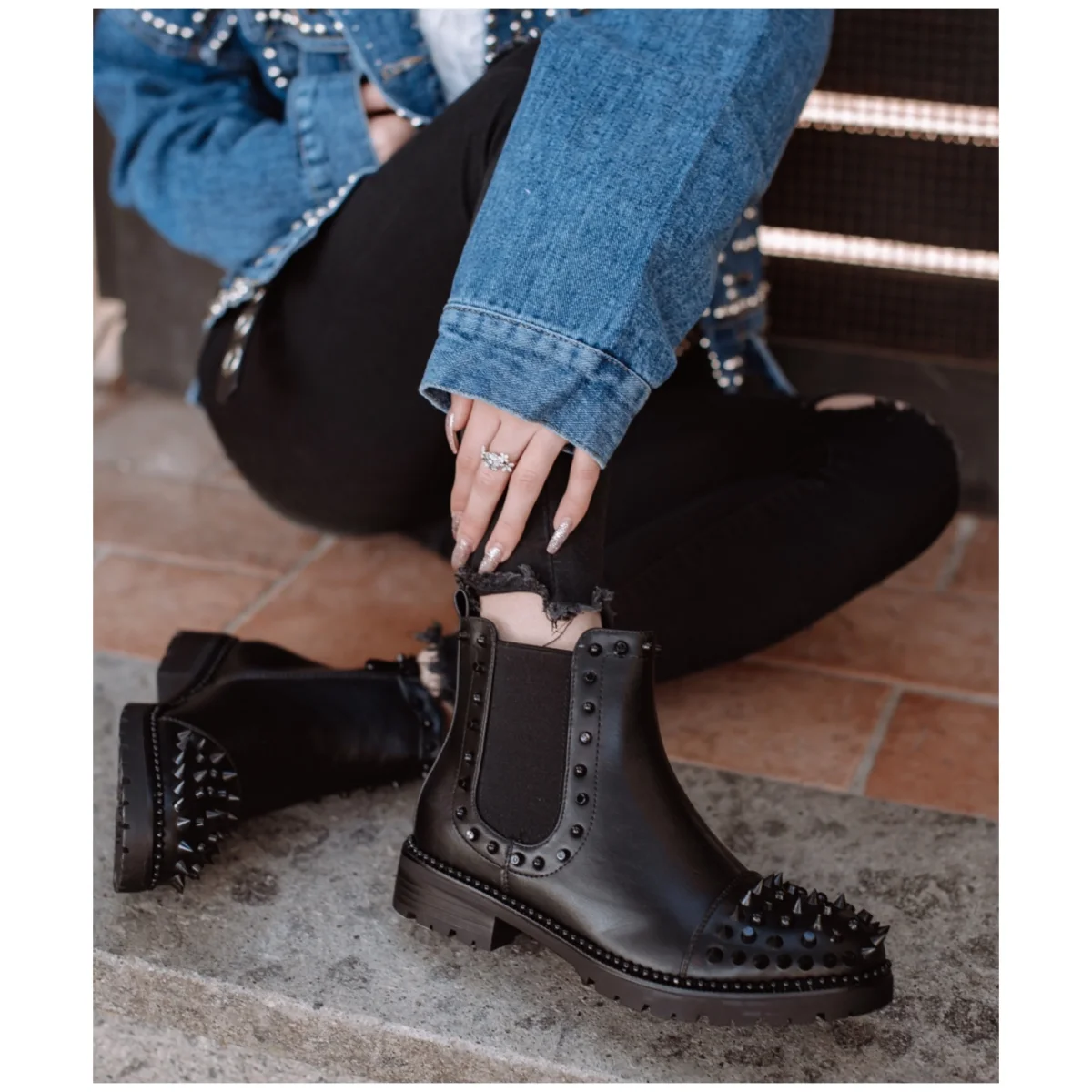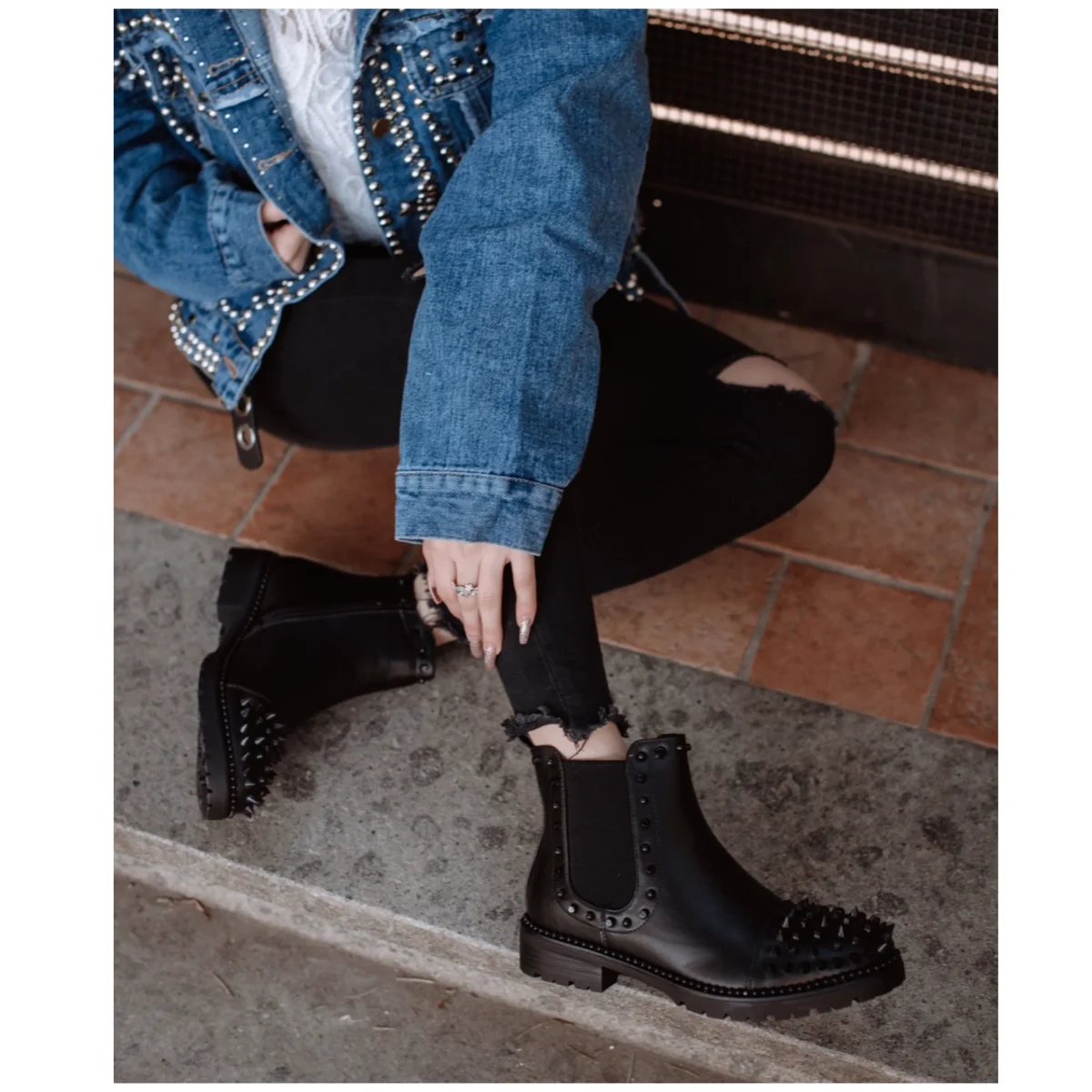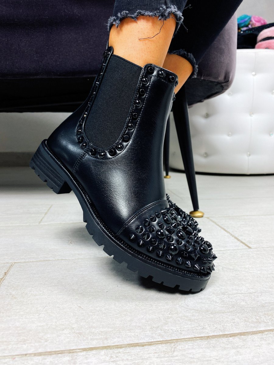 Stivaletto liscio dal tacco basso. Impreziosito da borchie nere tono su tono. Calzato regolare