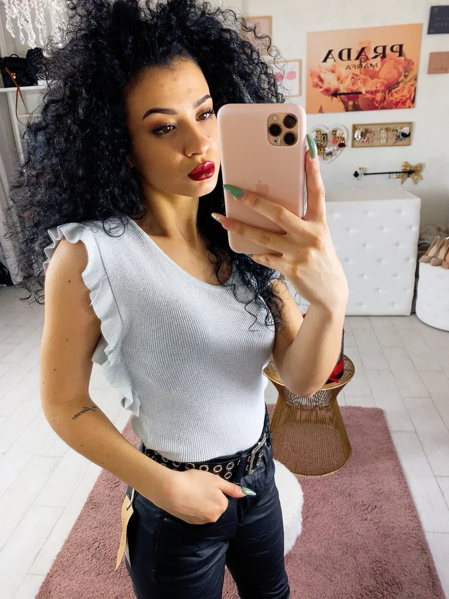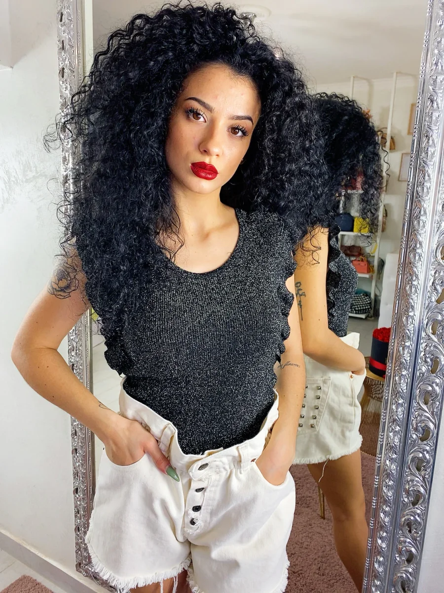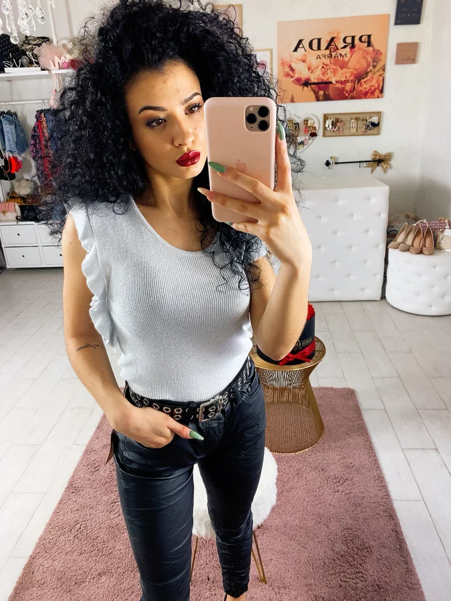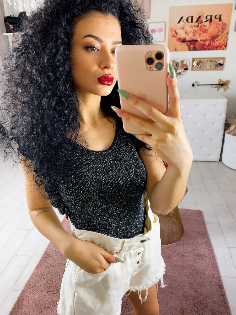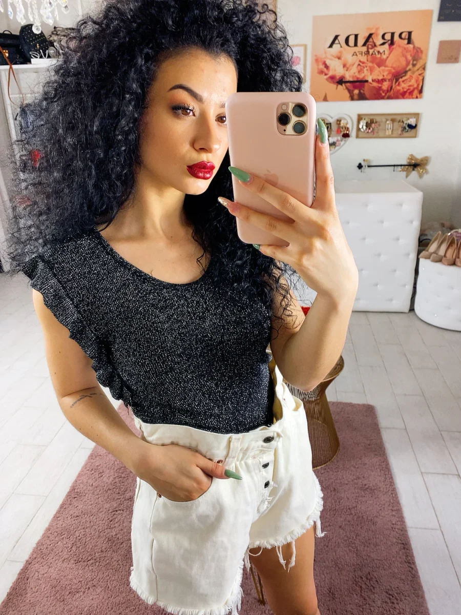 Semplice maglietta con glitter. Rouge sulla manica. Taglia unica