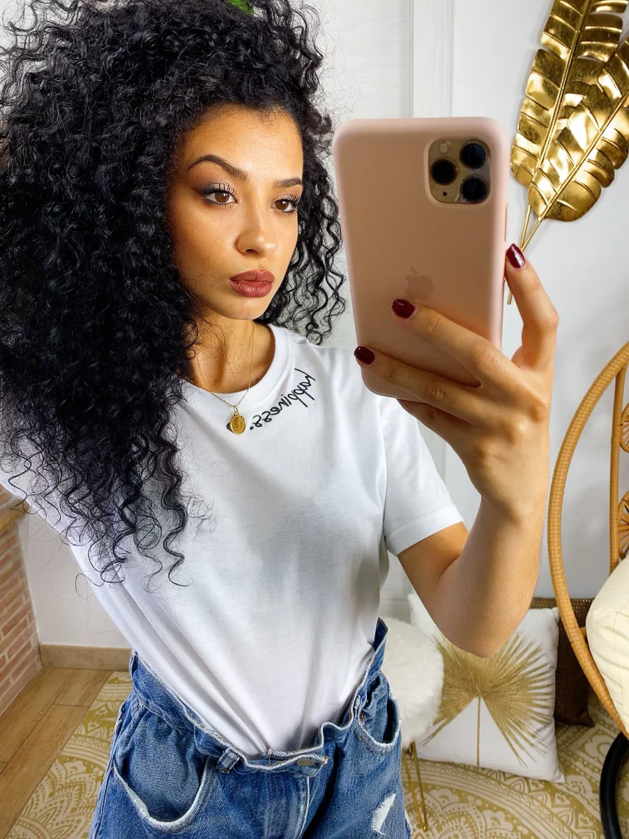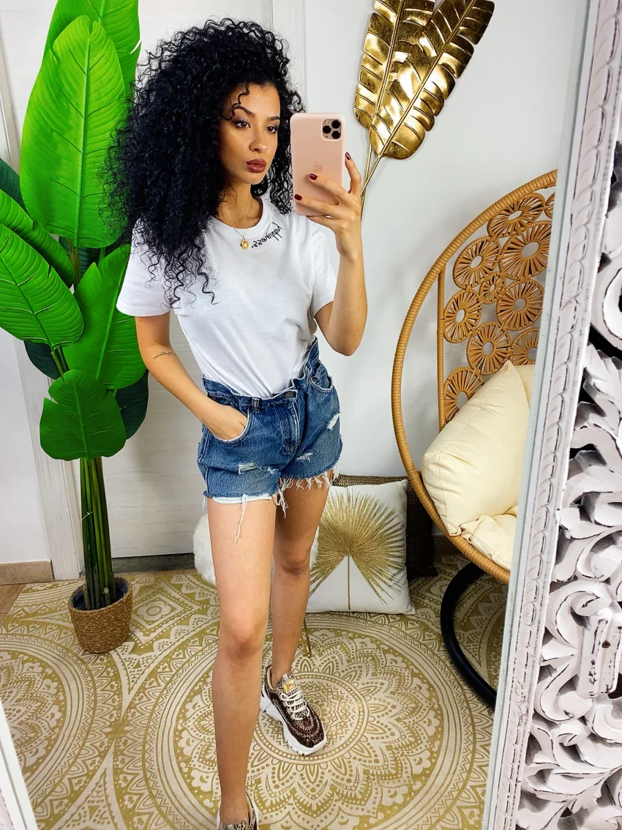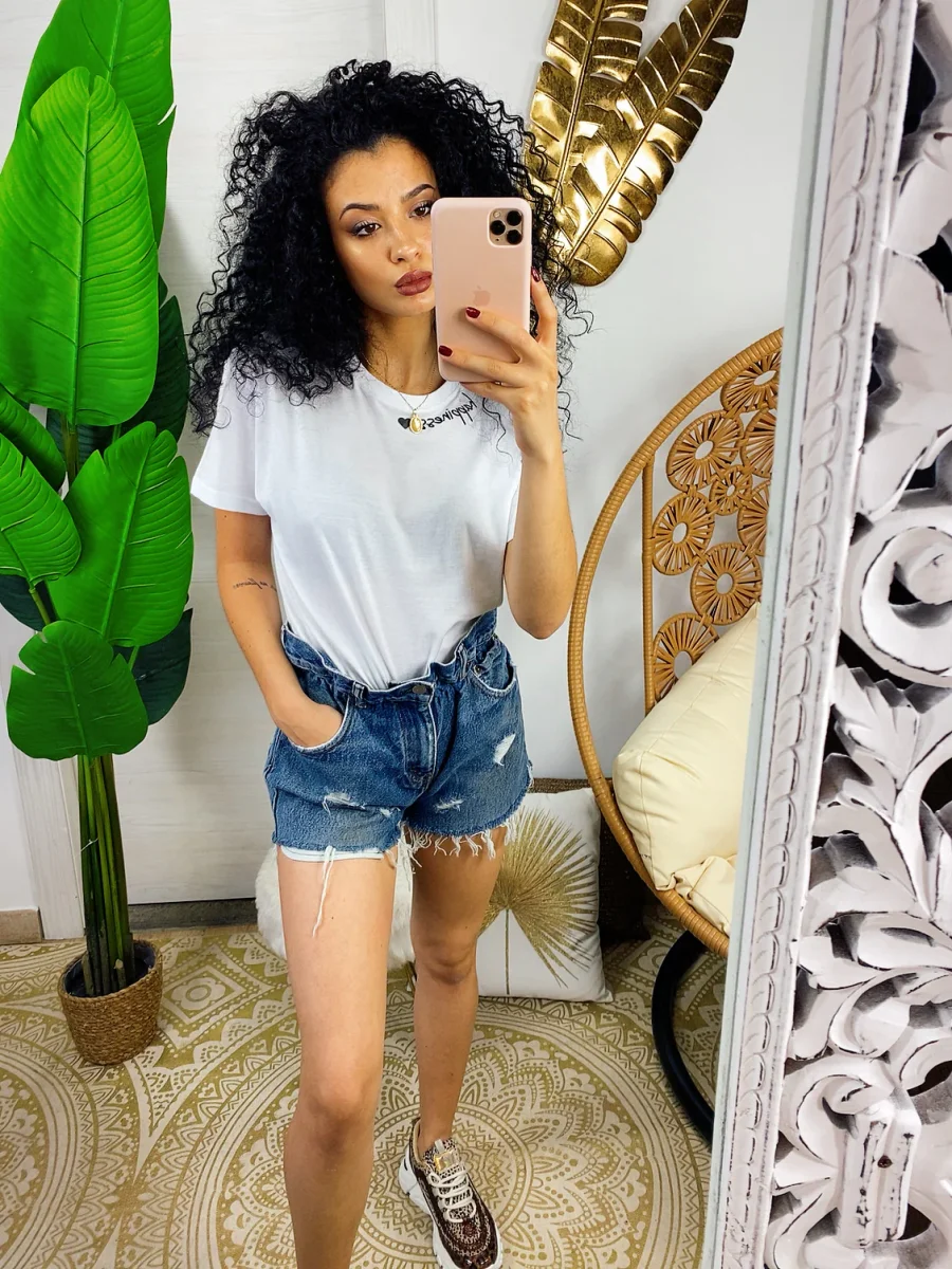 Magliettina in cotone a manica corta con stampa sul collo. Modello corto