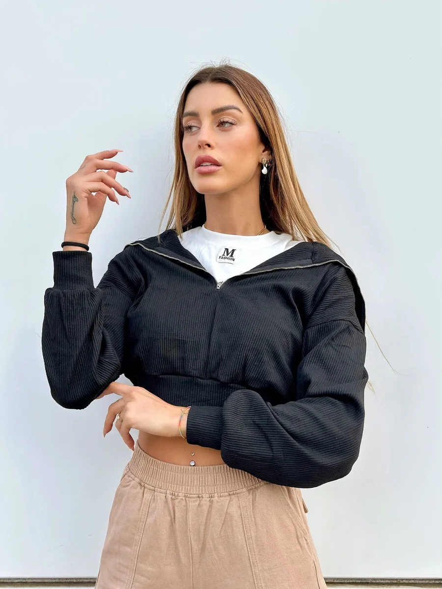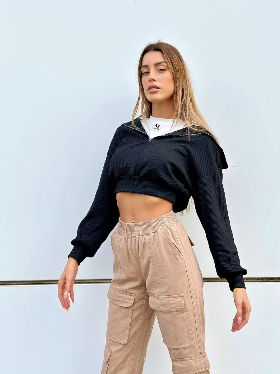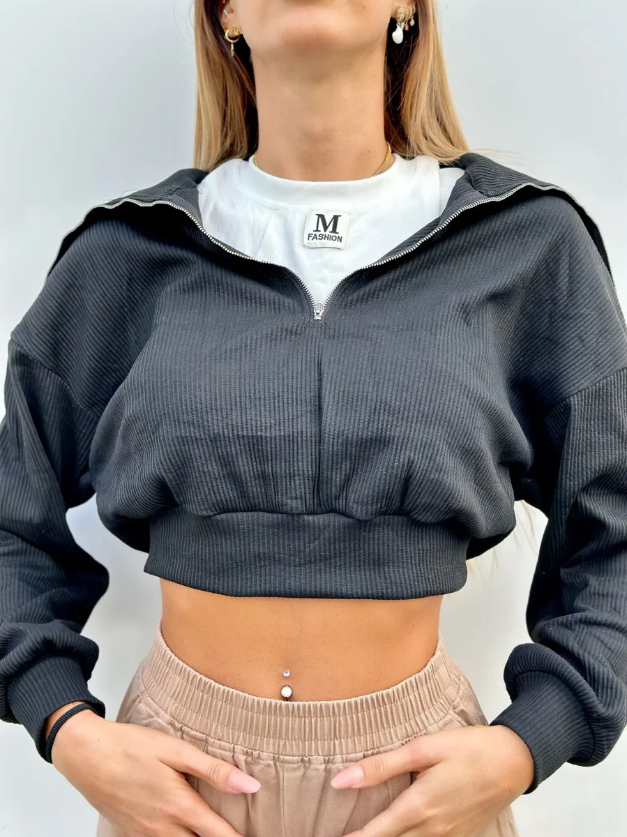 Due pezzi in uno, utilizzabili lnsieme. T-shirt crop bianca e felpa crop con zip e collo ampio.
