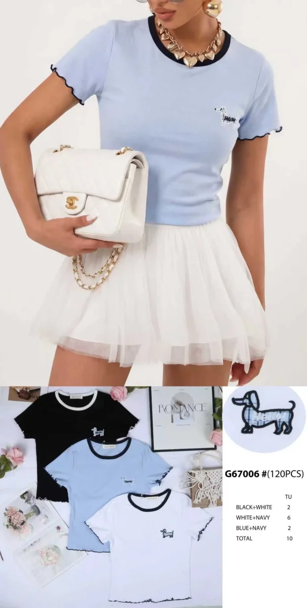 Il design aderente valorizza la silhouette, mentre il ricamo del cagnolino e i profili a contrasto su collo e maniche donano un look moderno, femminile e di tendenza. Ideale da abbinare con jeans, gonne o shorts per creare outfit casual chic, freschi e super attuali.