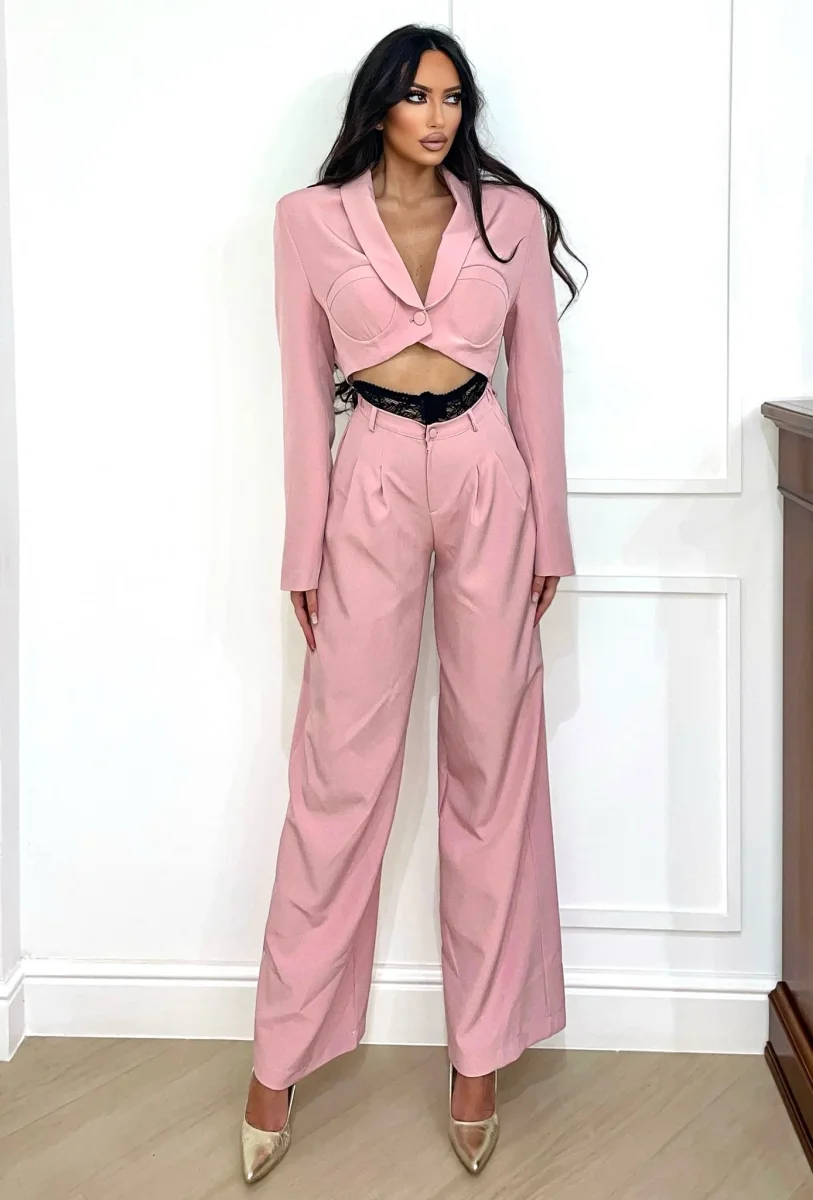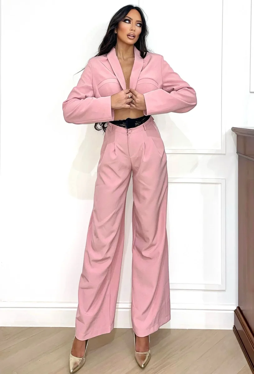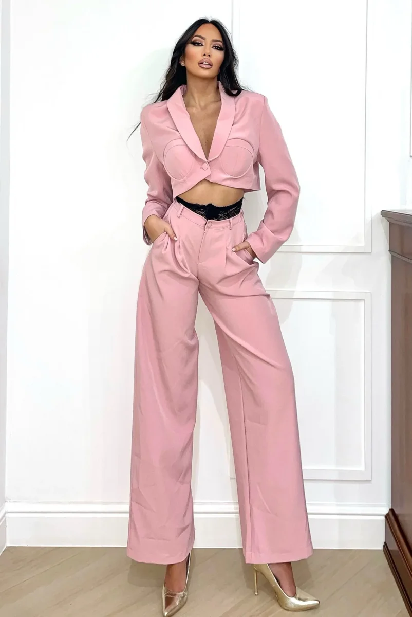 Completo alta qualità composto da giacca crop foderata con coppe e bottone, spalline imbottite.