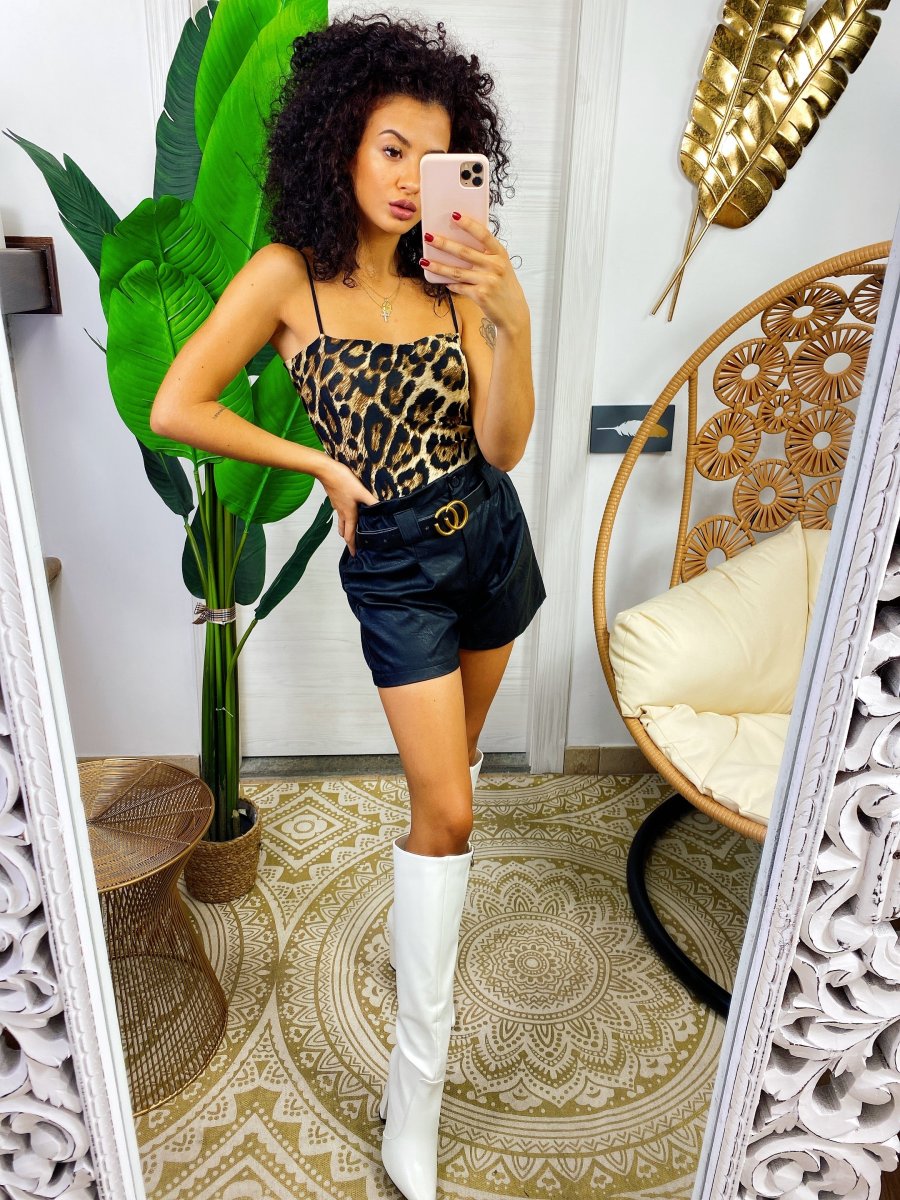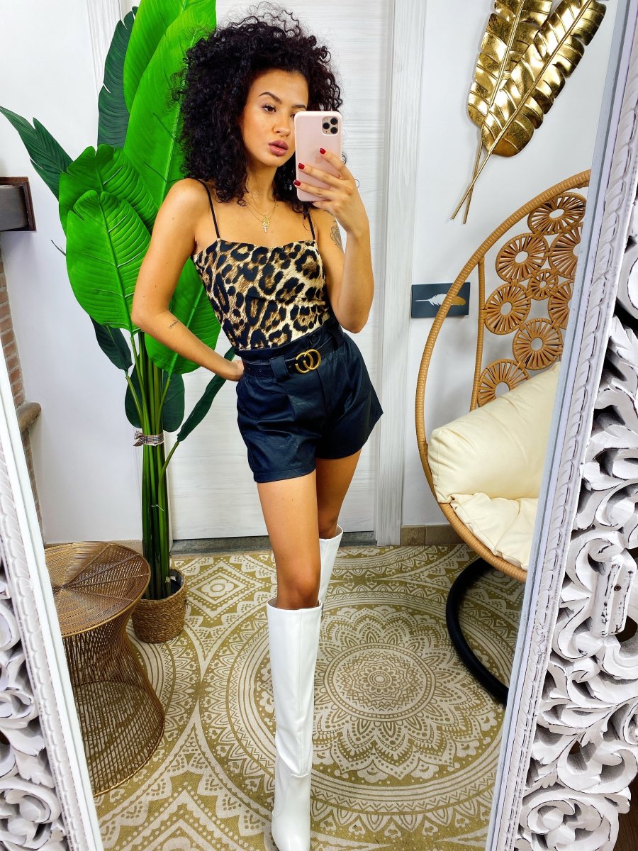 topa bretellina con coppe in tessuto maculato semplice per i tuoi outfit ma essenziale abbinabile con una gonna come questa o un pantalone a vita alta.