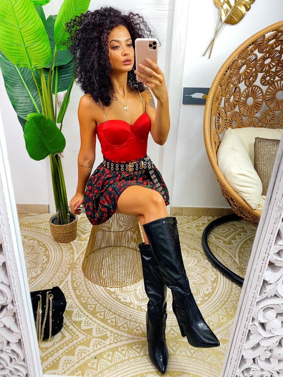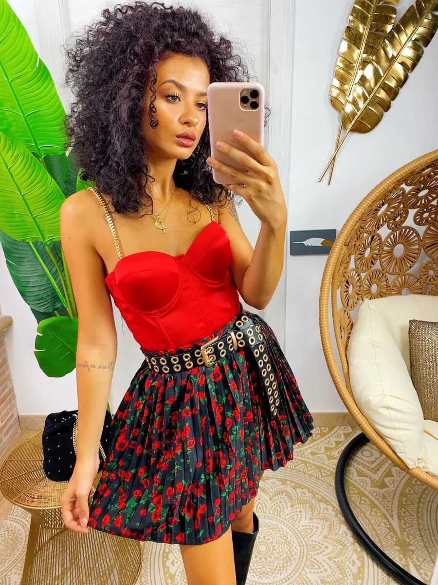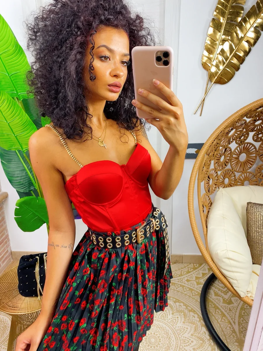 Top corto in tessuto elasticizzato e raso con coppe imbottite.