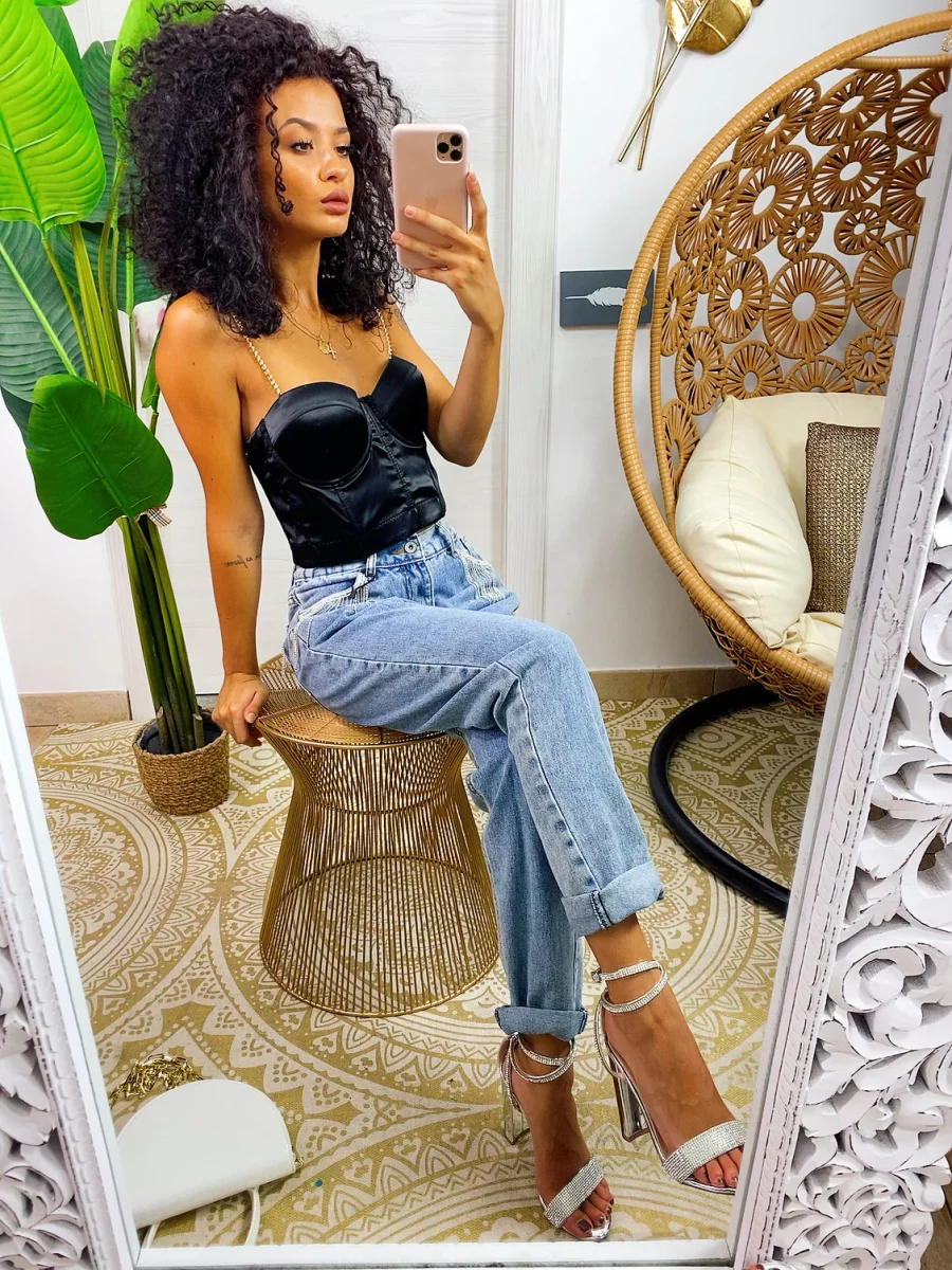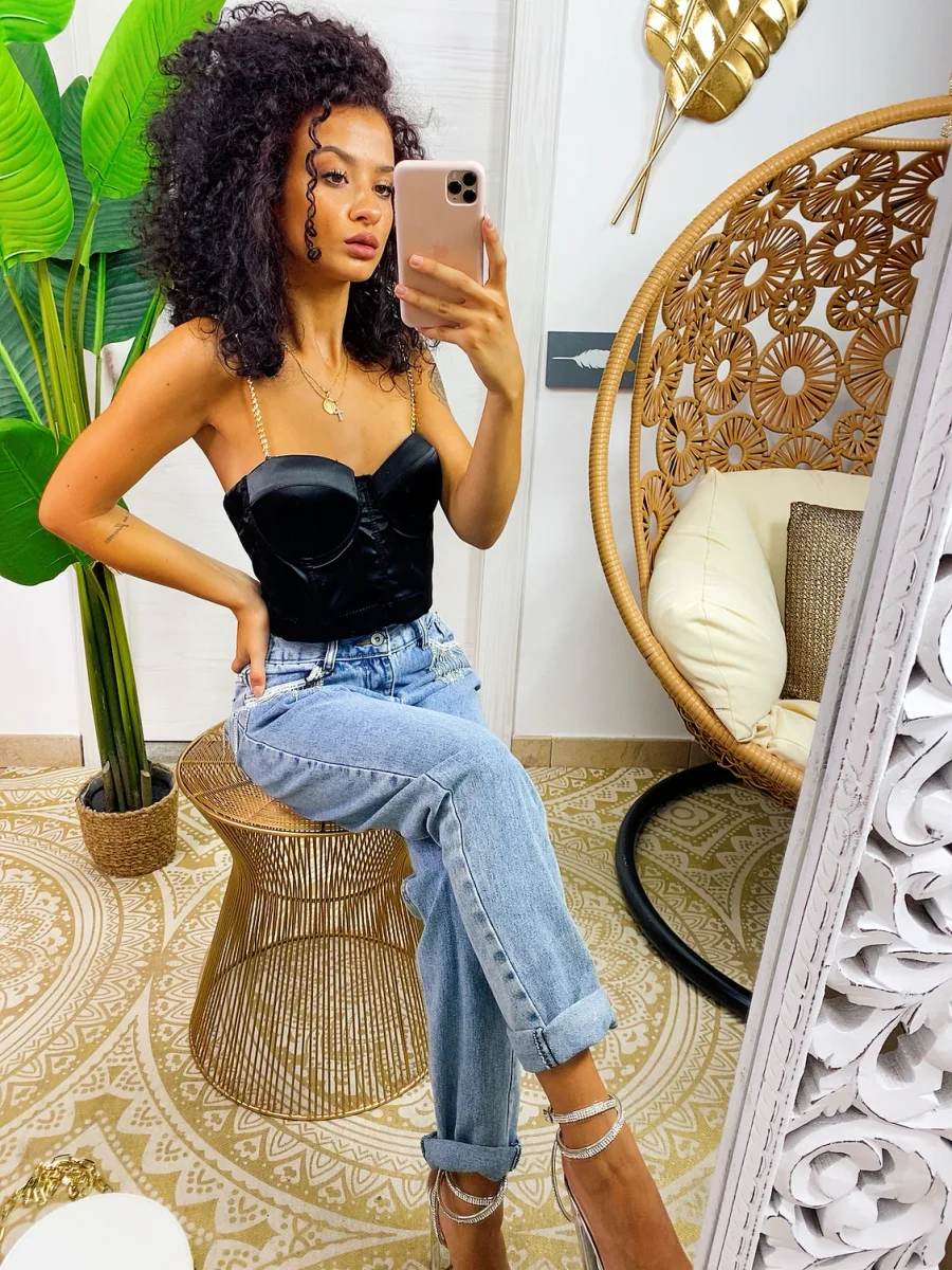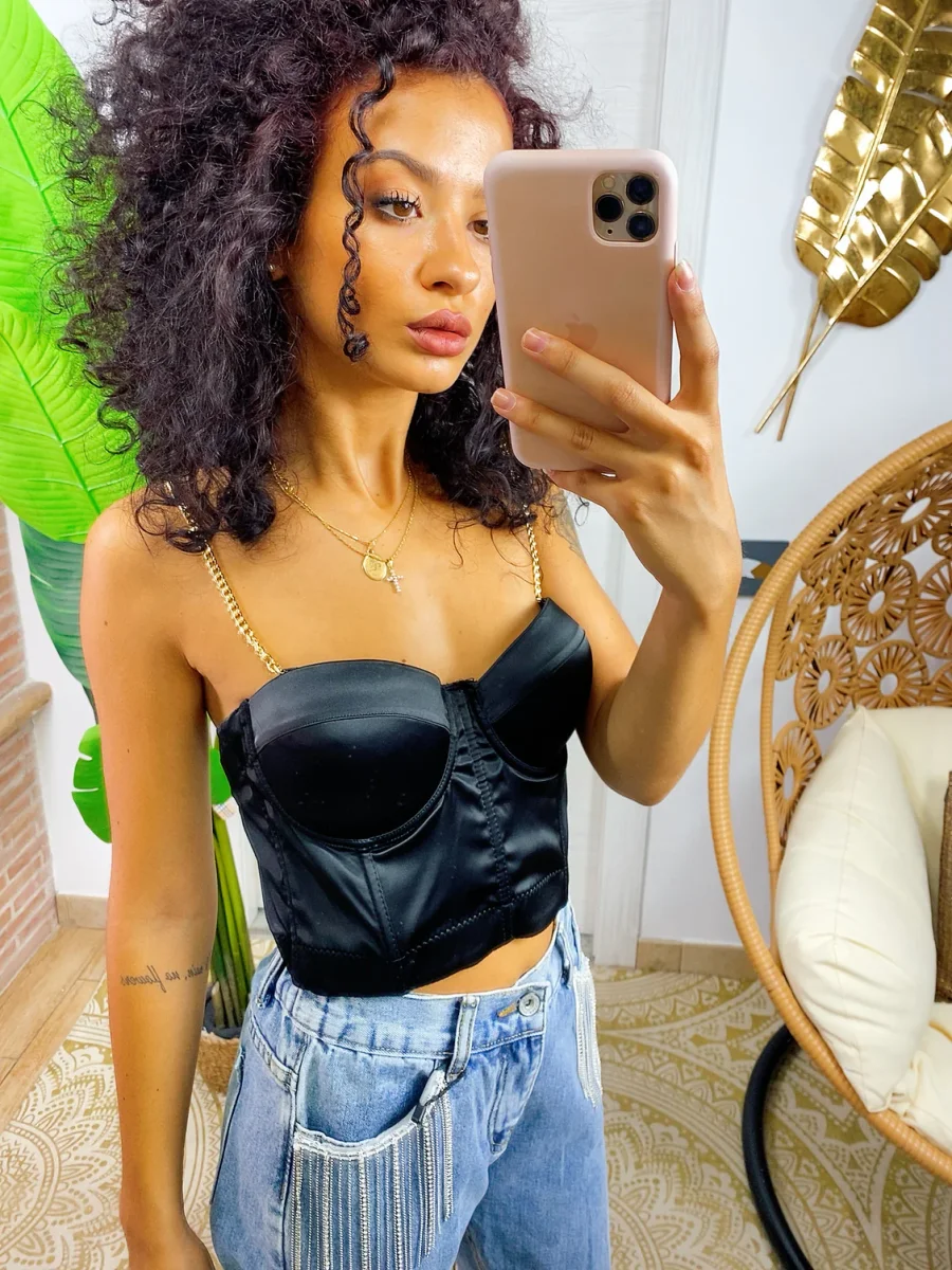 Top corto elasticizzato e raso con coppe imbottite .