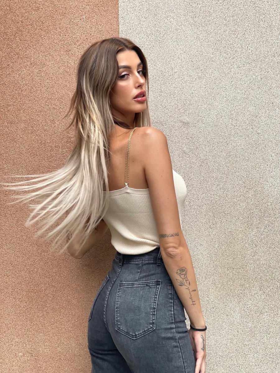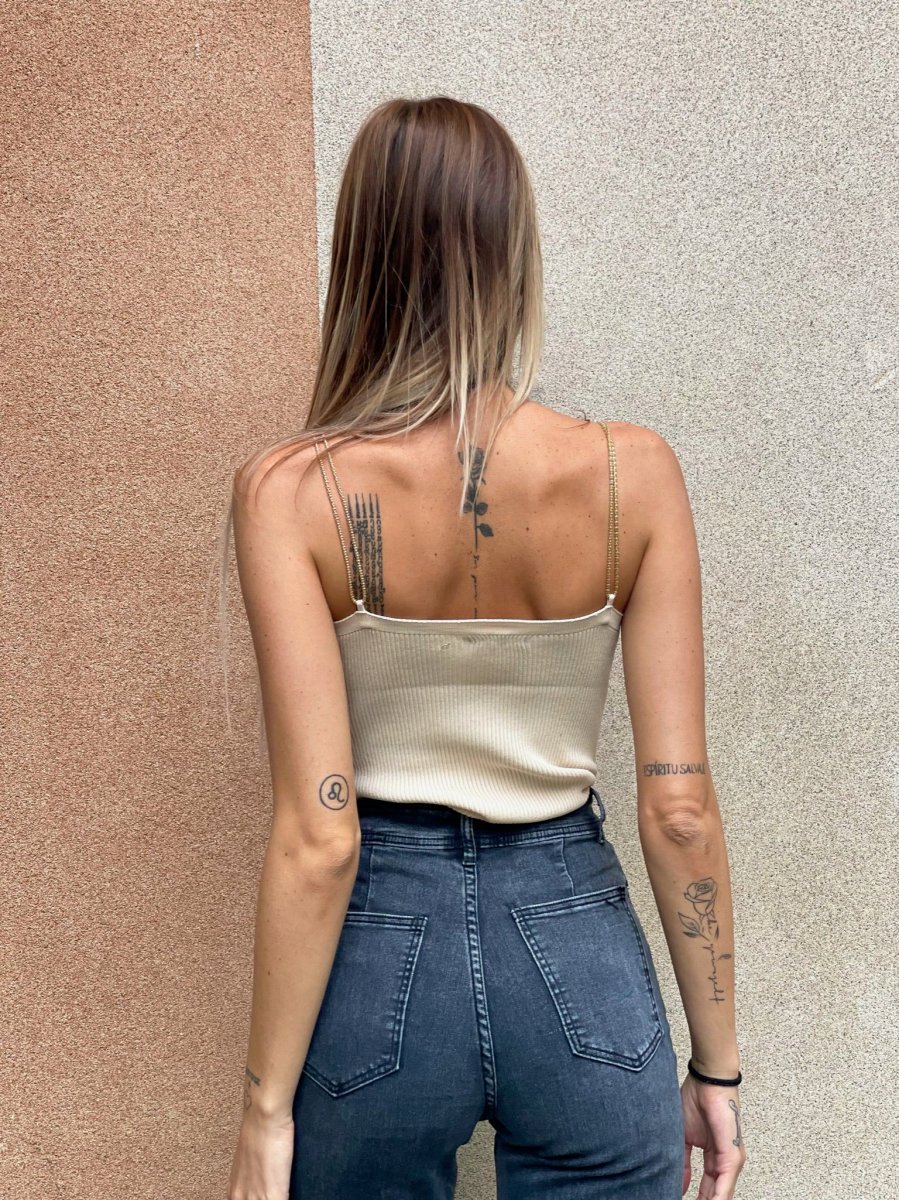 Top a costine in tessuto medio pesante, alta qualità francese. Spalline oro che arricchiscono il tutto. Perfetta da sola che come sotto giacca