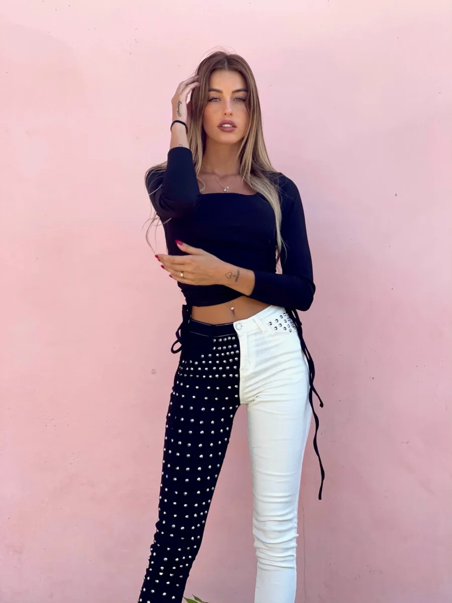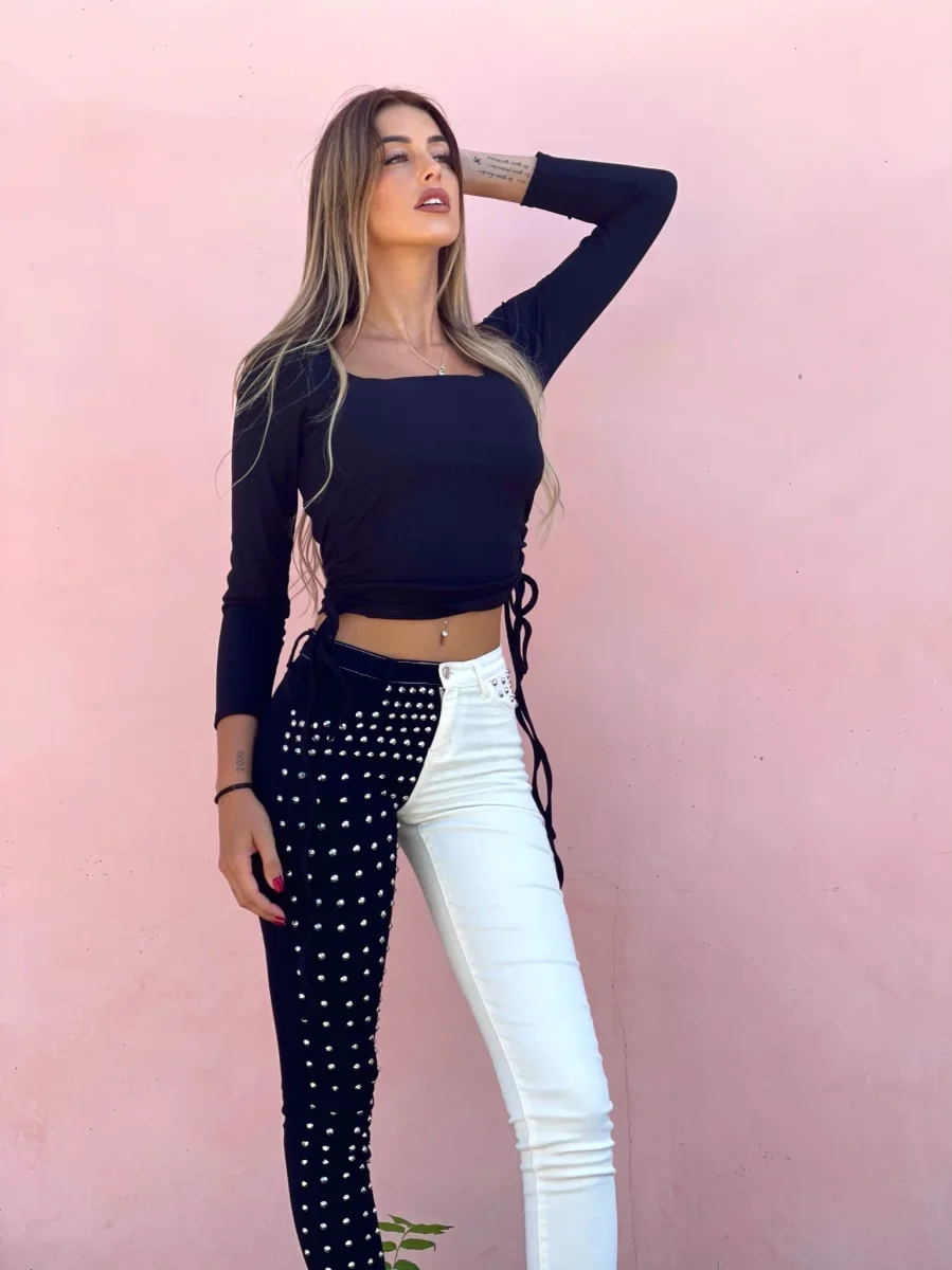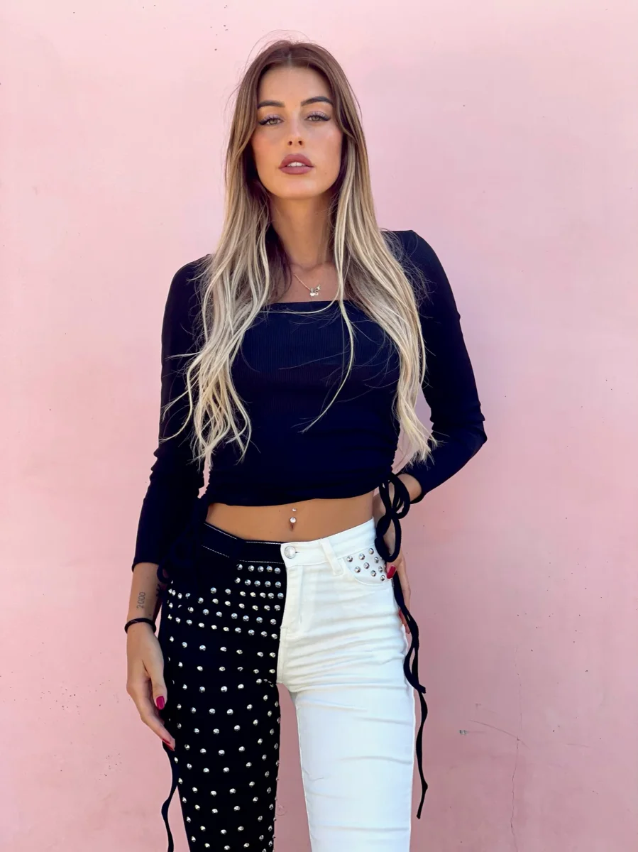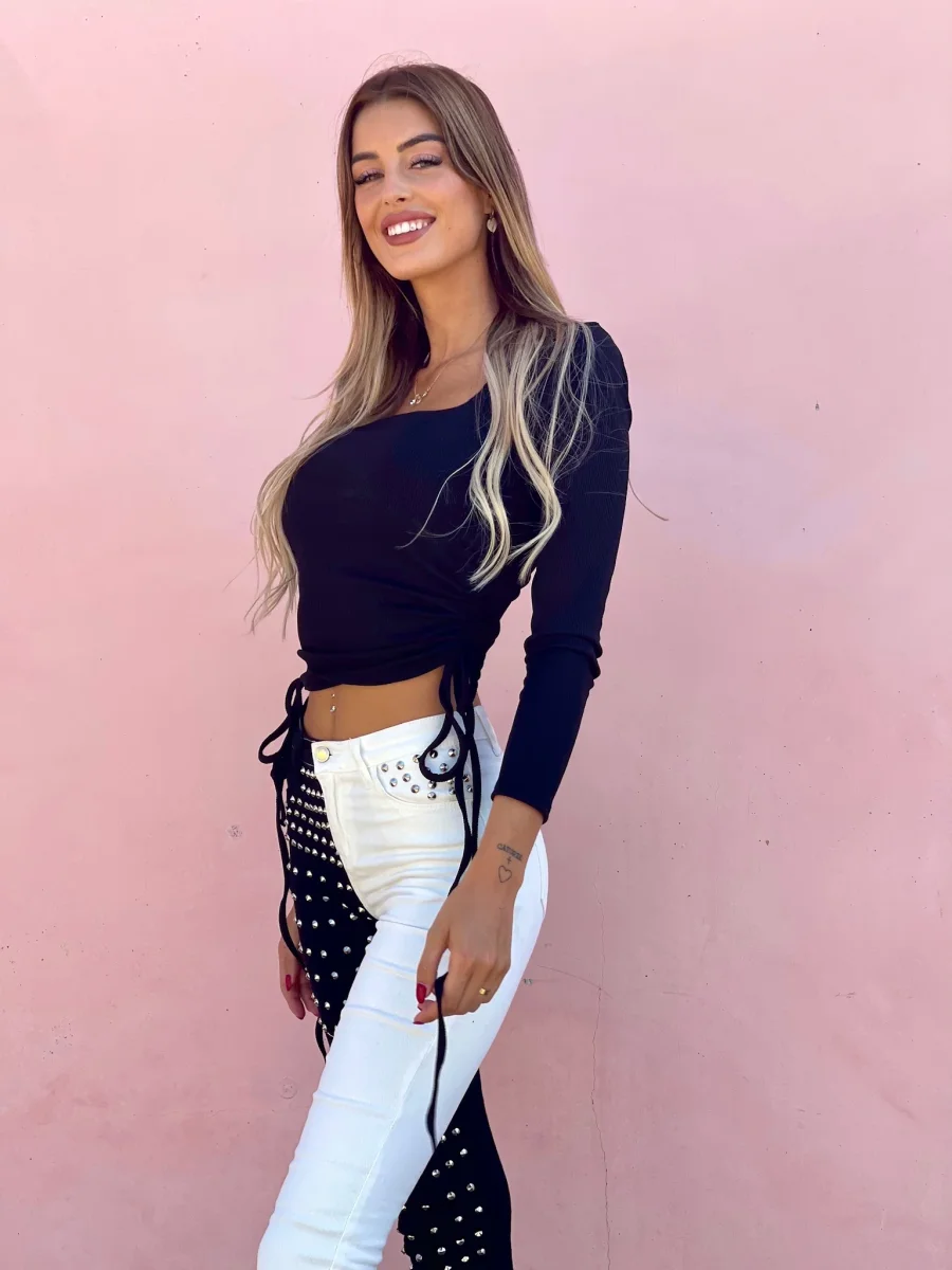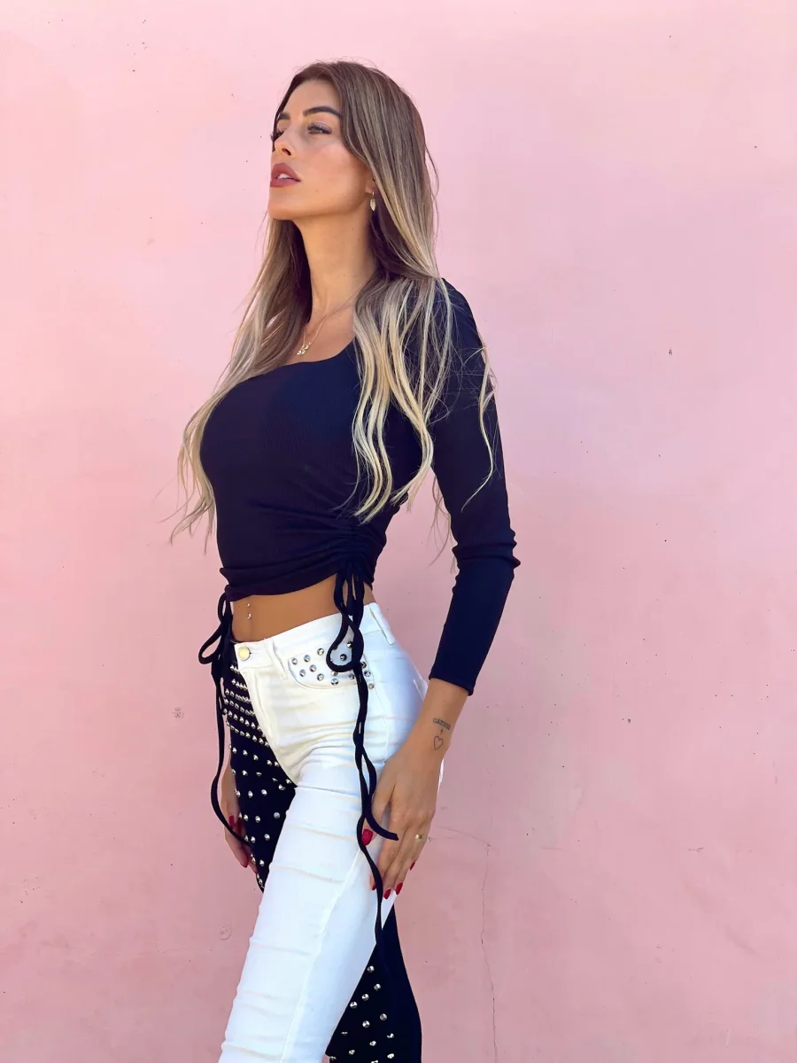 Top a costine con arricciature su entrambi i fianchi, manica lunga e scollo a U.