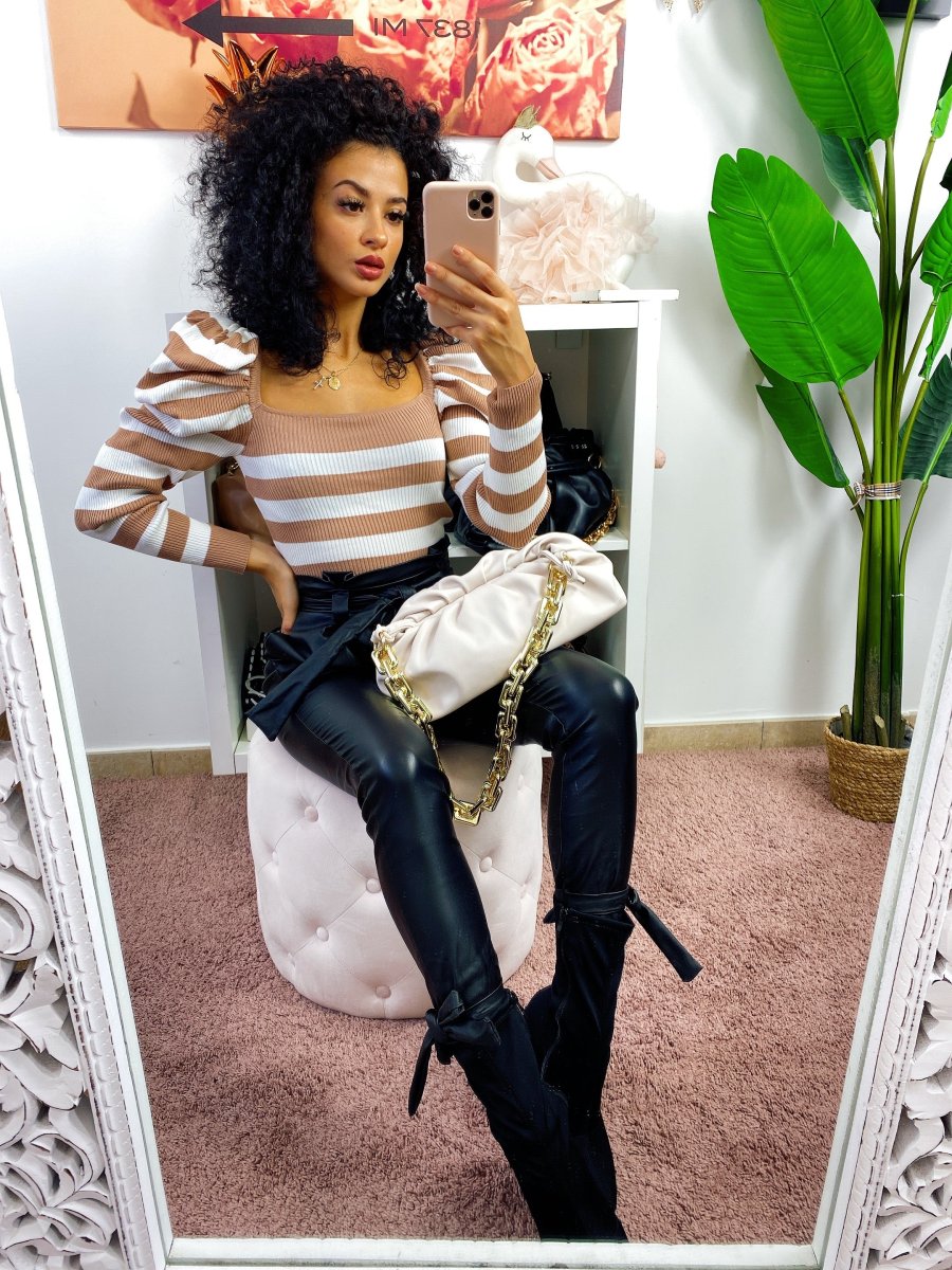Maglioncino corto a righe con manica bombata. Tessuto elasticizzato comodo