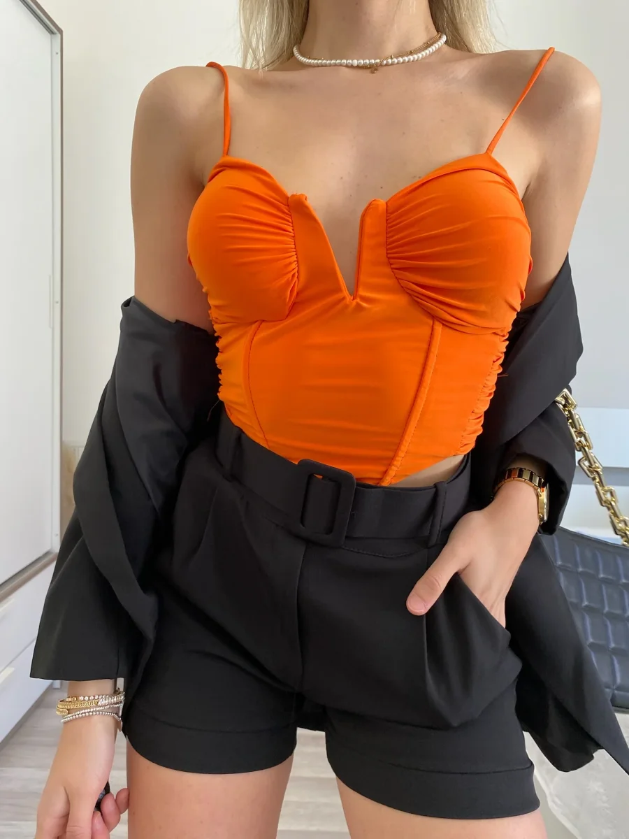 Top con coppe e spalline regolabili. Dettaglio con V