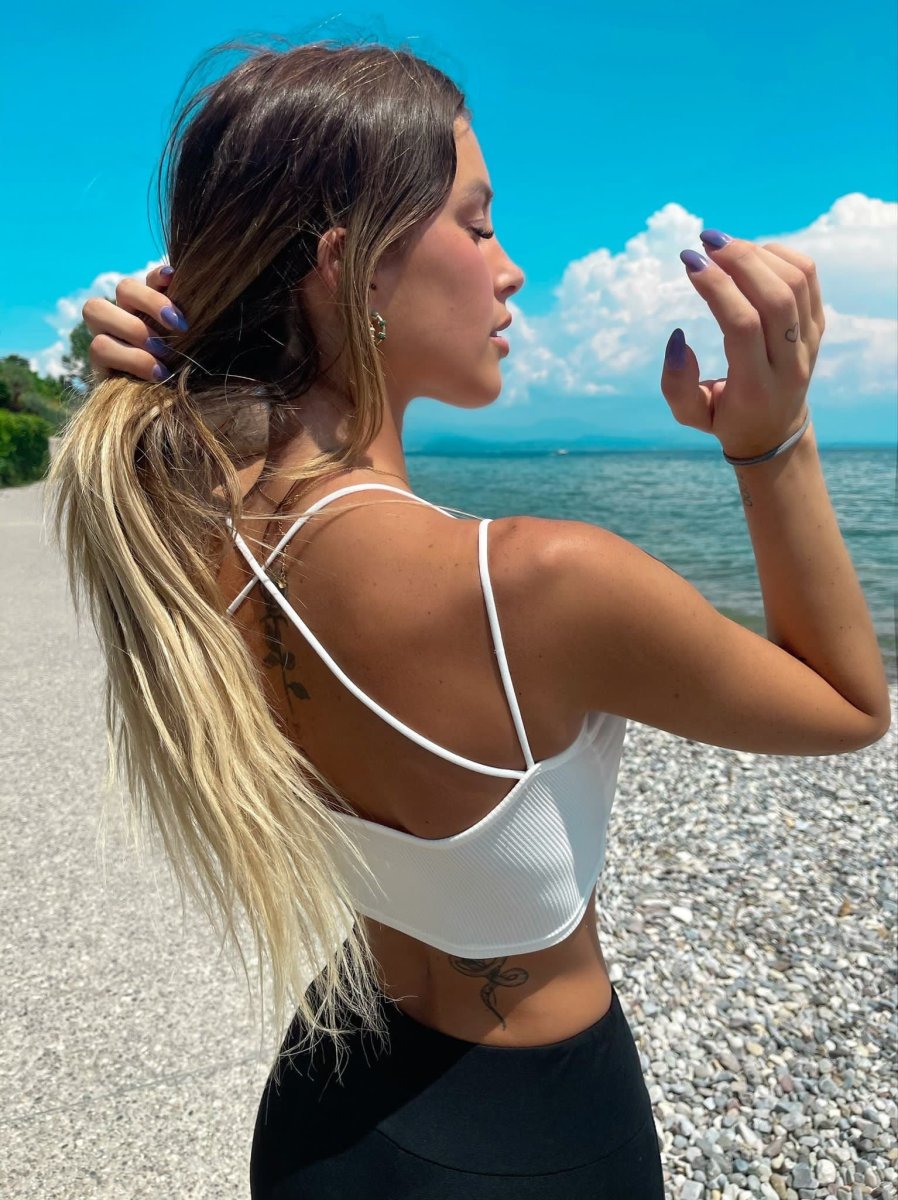 Top bianco a costine Con lacci, semplice estivo da tutti i giorni.