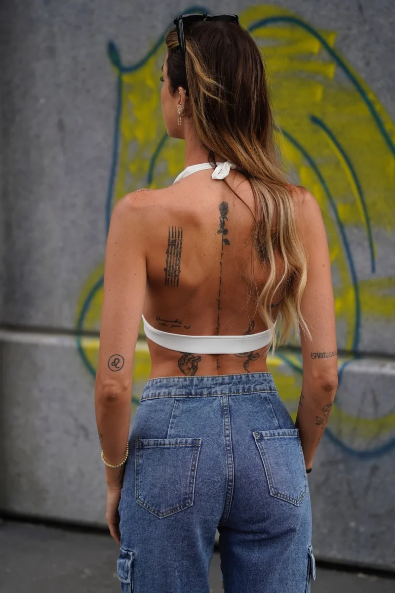 Top in lycra con coppe e laccio dietro al collo regolabile , dettaglio triangolino nero