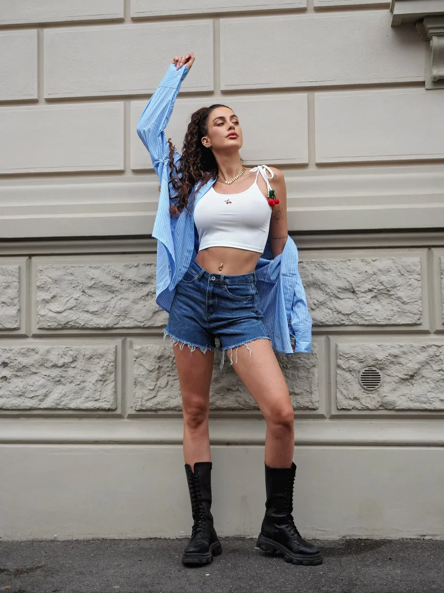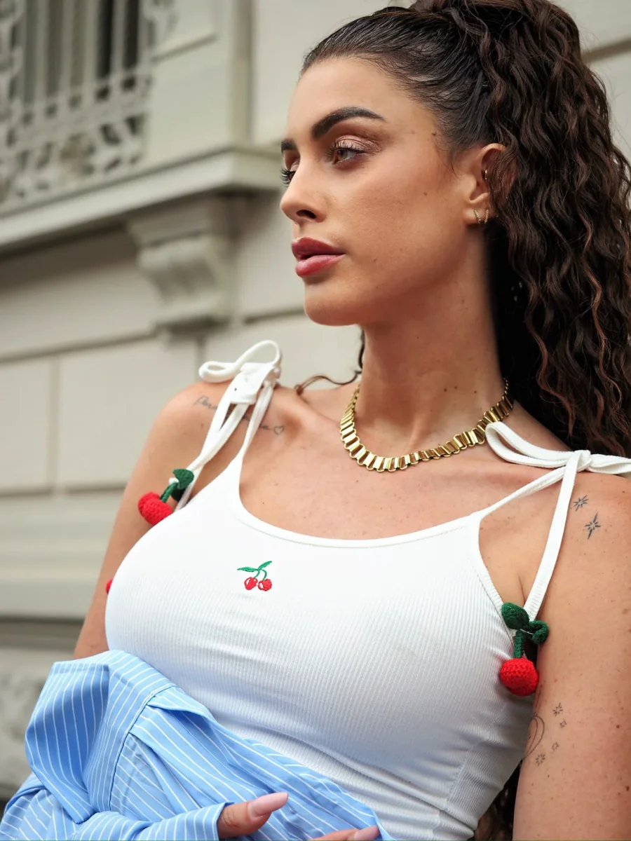 Top bianco a costine con ciliegie in dettaglio