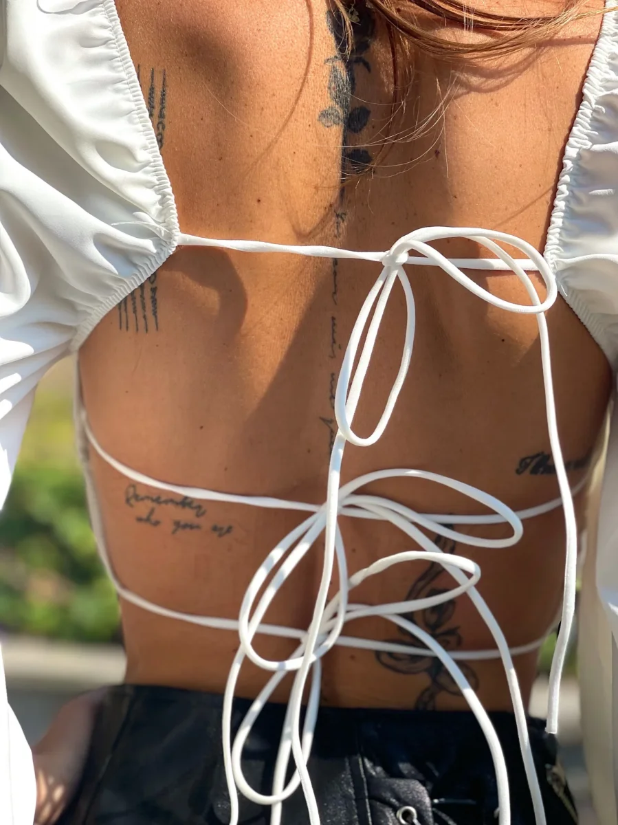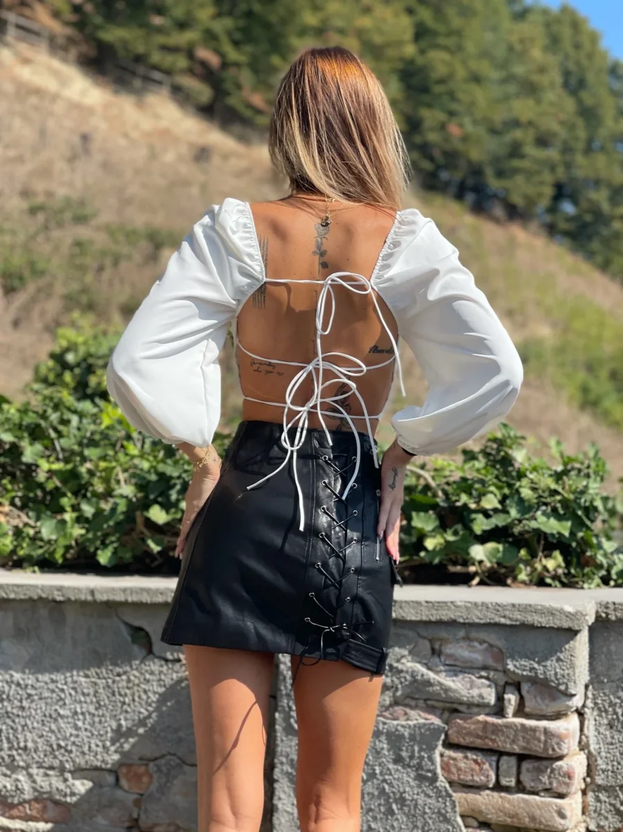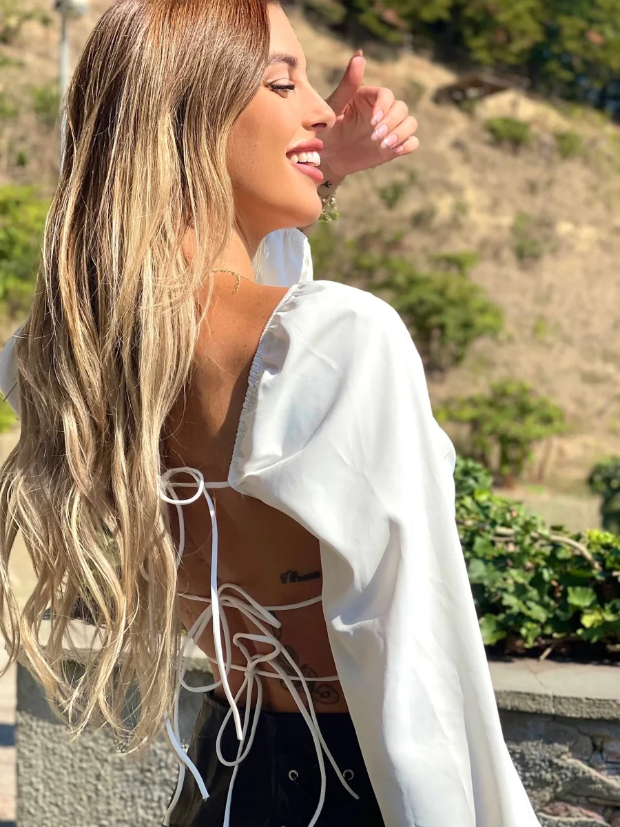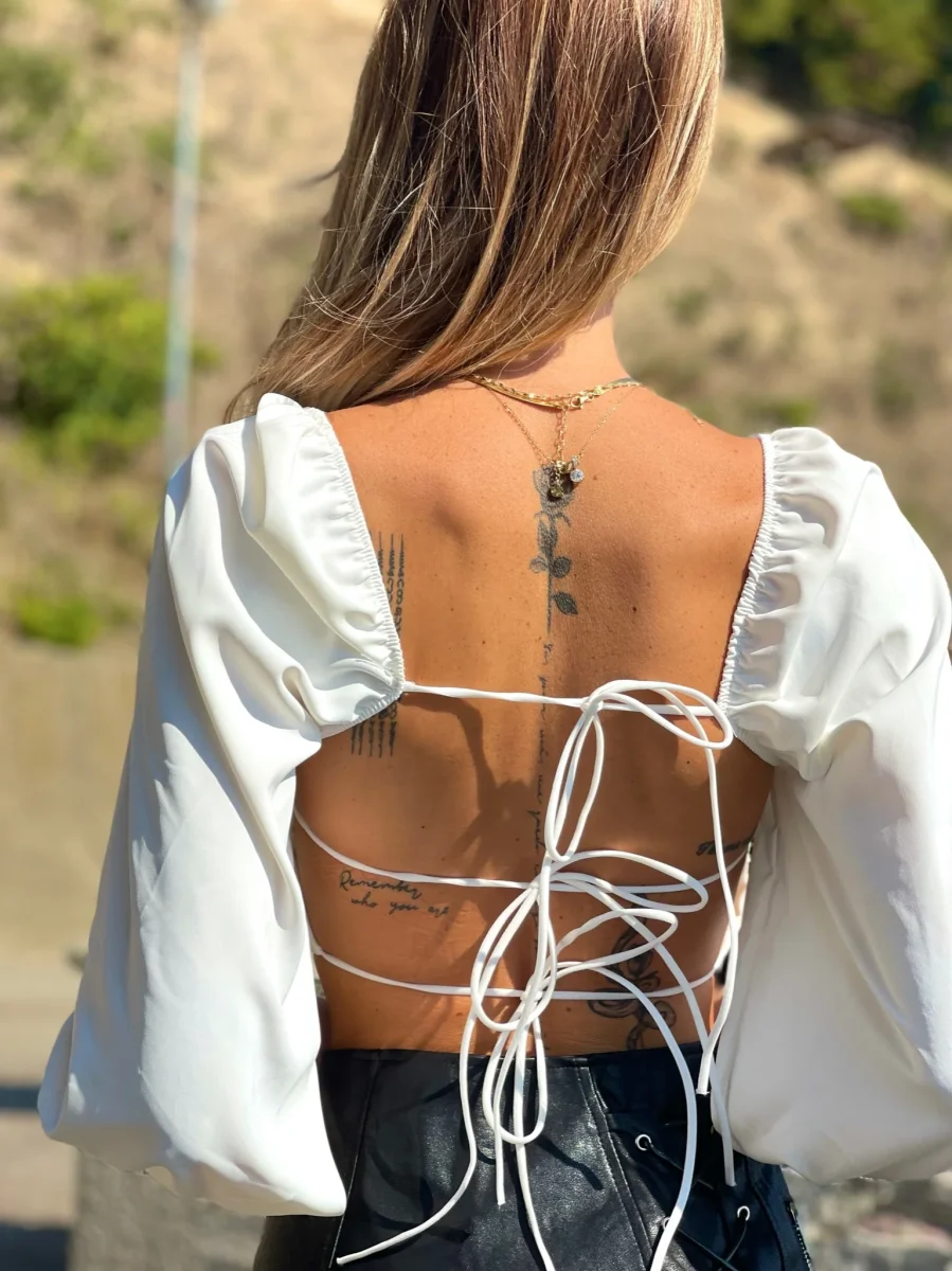 Top bianco con maniche velate e coppe, scollo a V e schiena completamente incrociata.