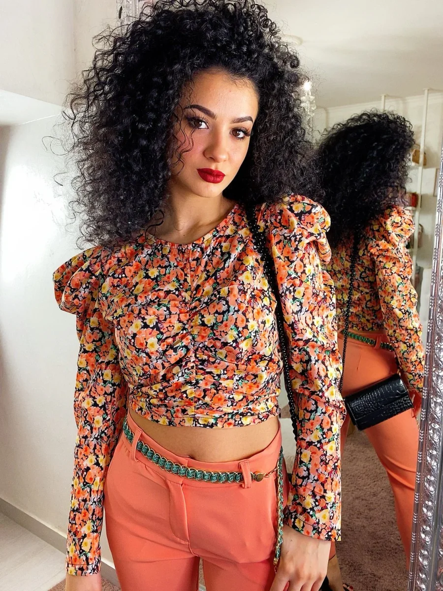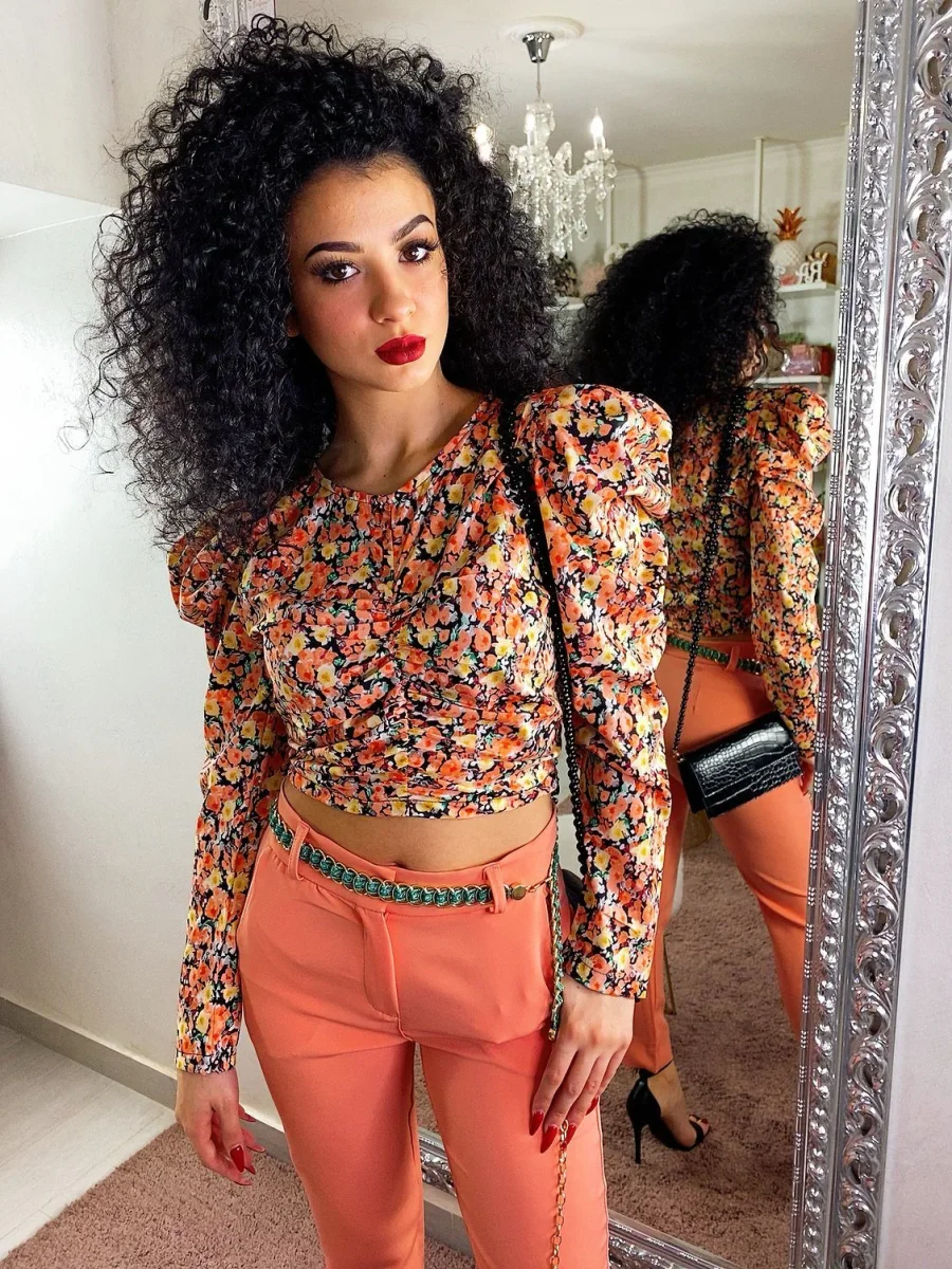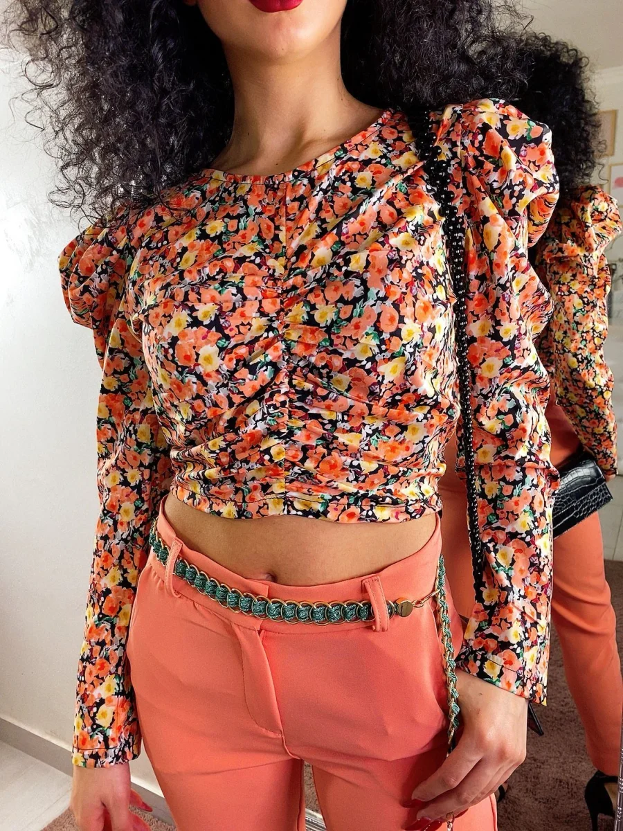Magliettina dal taglio corto con chiusura con zip laterale e bottoncino. Manica leggermente bombata e arricciata. Stampa a fiori sui toni dell arancio