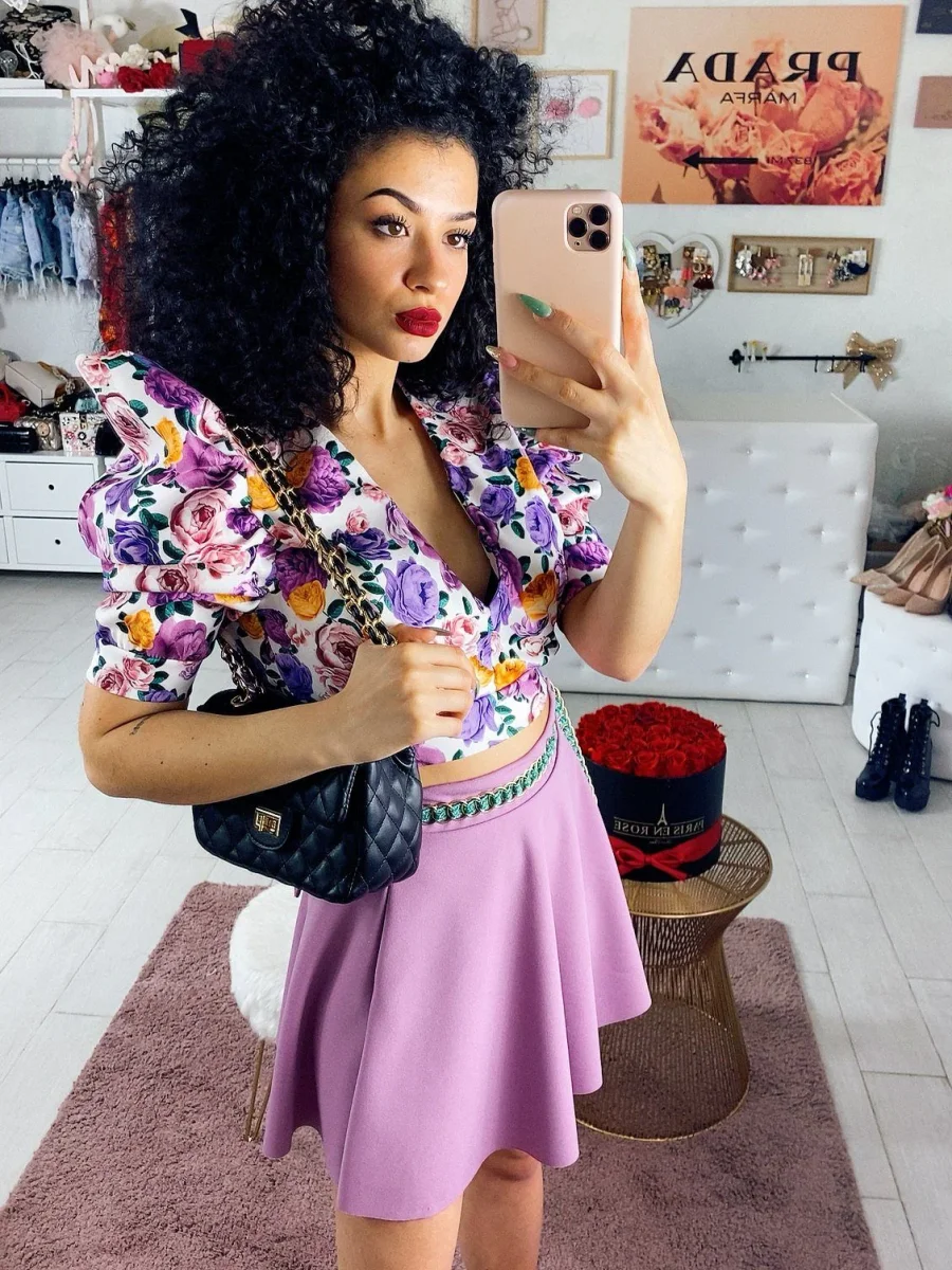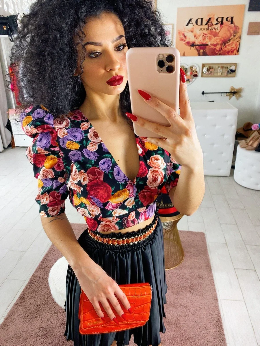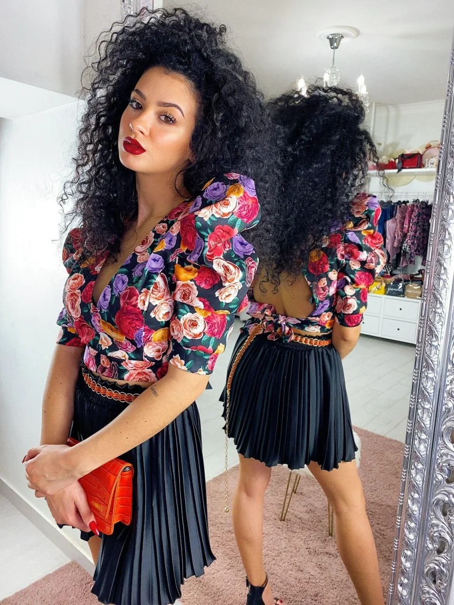 Top corto con coppe dalla stampa a fiorellini. Schiena aperta con chiusura con bottoncini e fiocco. Consigliamo a ragazze con seno piccolo.