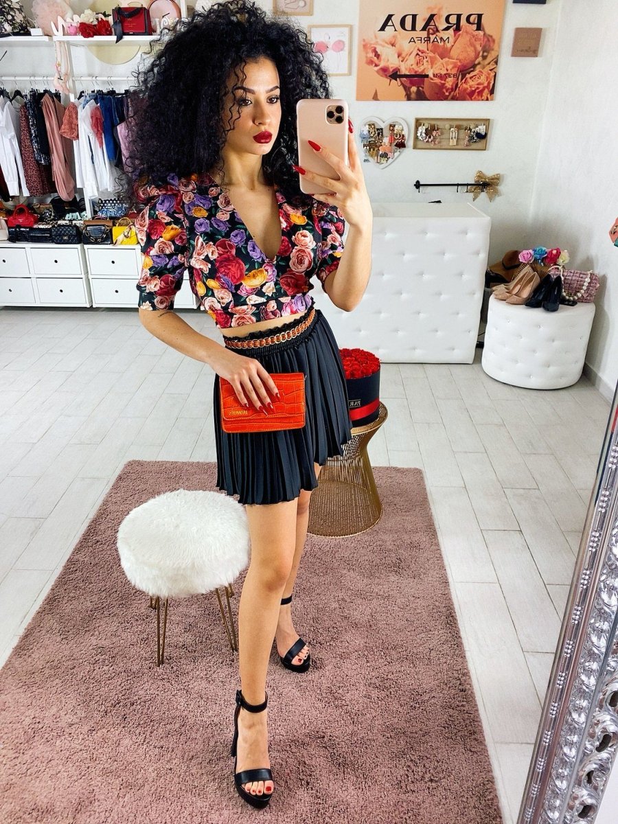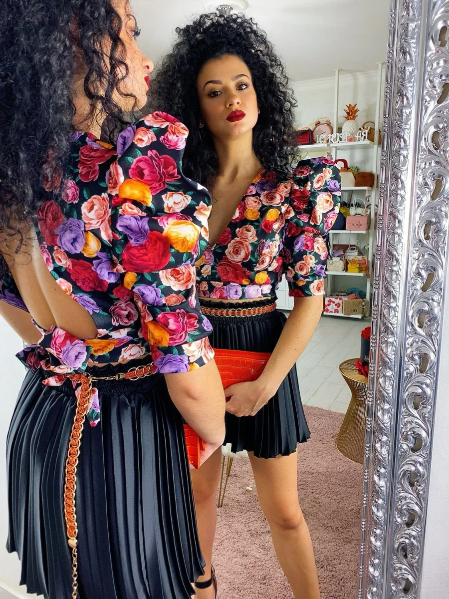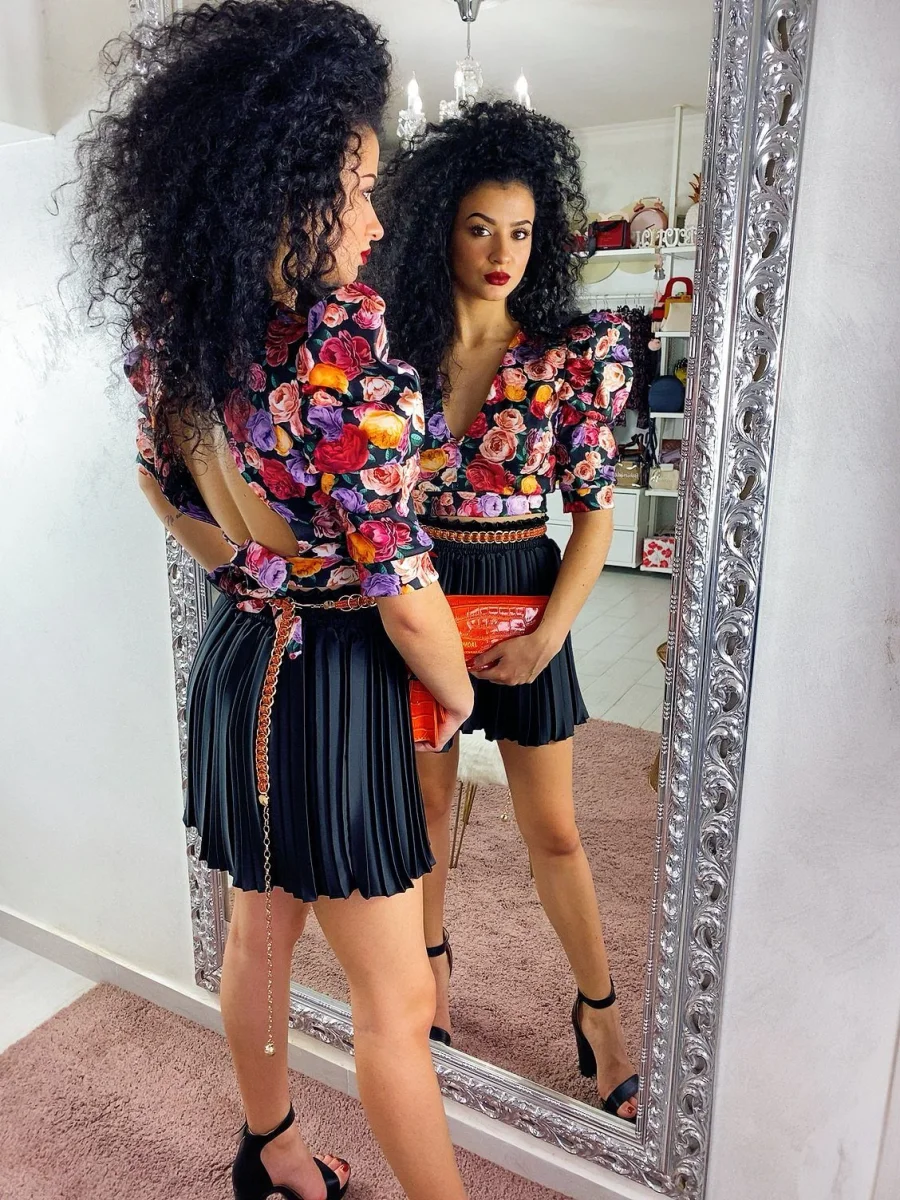 Top corto con coppe dalla stampa a fiorellini. Schiena aperta con chiusura con bottoncini e fiocco. Consigliamo a ragazze con seno piccolo.