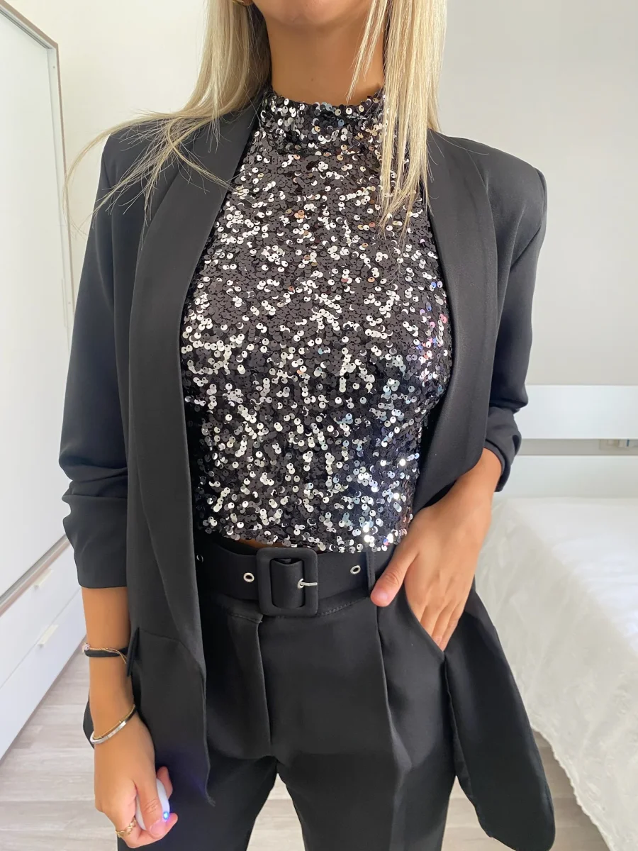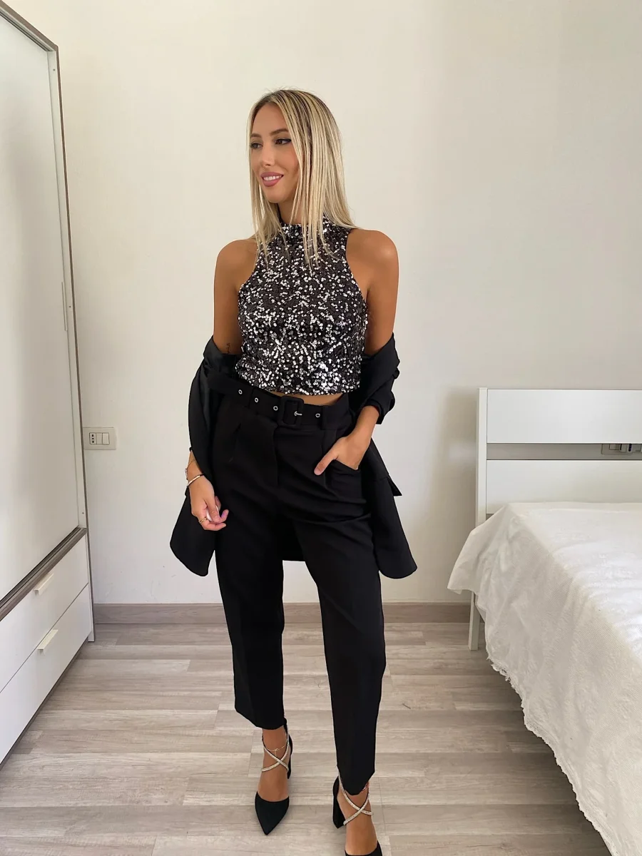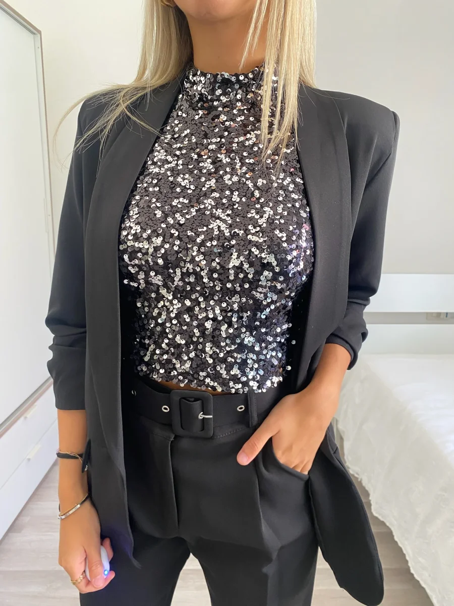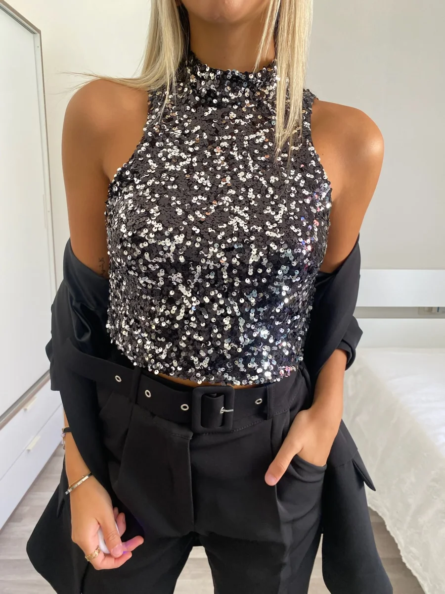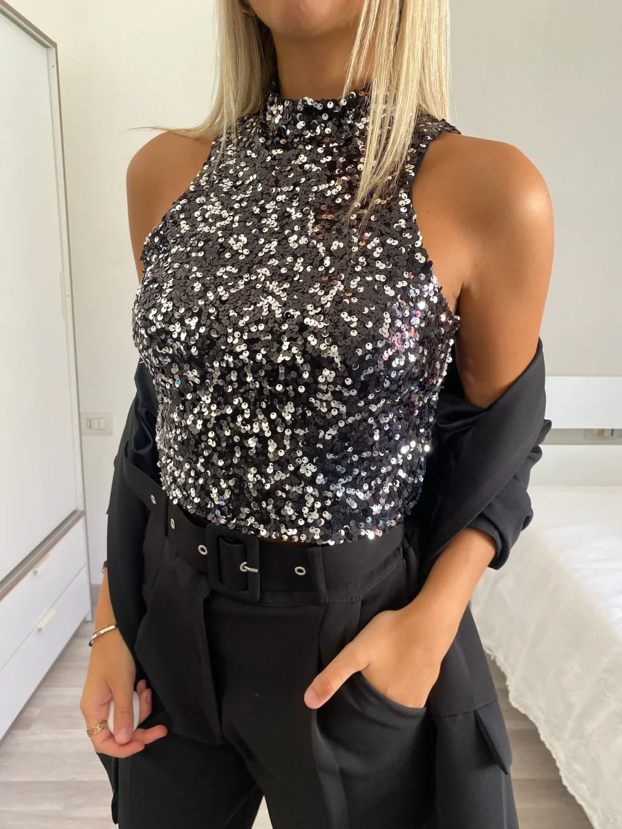 Top elasticizzato con paillettes nero silver e chiusura con bottoncino