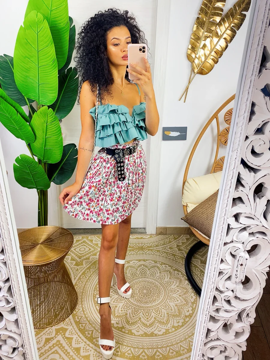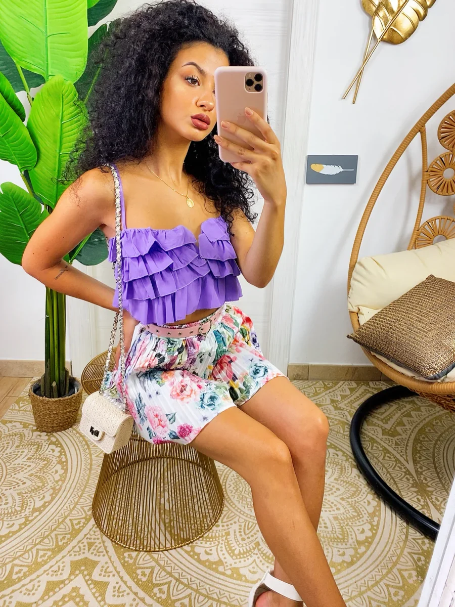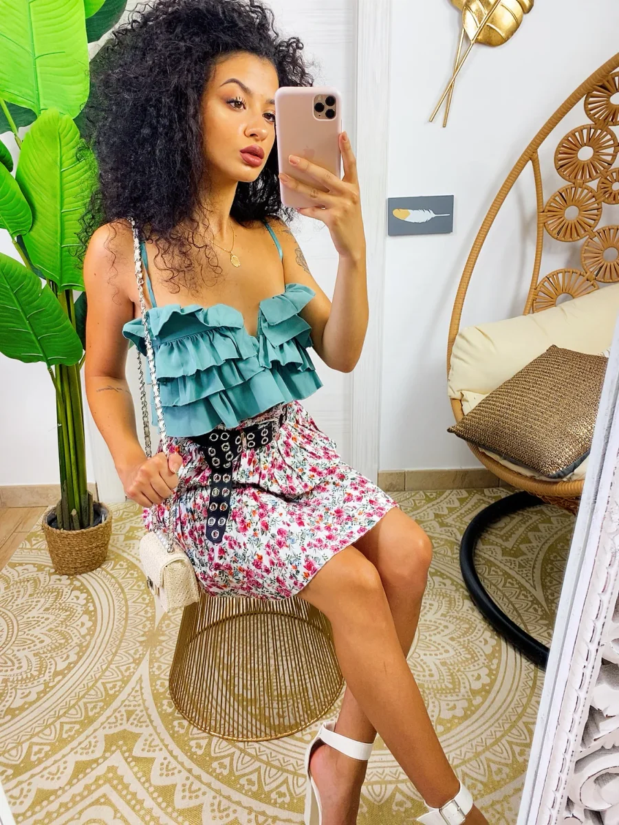Top con bretelline regolabili, modello corto con balze. Molto seducente e elegante