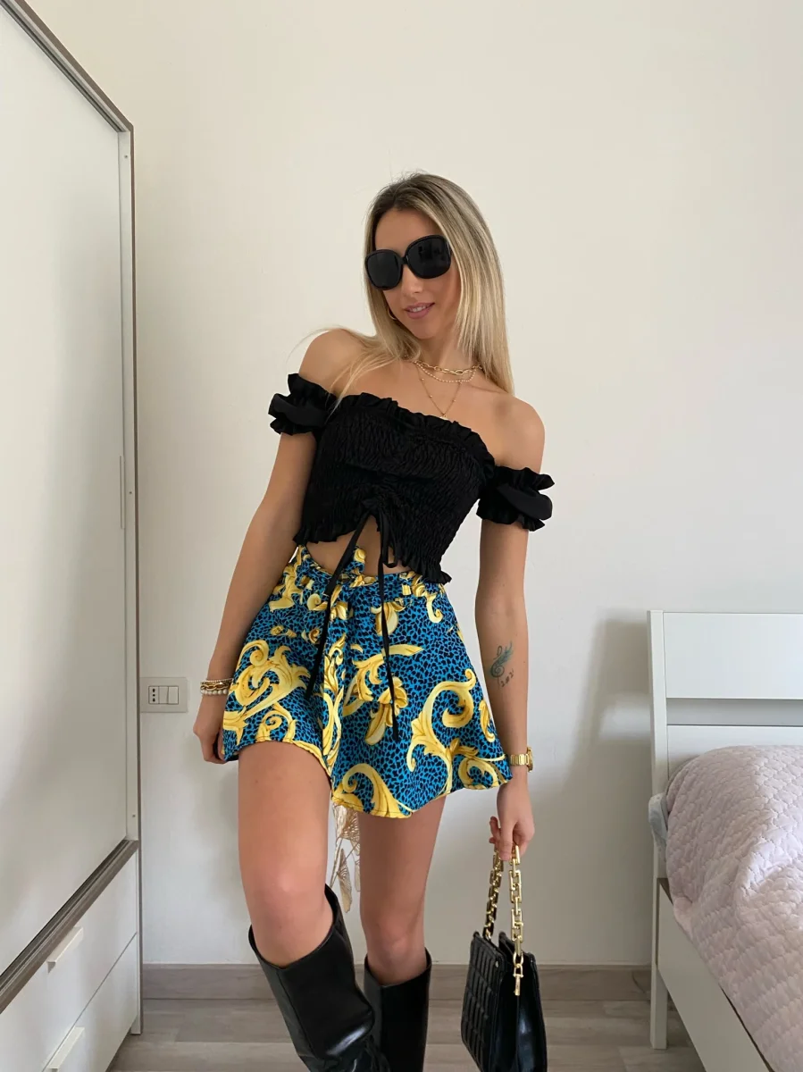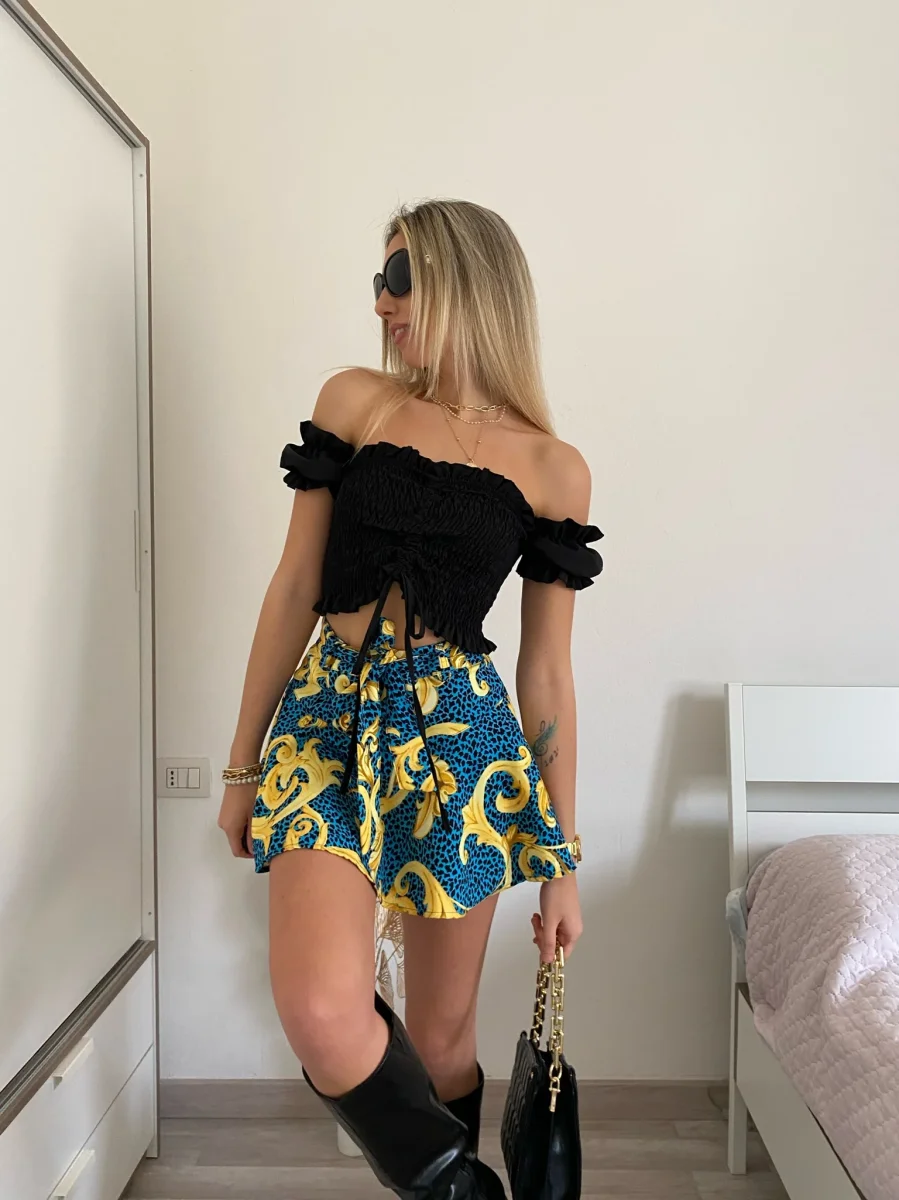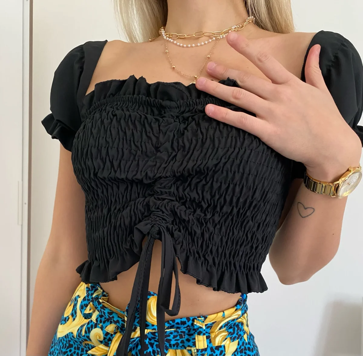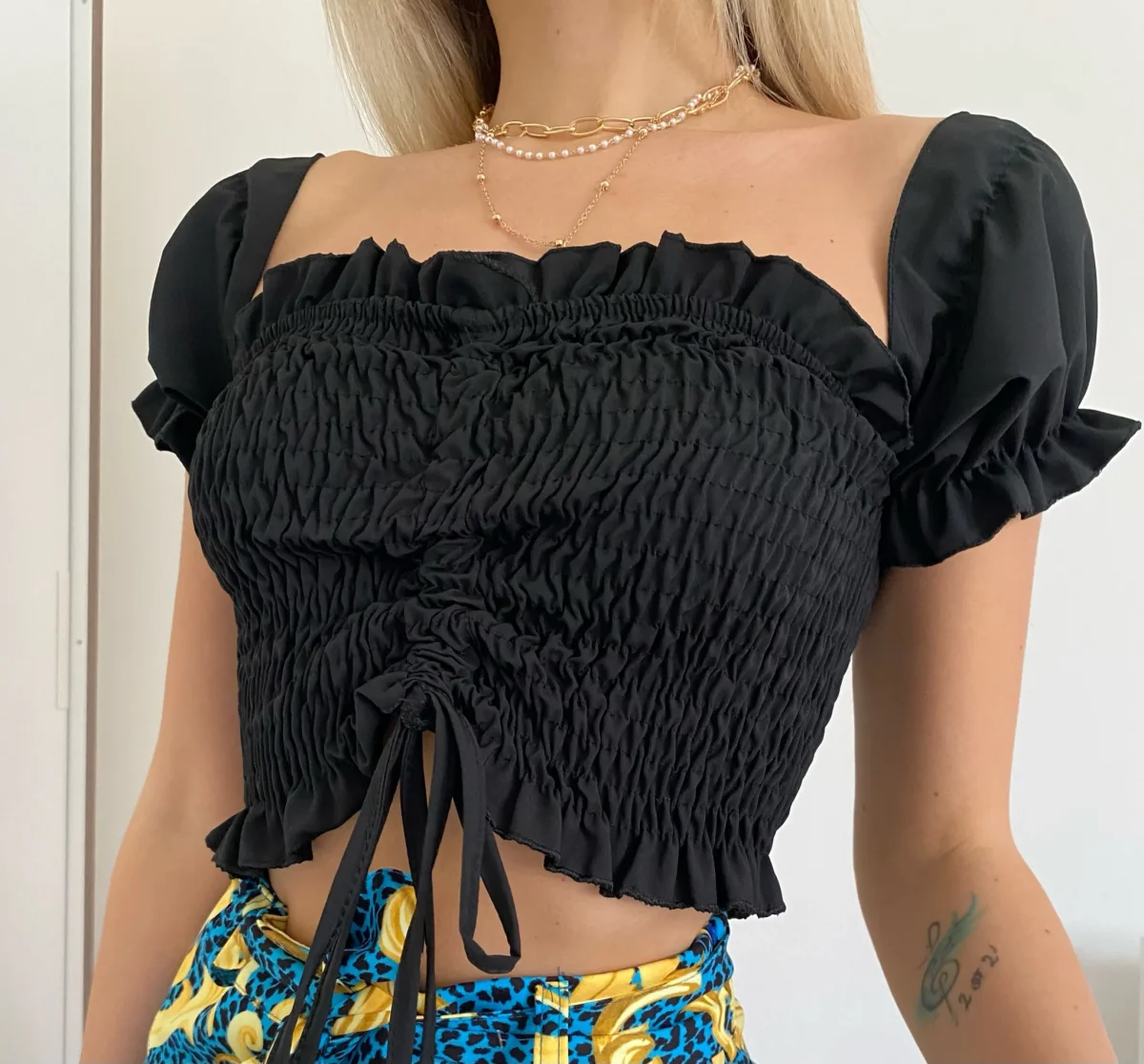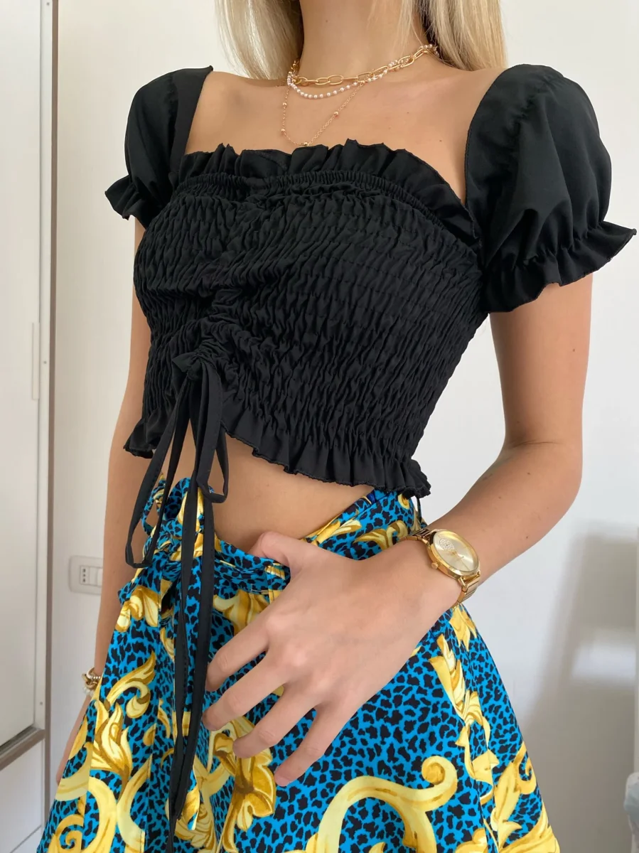 Top crop mano a corta con arricciature e manichina corta. Taglia unica