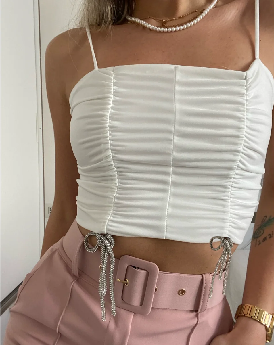 Delizioso top con drappeggio regolabile e fiocchetti ricoperti di strass