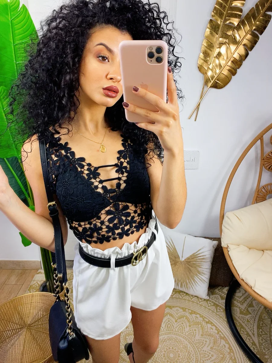 Top in pizzo a fiorellini con coppe e schiena semi aperta. Tessuto elasticizzato ma adatto comunque a taglie piccole