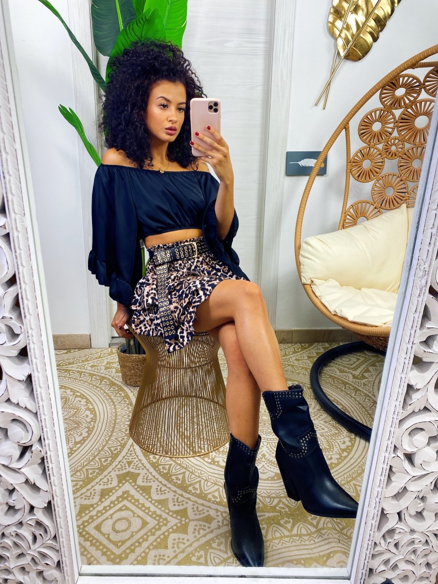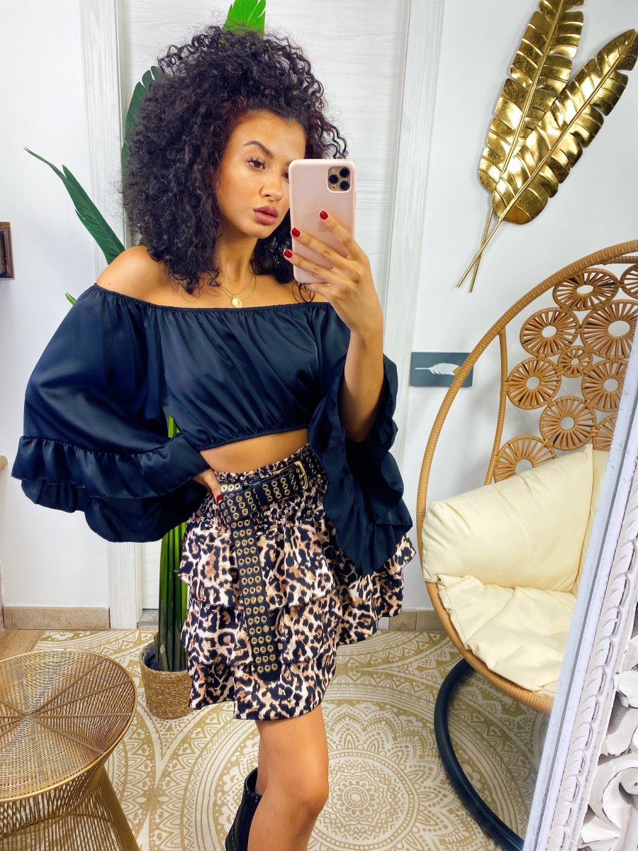 top in raso con scollo a barchetta e manica lunga semplice per i tuoi outfit ma essenziale abbinabile con una gonna come questa o un pantalone a vita alta.