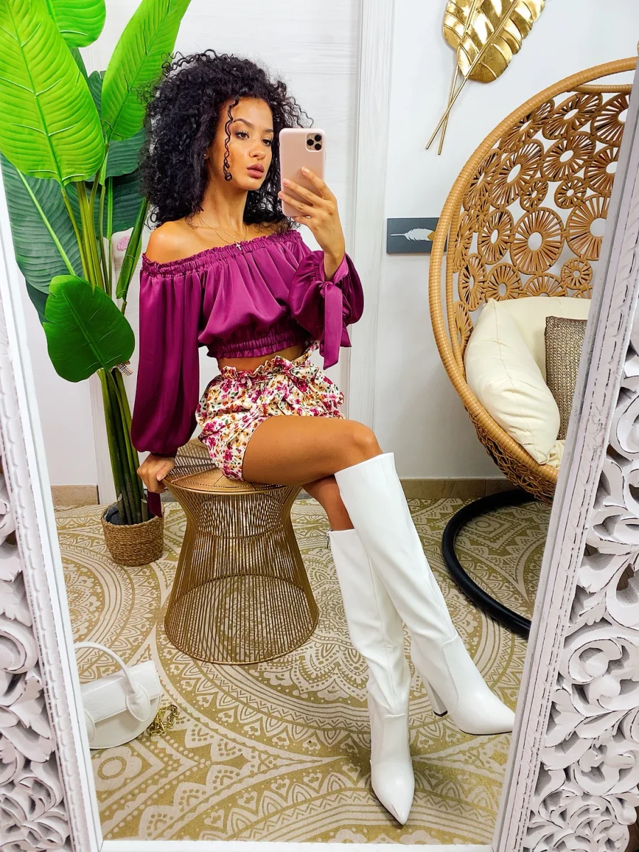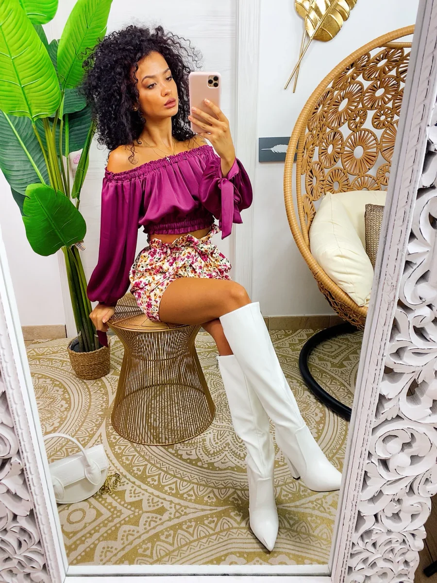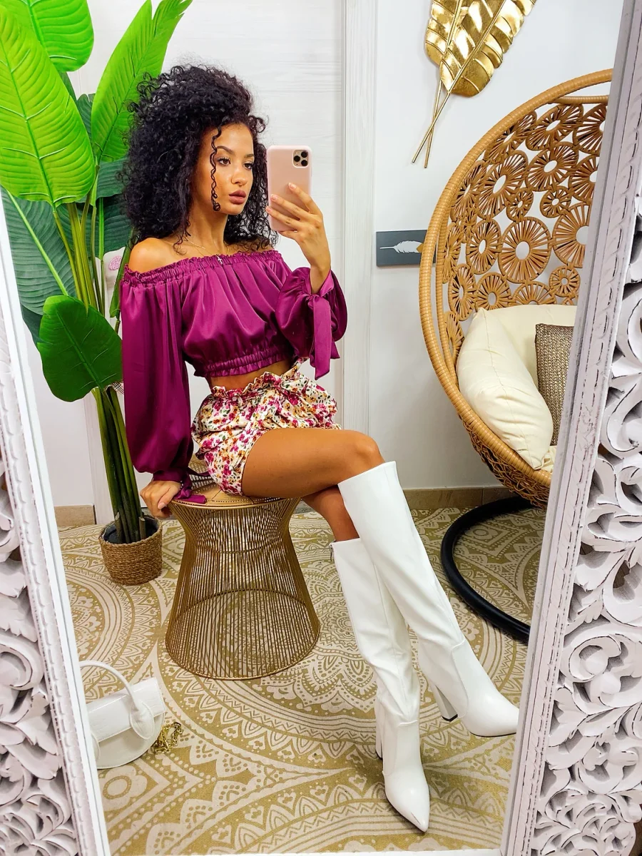top in raso con scollo a barchetta e manica lunga semplice per i tuoi outfit ma essenziale abbinabile con una gonna come questa o un pantalone a vita alta.