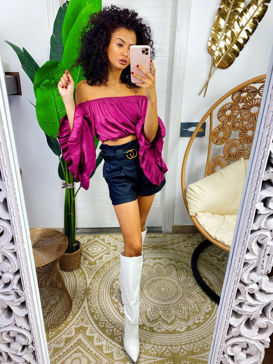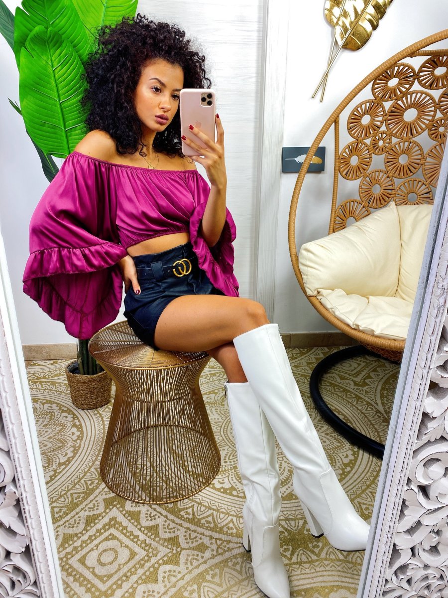 top in raso con scollo a barchetta e manica lunga semplice per i tuoi outfit ma essenziale abbinabile con una gonna come questa o un pantalone a vita alta.