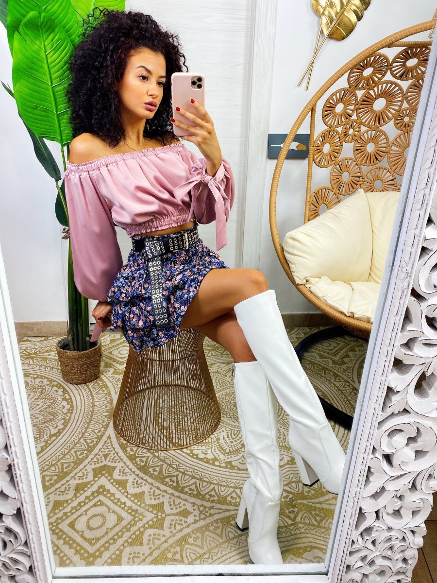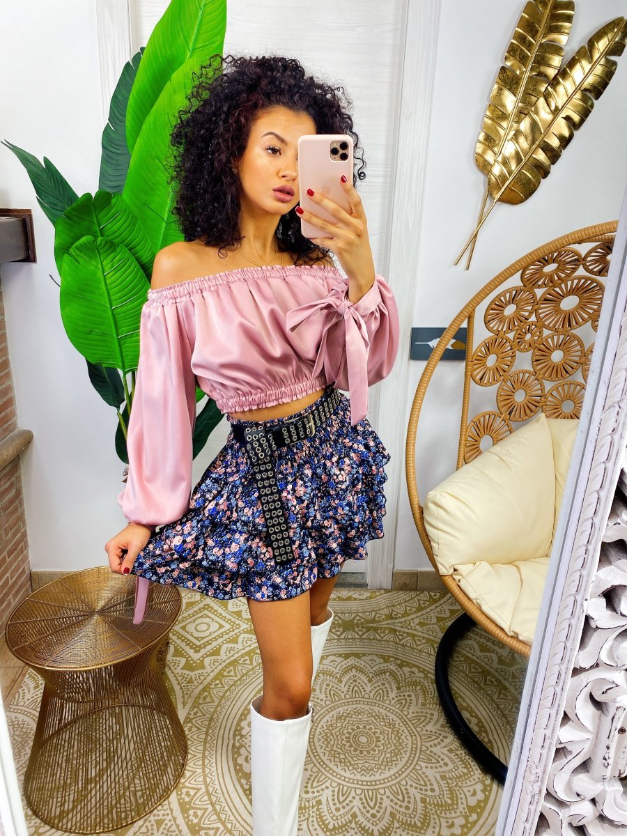top in raso con scollo a barchetta e manica lunga semplice per i tuoi outfit ma essenziale abbinabile con una gonna come questa o un pantalone a vita alta.