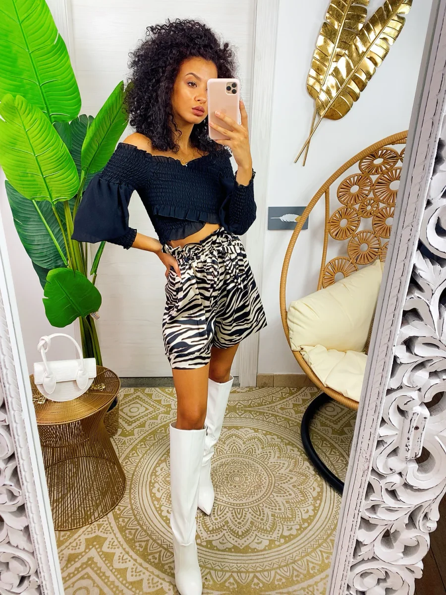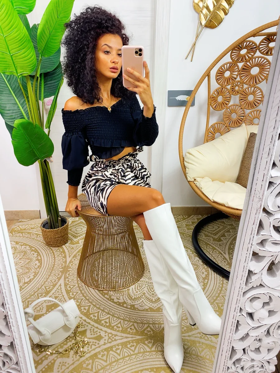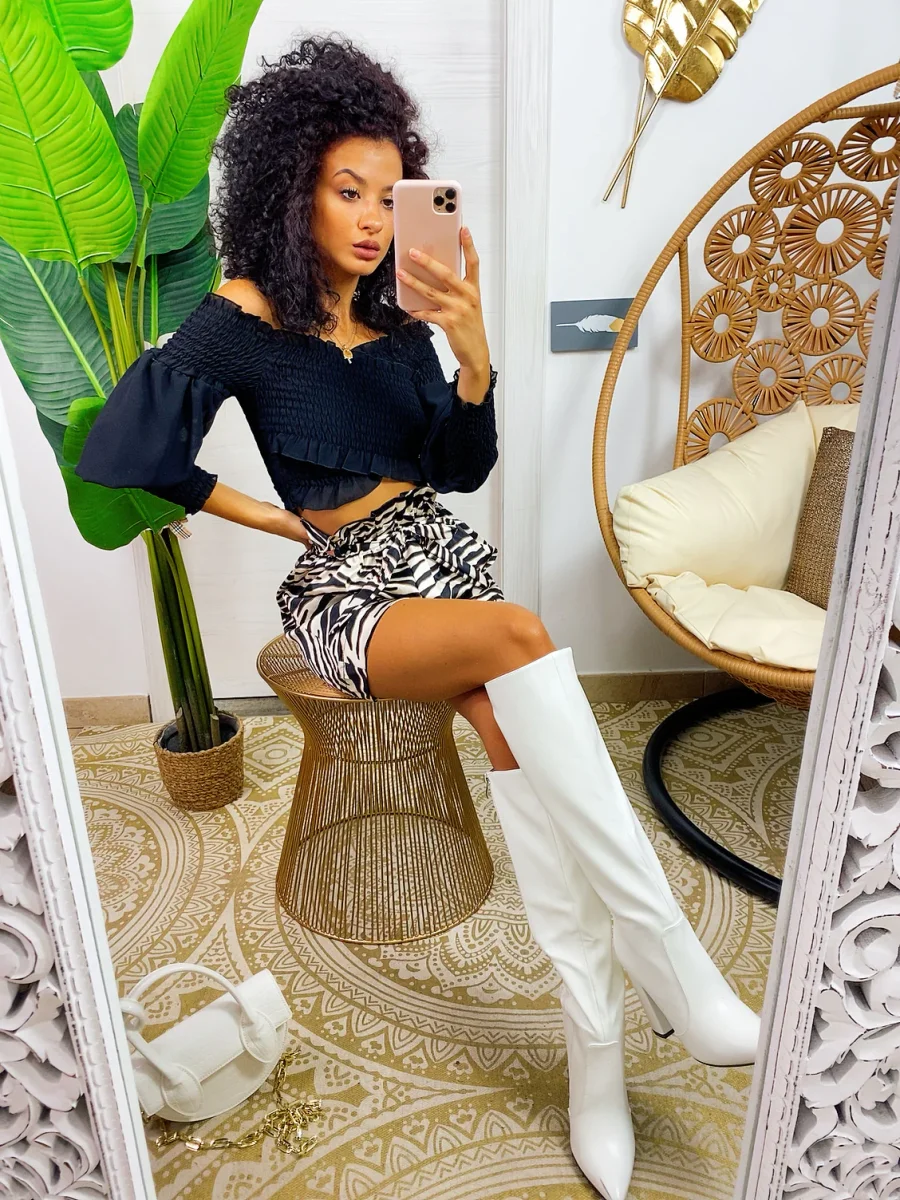 top con scollo a barchetta e manica lunga semplice per i tuoi outfit ma essenziale abbinabile con una gonna come questa o un pantalone a vita alta.