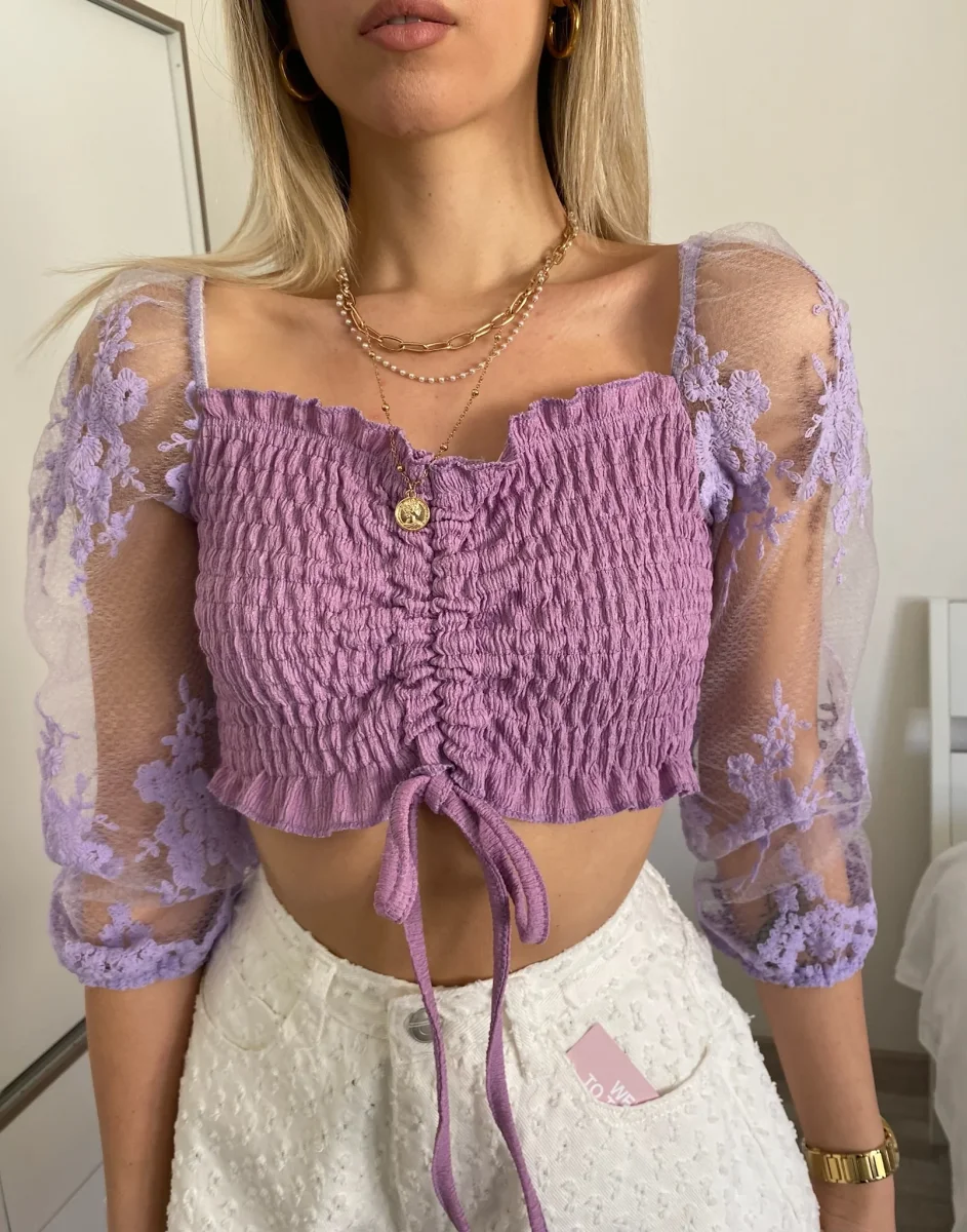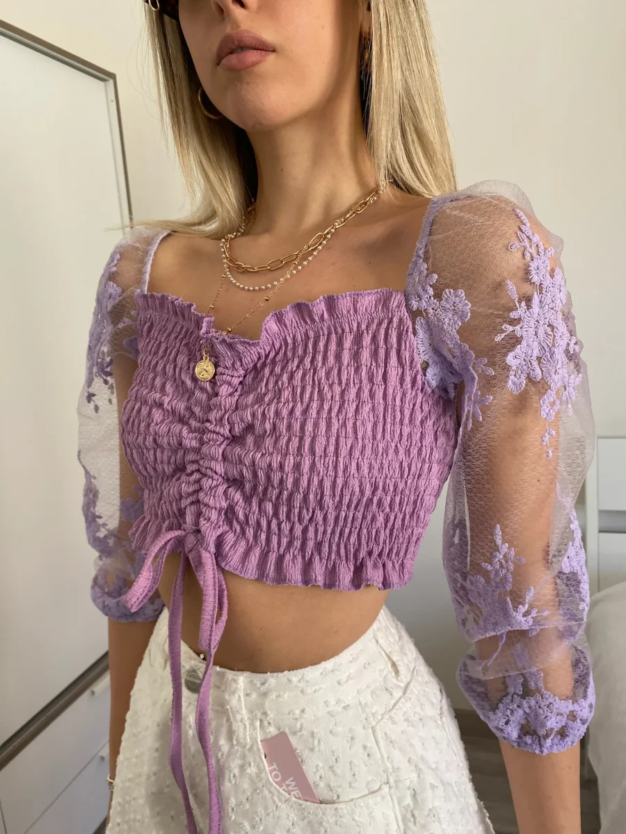 Top nero con maniche velate e ricami a fiori arricciatura sul davanti. Taglia unica