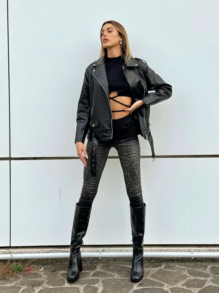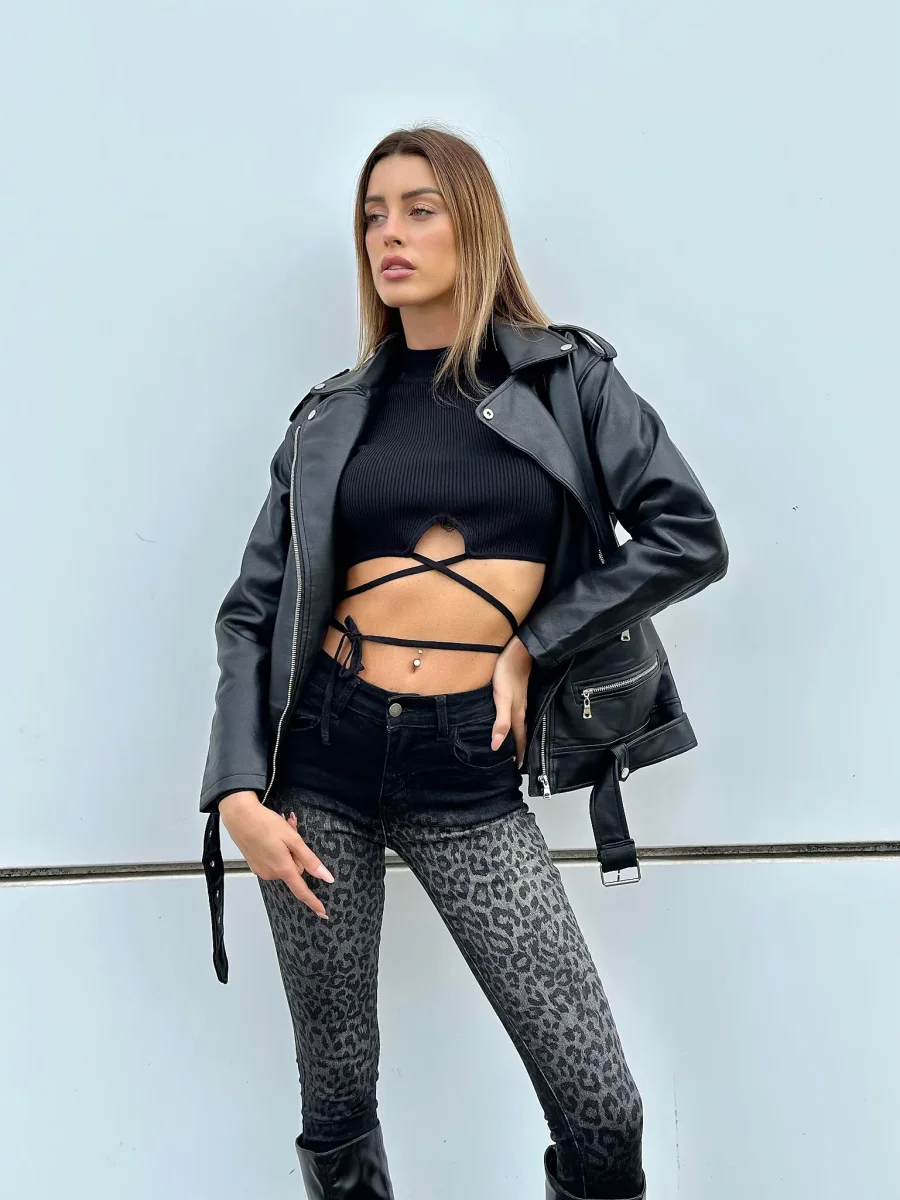 Top a costine manica lunga con incrocio regolabile sotto il seno. Collo leggermente alto. Tessuto molto elasticizzato