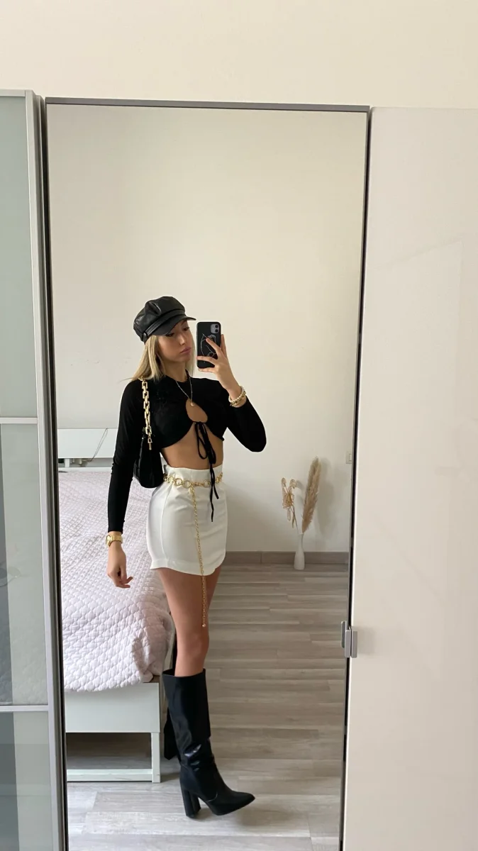 Top nero in tessuto liscio elasticizzato arricciatura sul davanti e chiusura con lacciò regolabile