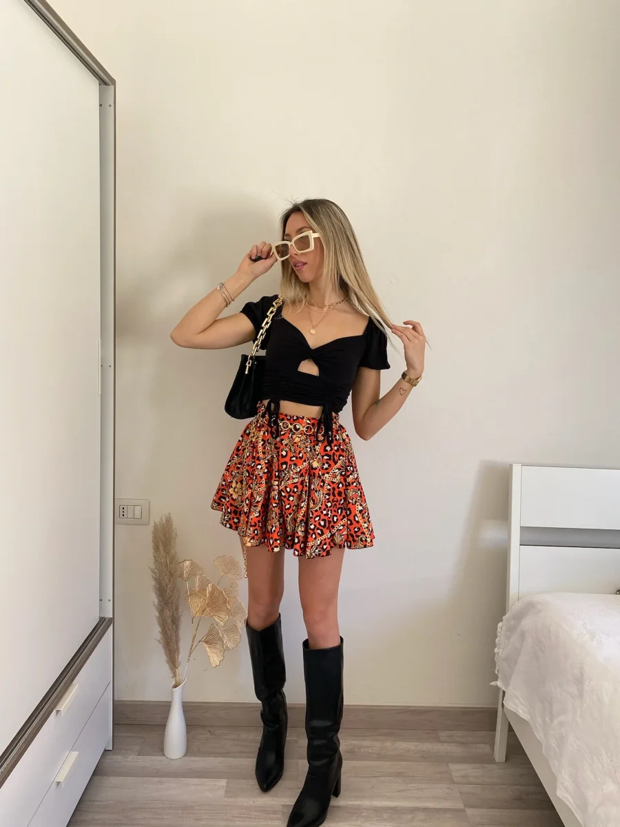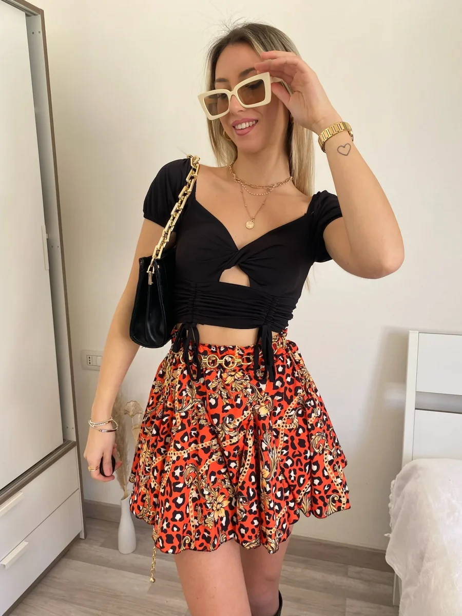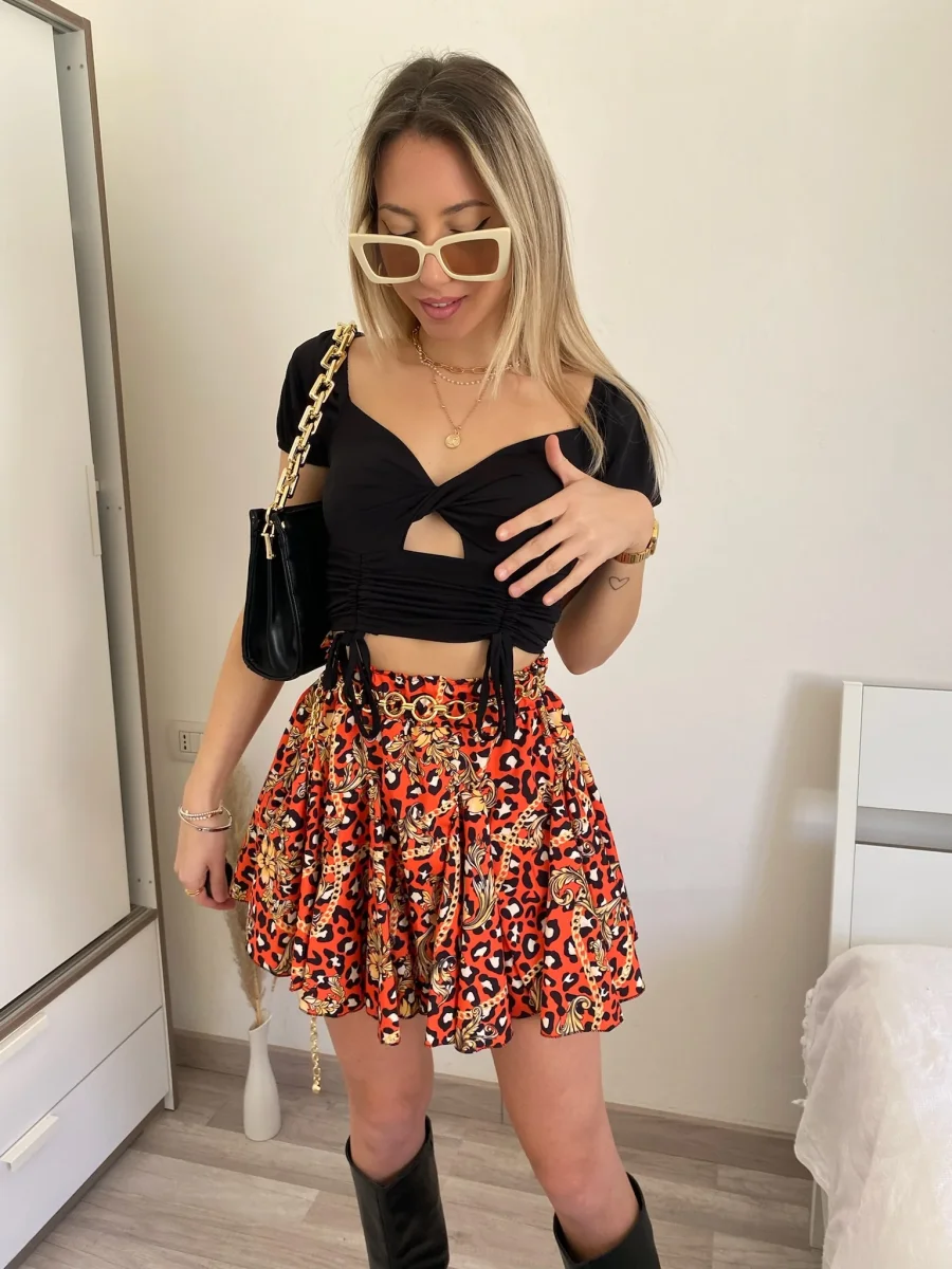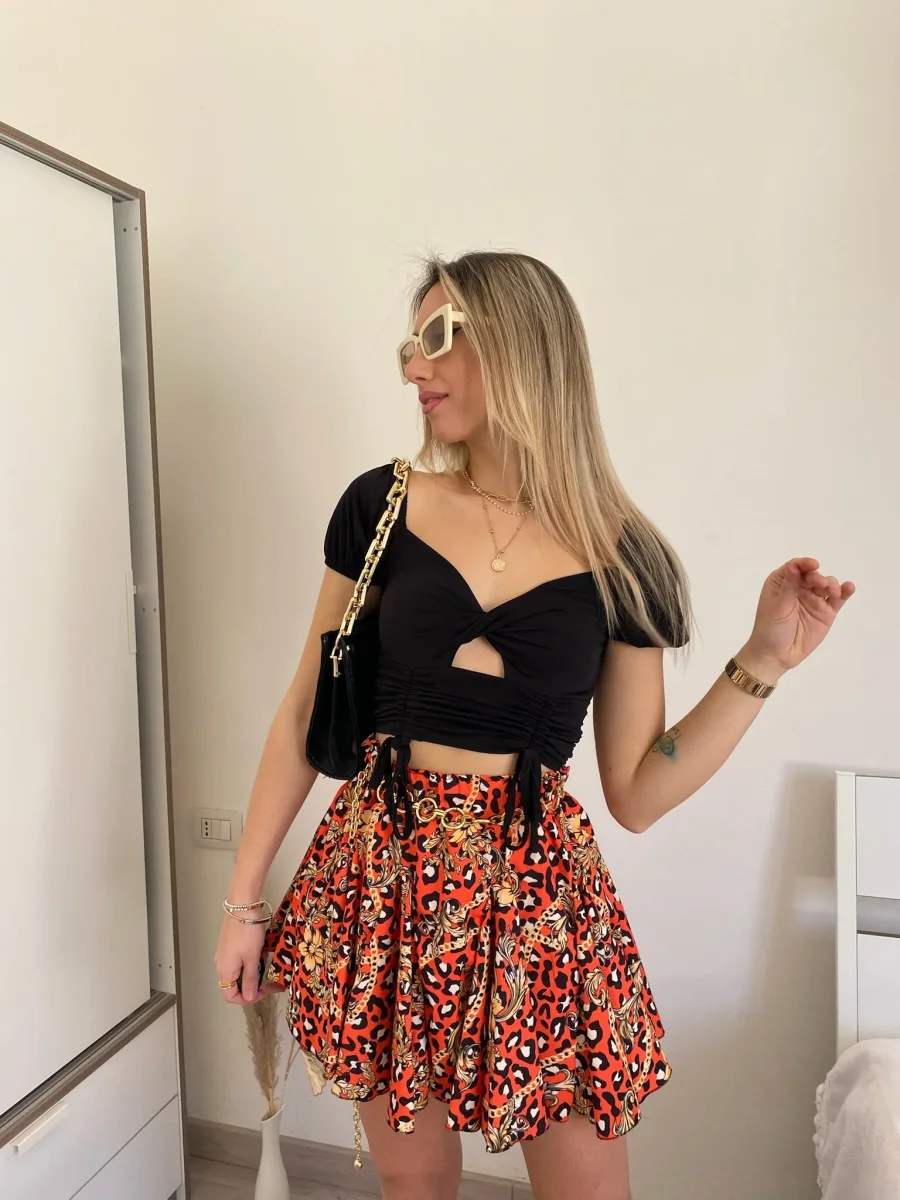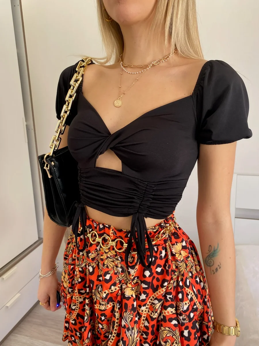 Top a costine a manica corta nero, con lacci sul davanti e incrocio. Modello crop.