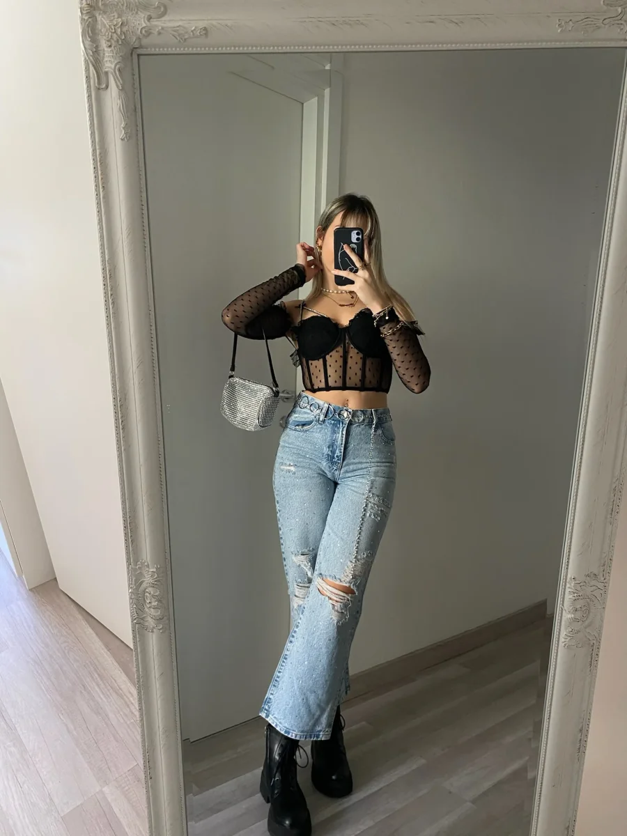 Bustino nero in velo con chiusura con gancetti, coppe e dettagli strass e fiocchi.