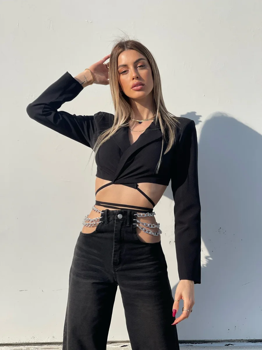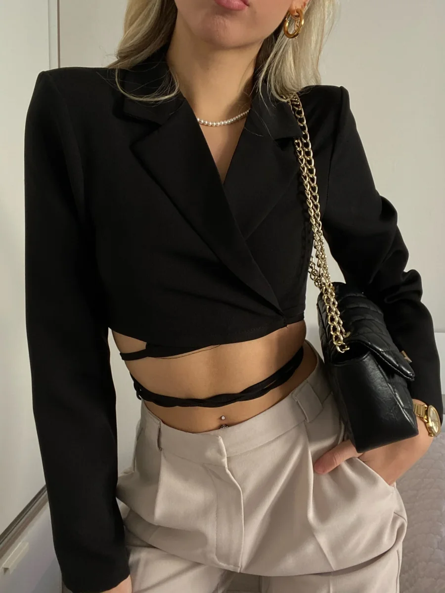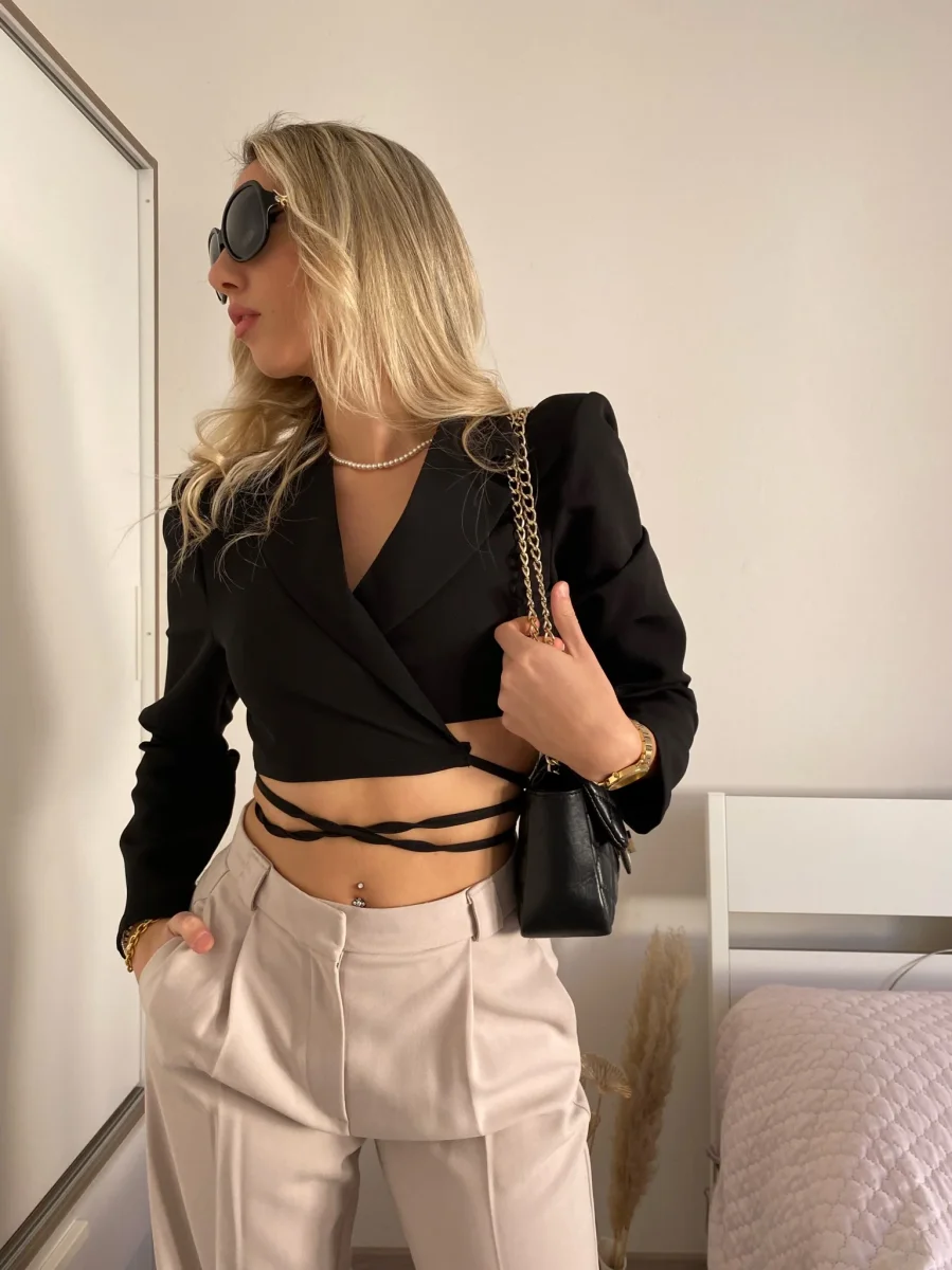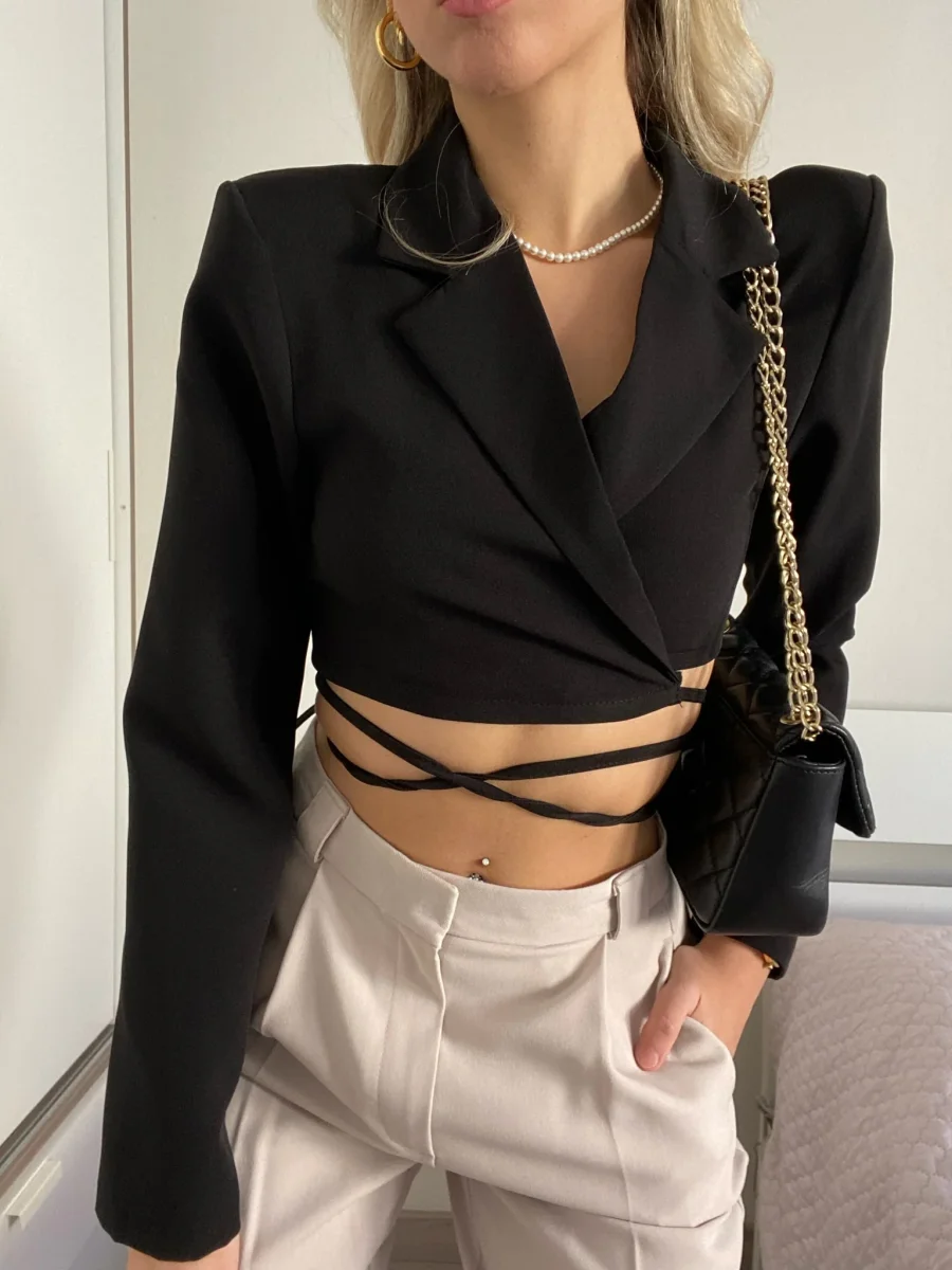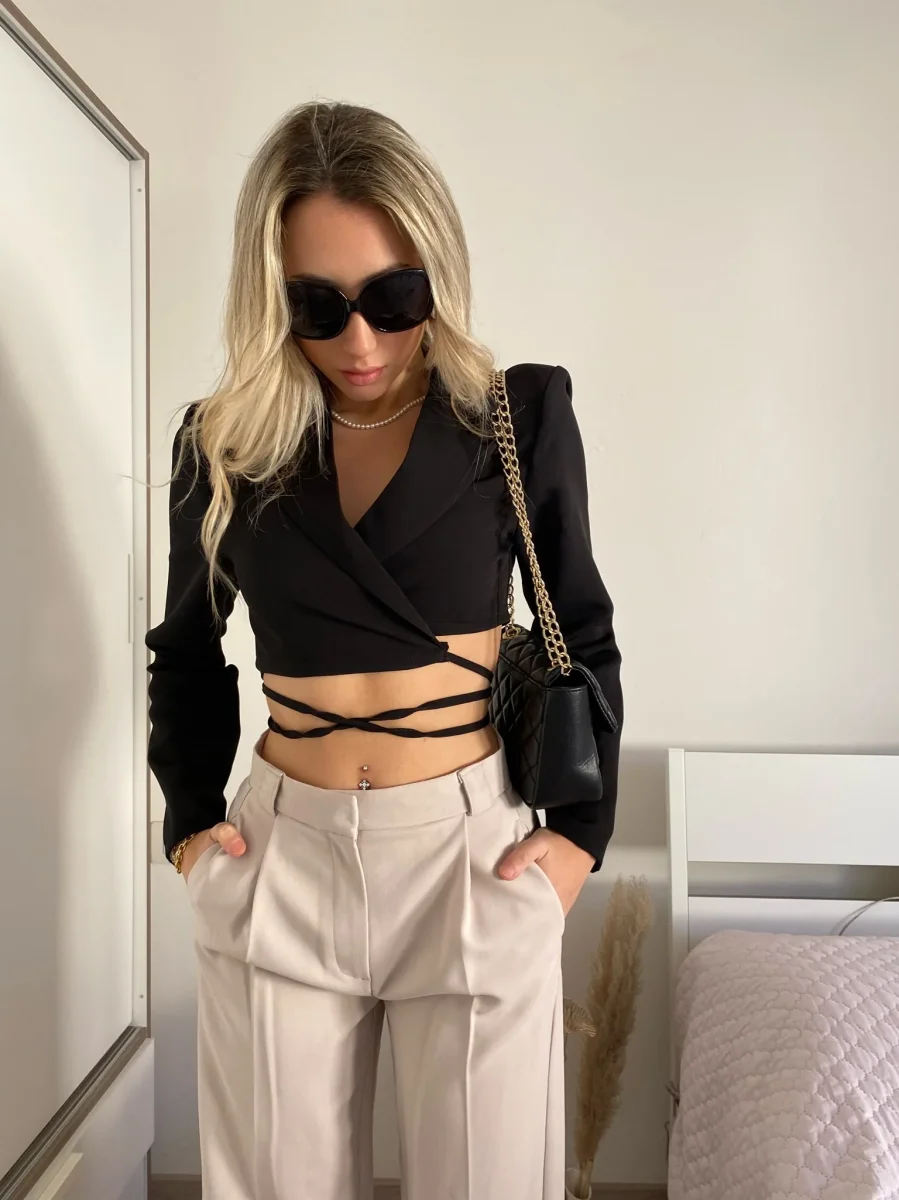 Top nero semplice e raffinato. Con spalline e chiusura regolabile dai lacci