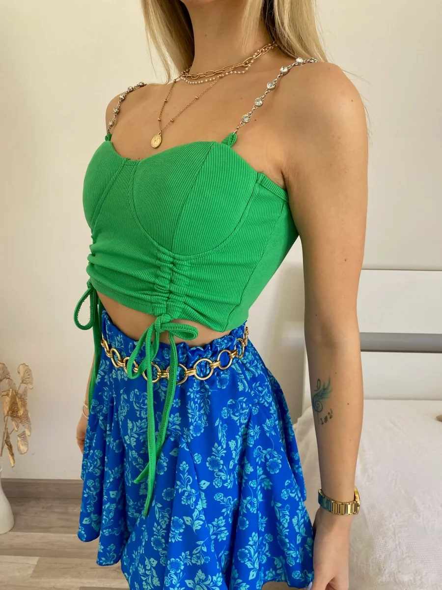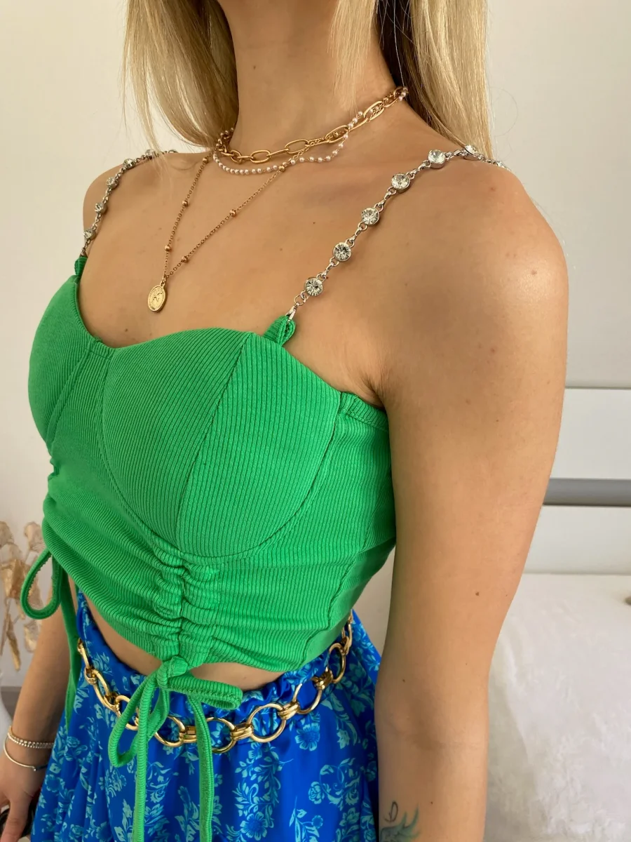 Top a costine con coppe e arricciatura regolabile. Spalline in strass.