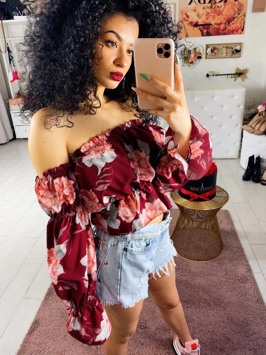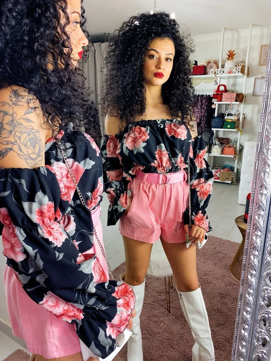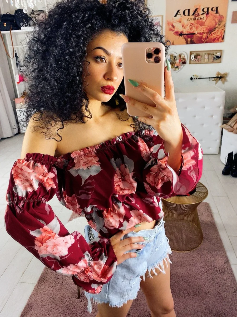 Top a manica lunga con scollo a barchetta e stampa a fiori. Tessuto elasticizzato leggero