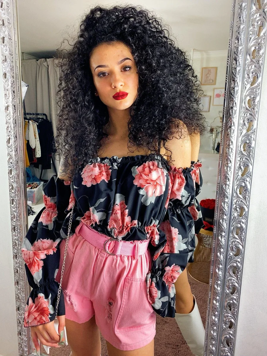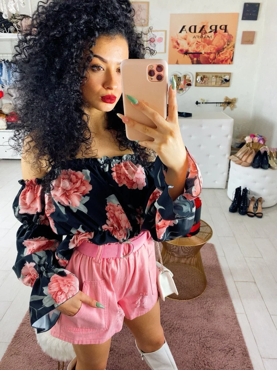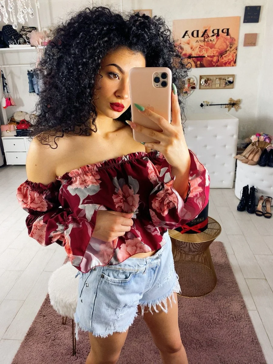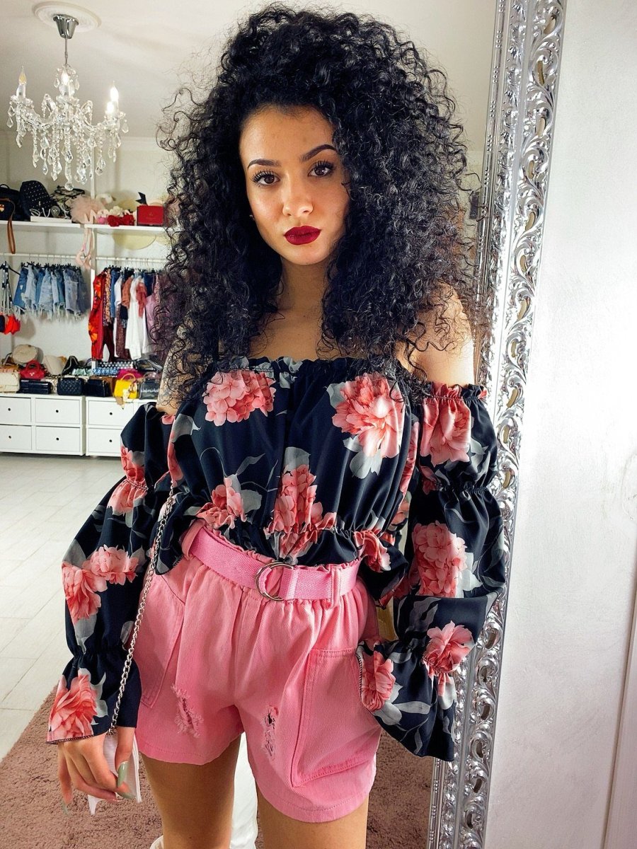 Top a manica lunga con scollo a barchetta e stampa a fiori. Tessuto elasticizzato leggero